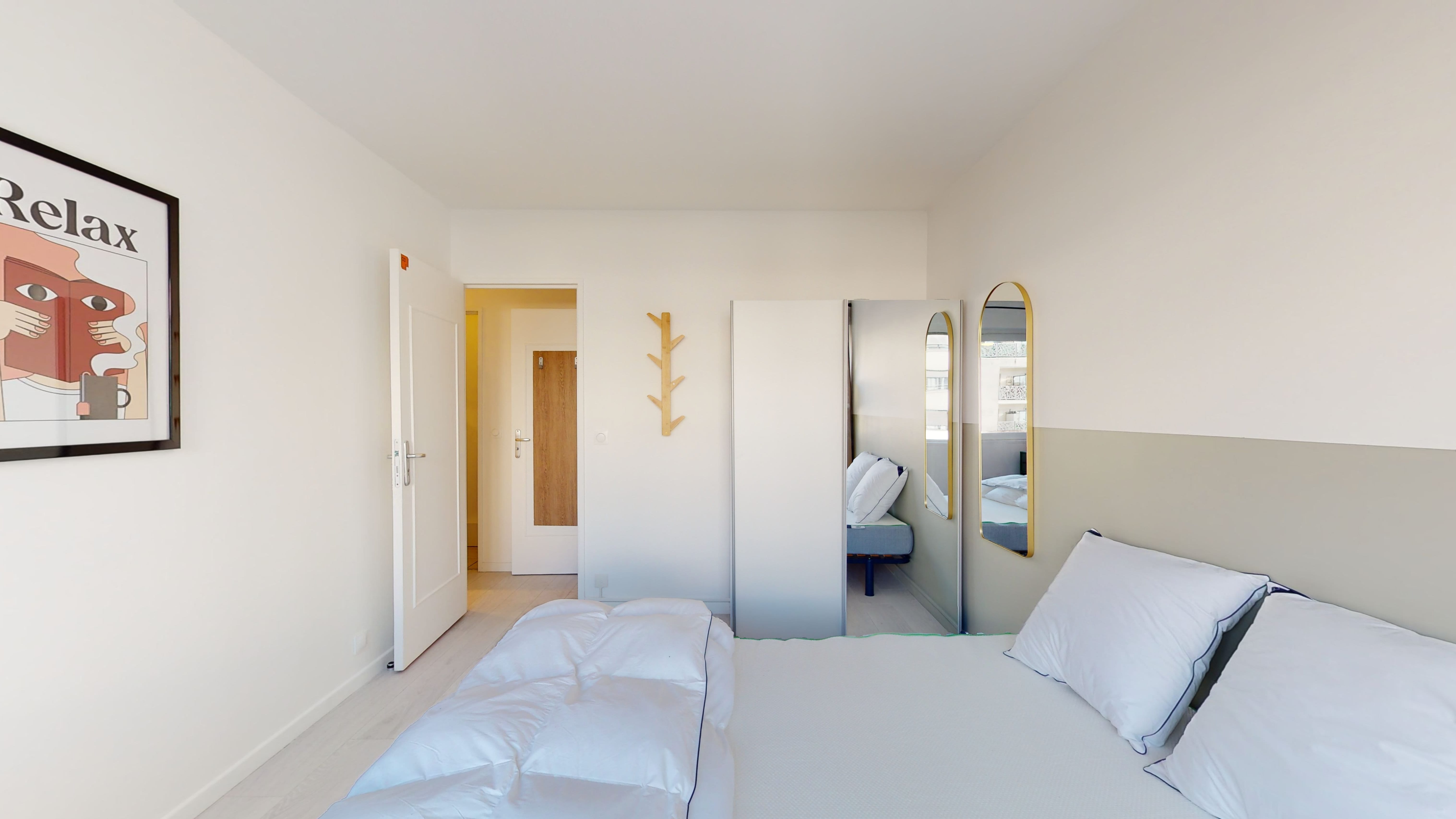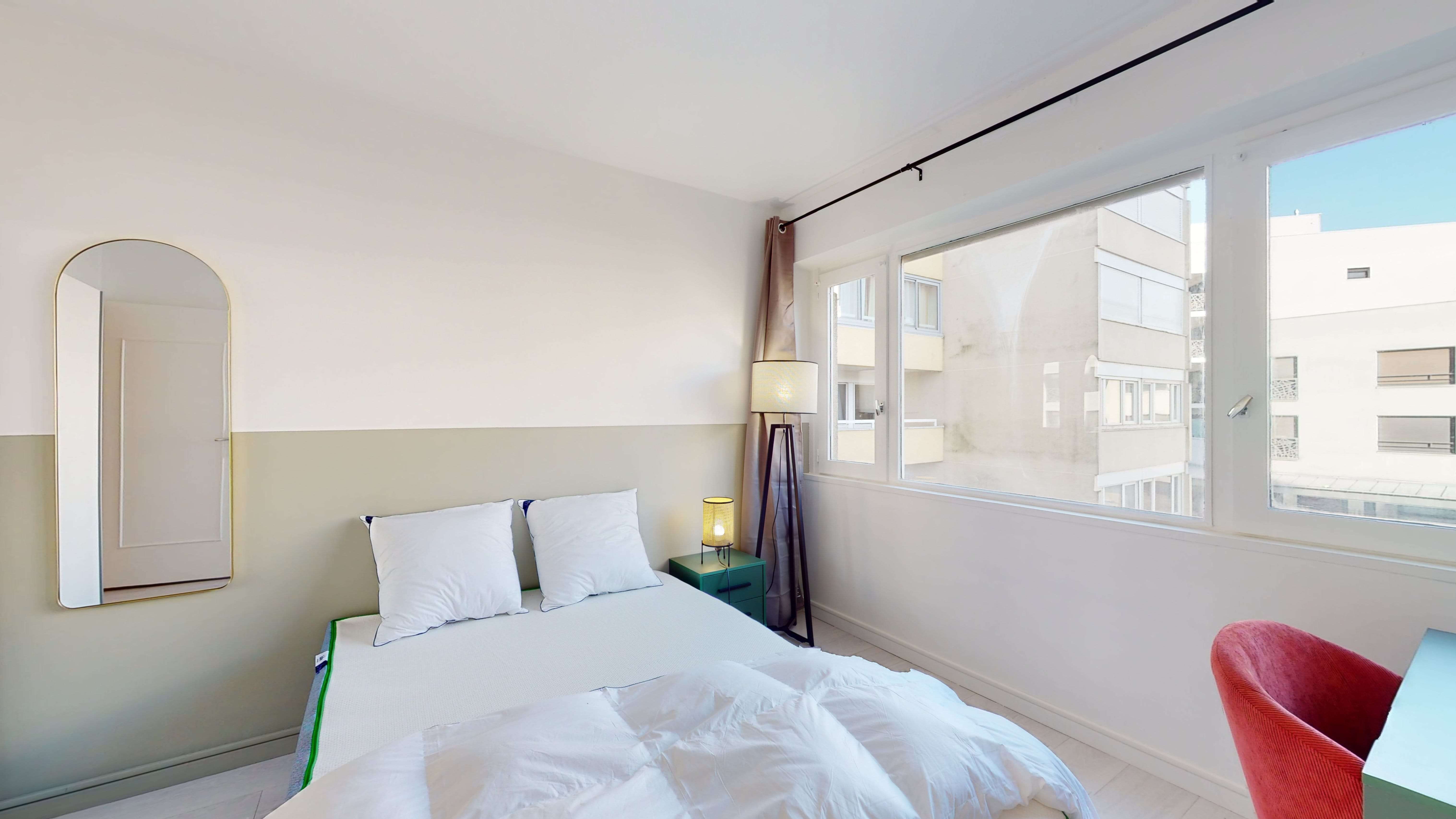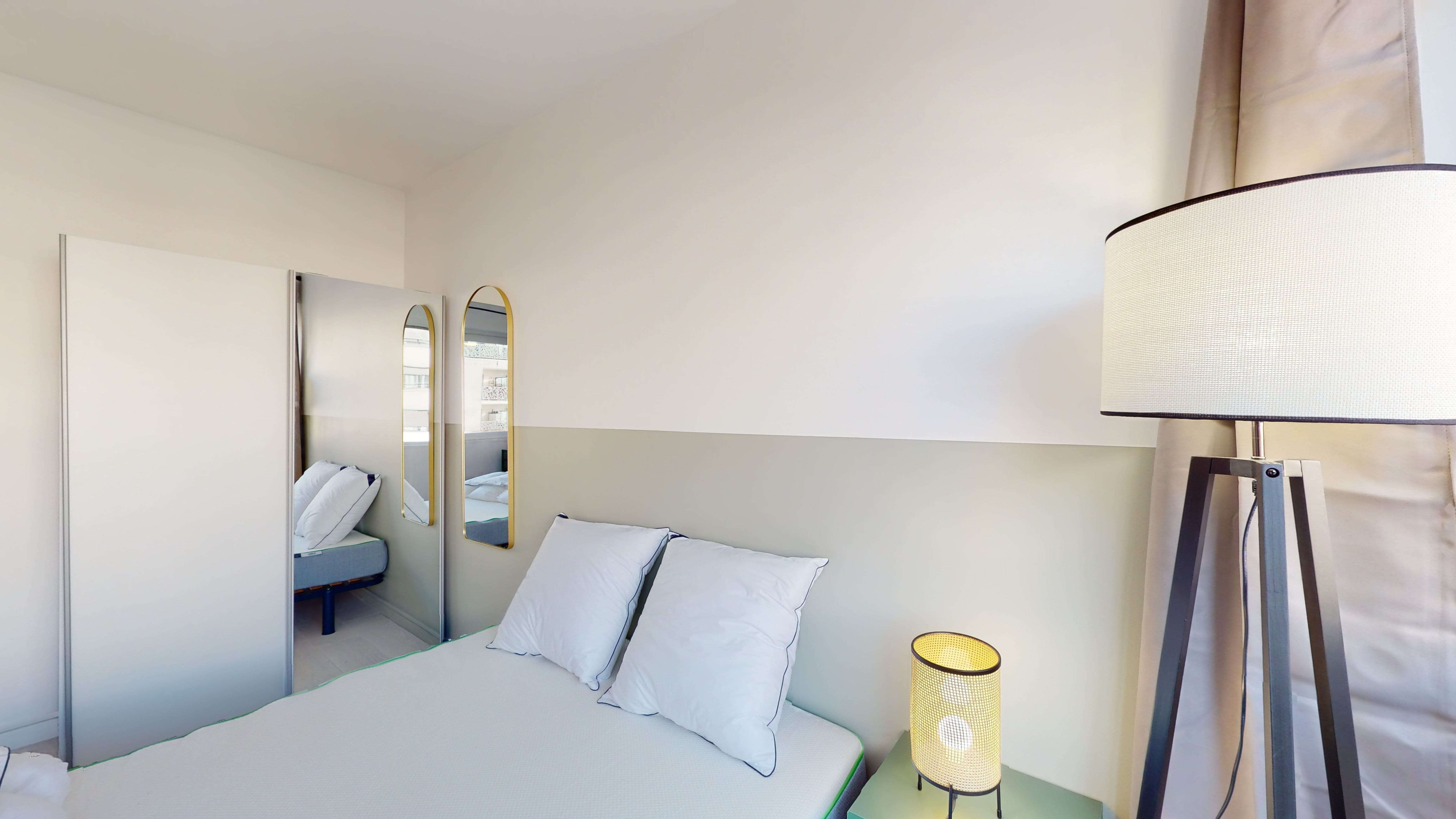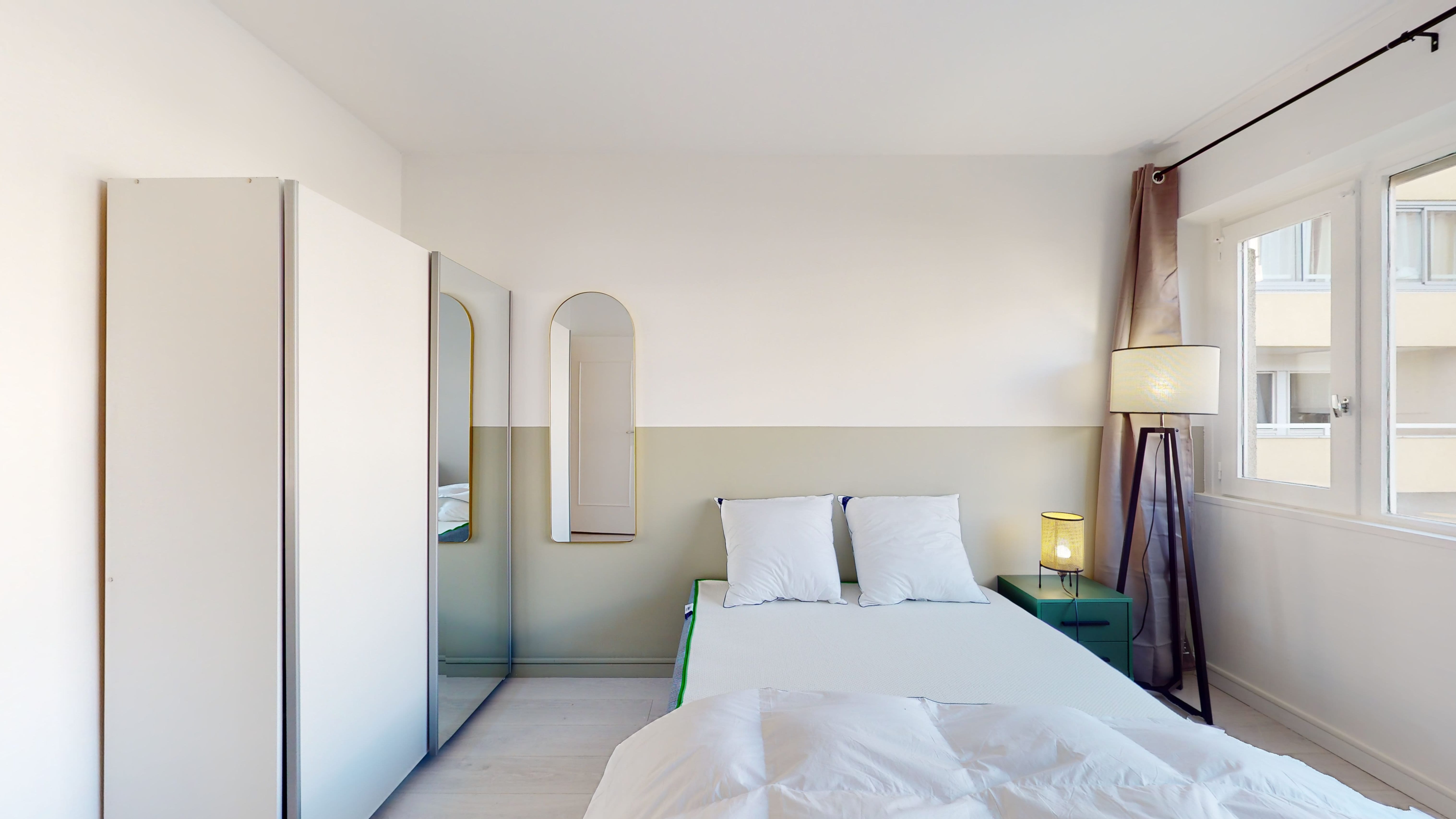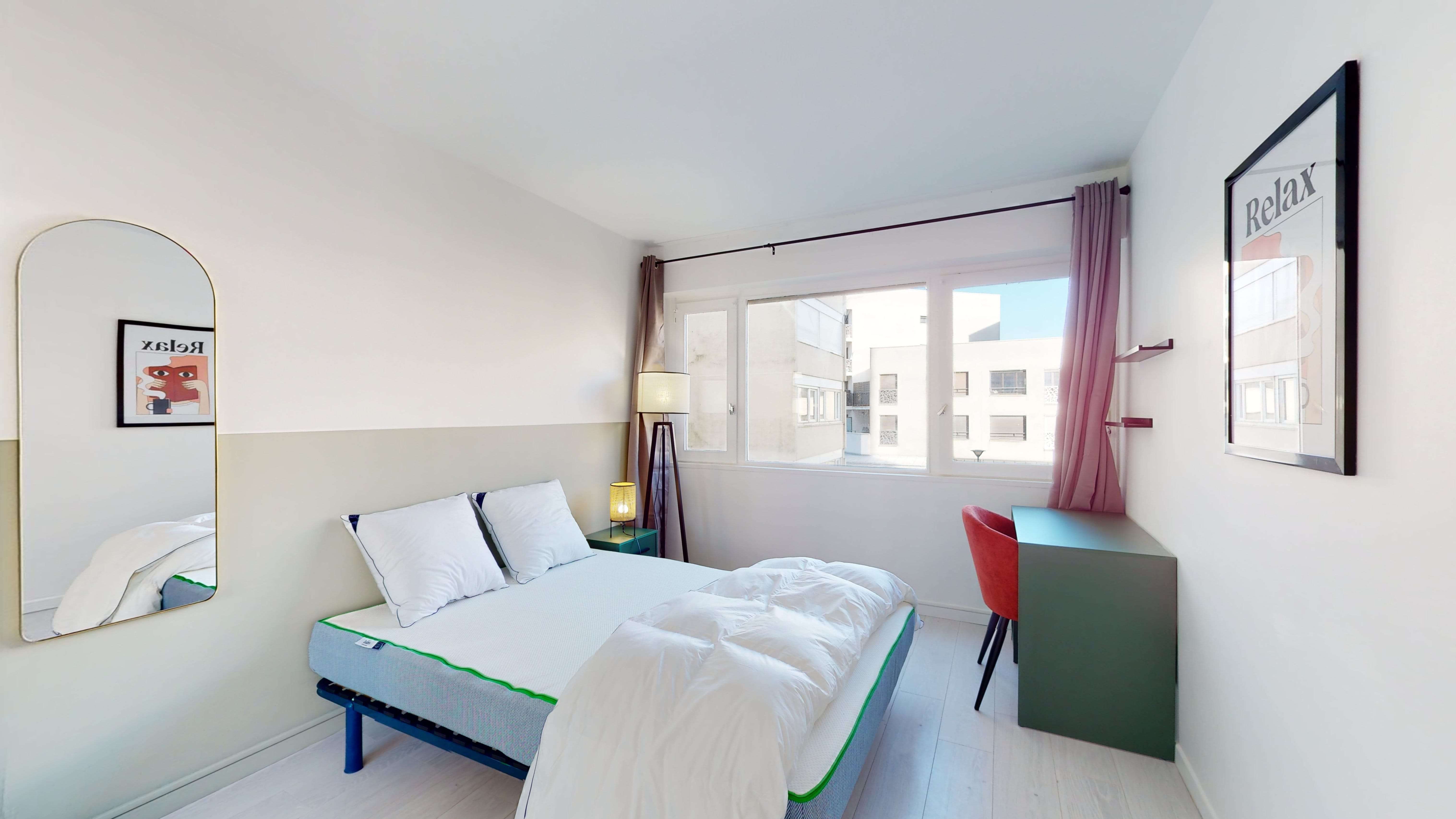La chambre Room 1, de 10 m², est parfaite pour une personne. Elle est meublée d'un lit double confortable, d'une armoire pour vos affaires, d'une chaise et d'un bureau pour travailler ou étudier. Cette chambre partage une salle de bain bien équipée avec d'autres colocataires.