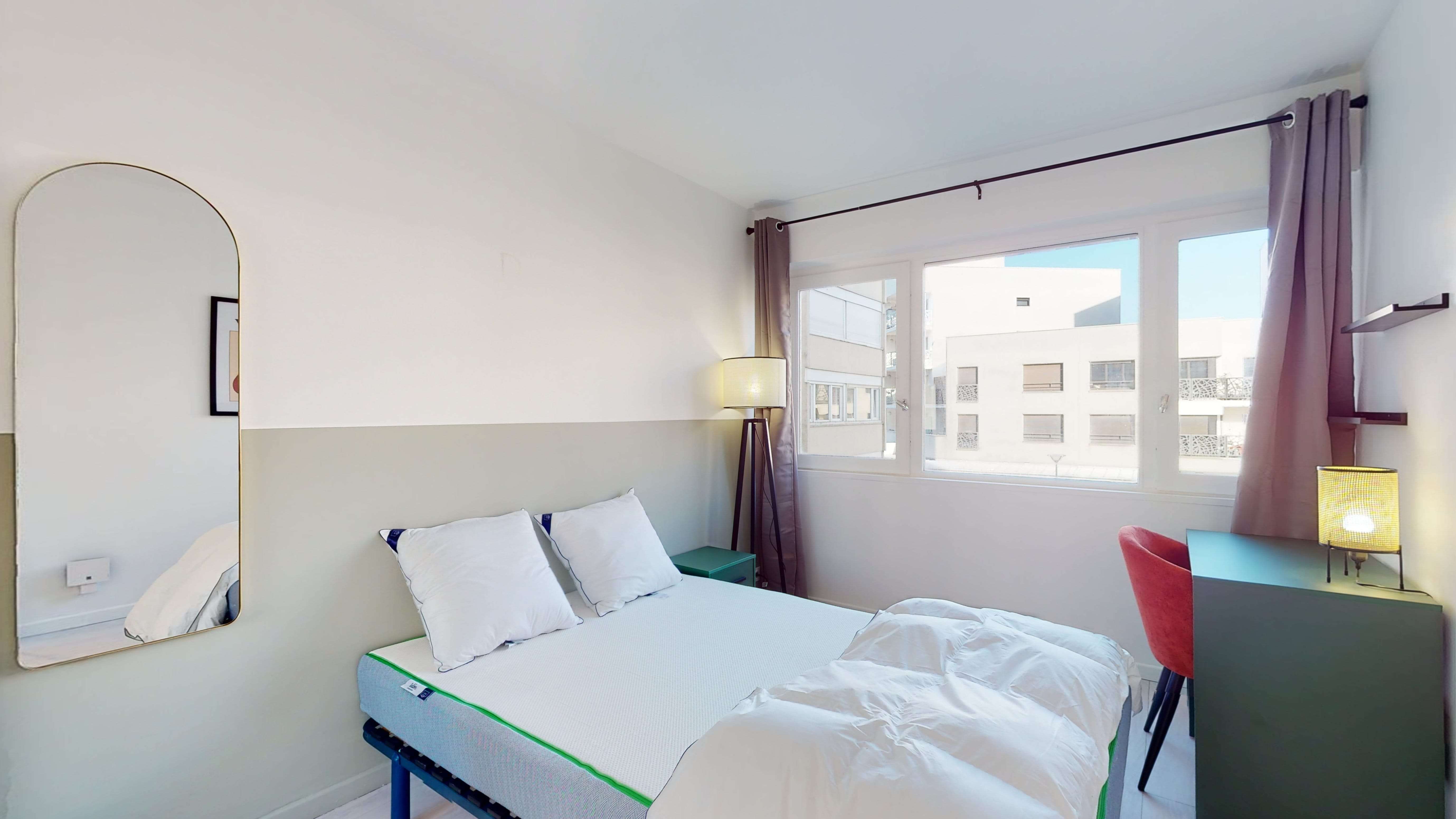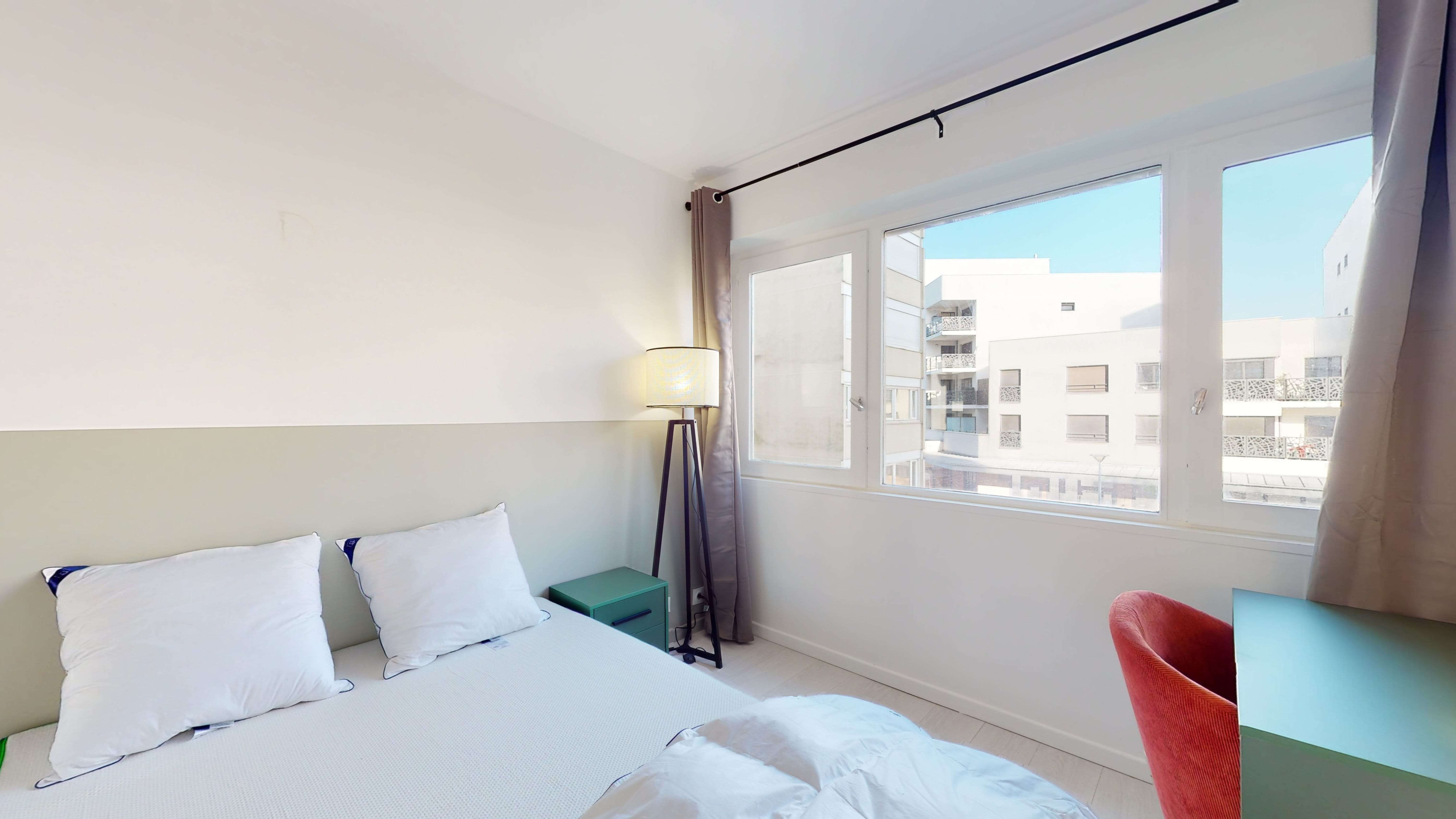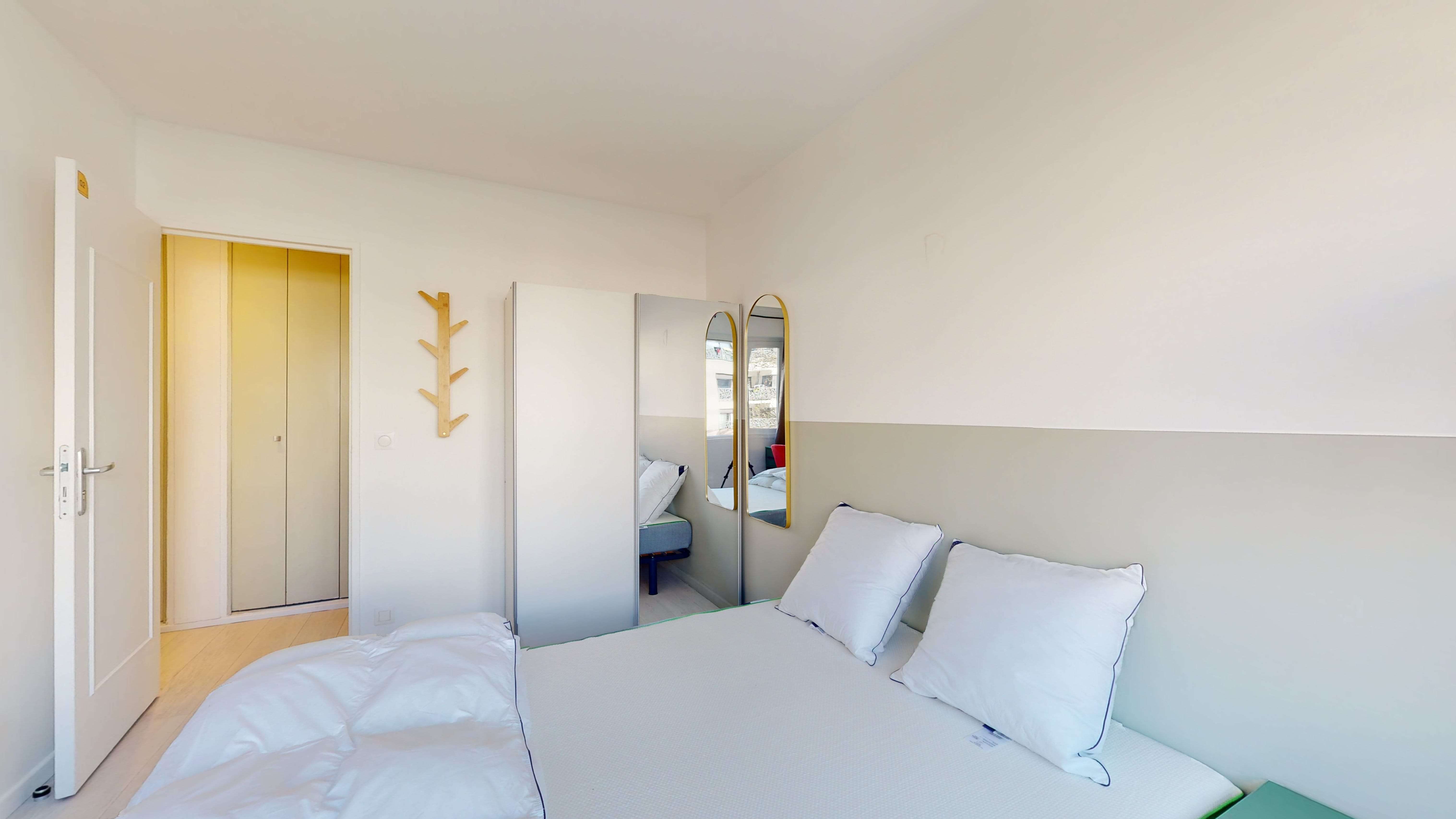 La chambre Room 2 est un vrai petit nid douillet de 10m² conçu pour une personne. Elle est meublée d'un lit double confortable, d'une armoire pour vos affaires, d'un bureau et d'une chaise pour travailler ou étudier. La salle de bain est partagée avec les autres locataires et est équipée d'une douche où vous pourrez vous rafraîchir après une longue journée.