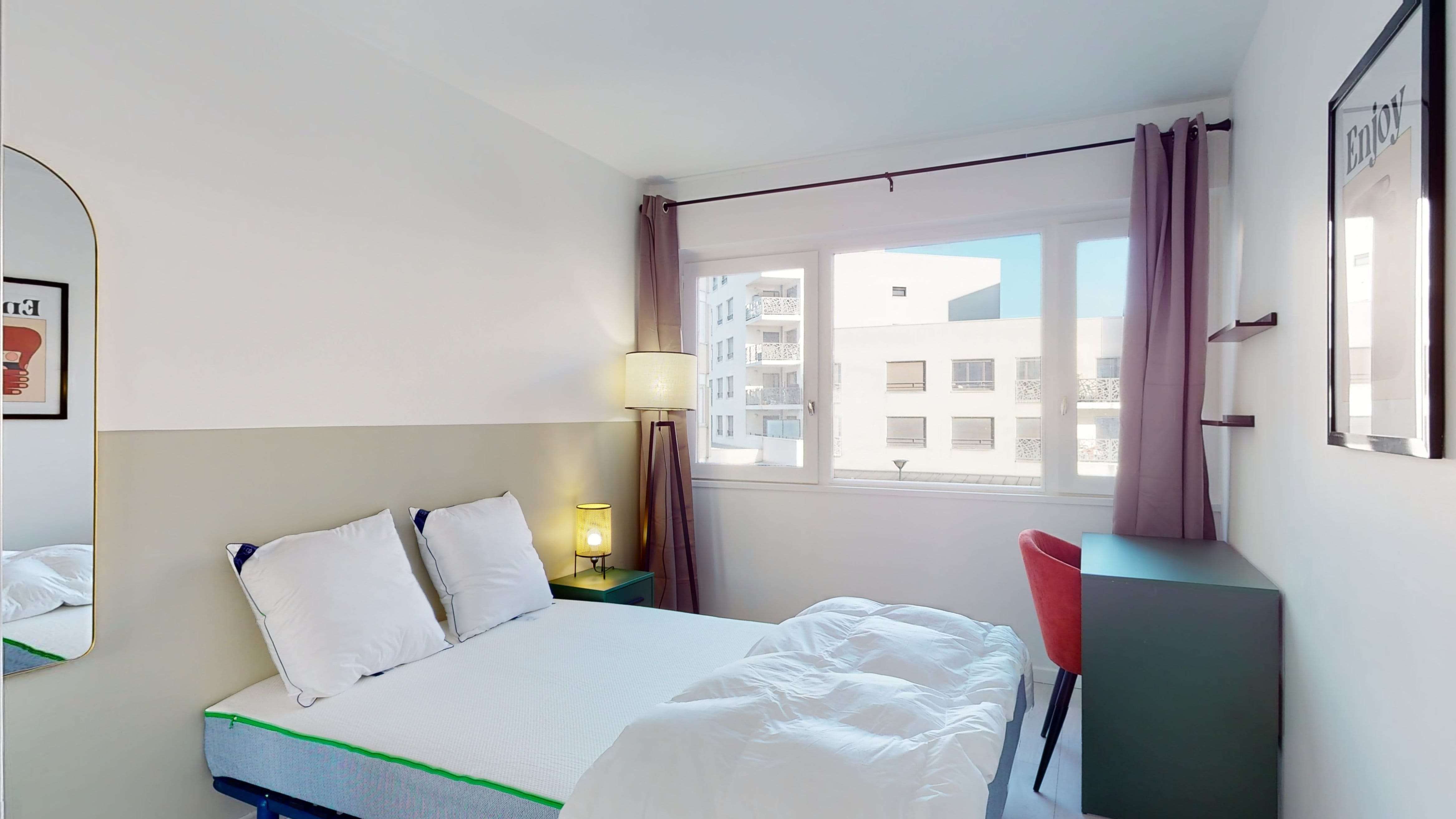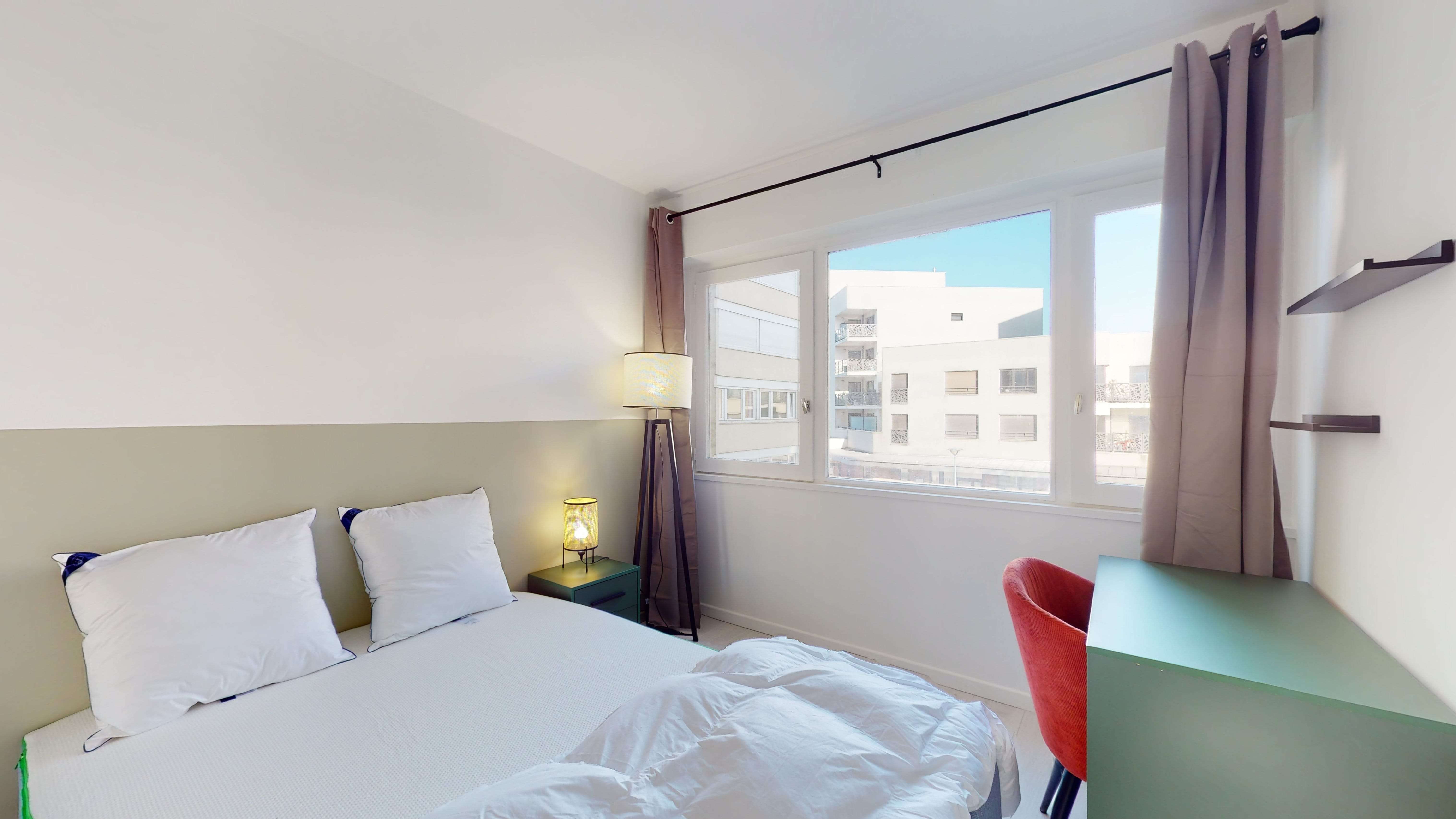 Votre chambre, Room 3, est un espace juste pour vous. Avec ses 11 m², elle offre un lit double confortable, une armoire pour vos vêtements, un bureau pour travailler et une chaise. Vous partagerez une salle de bain moderne avec d'autres locataires.