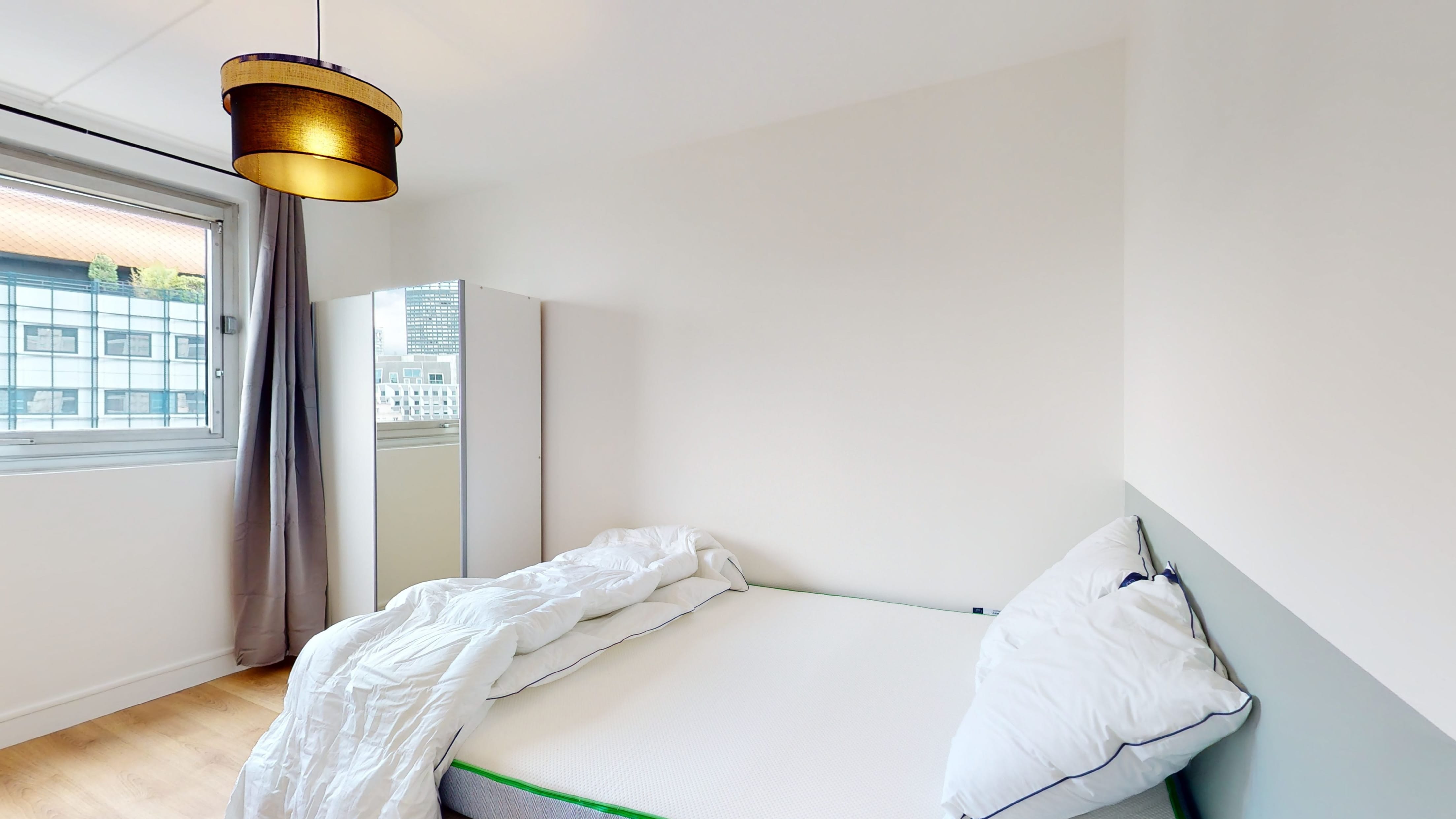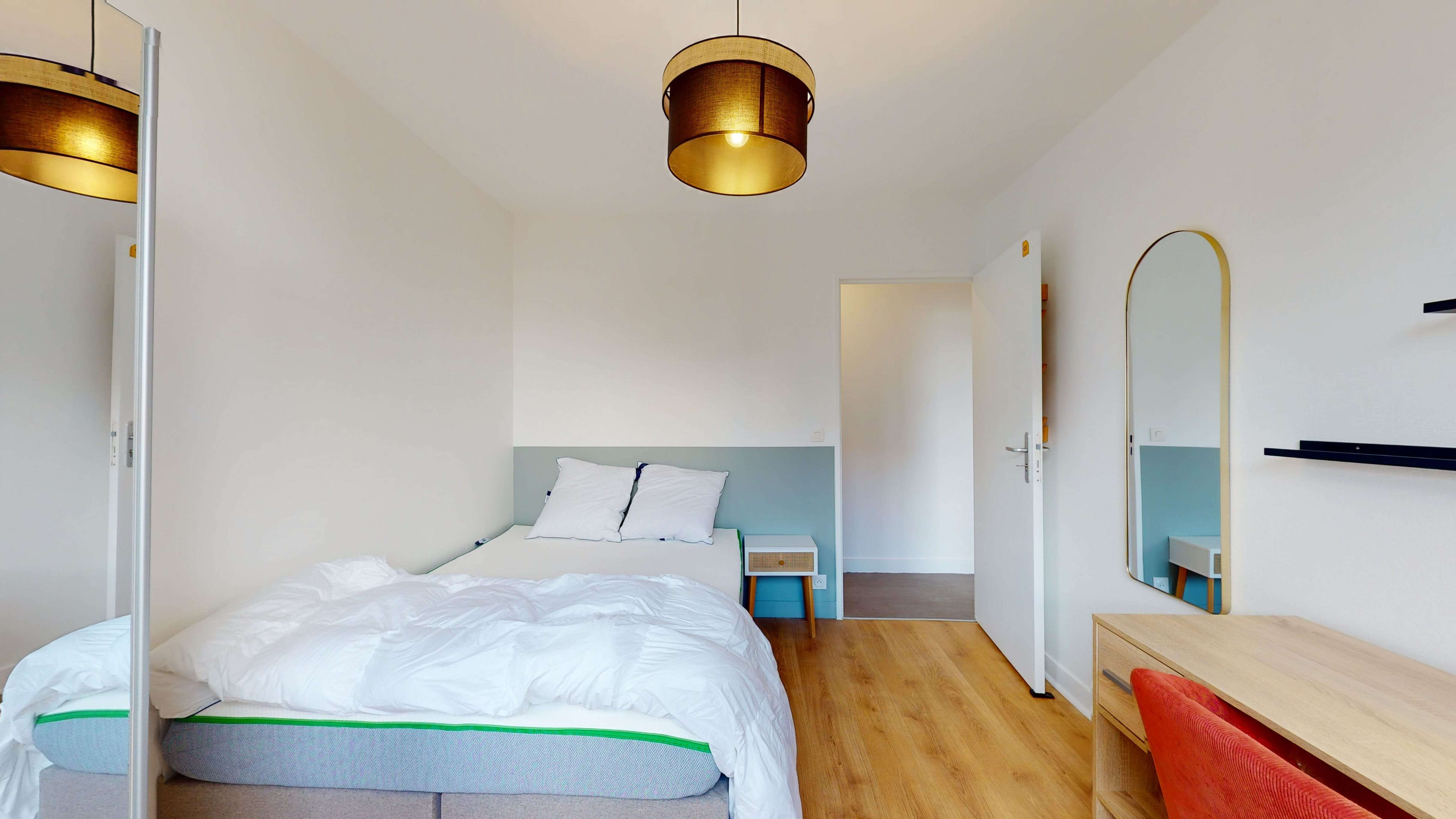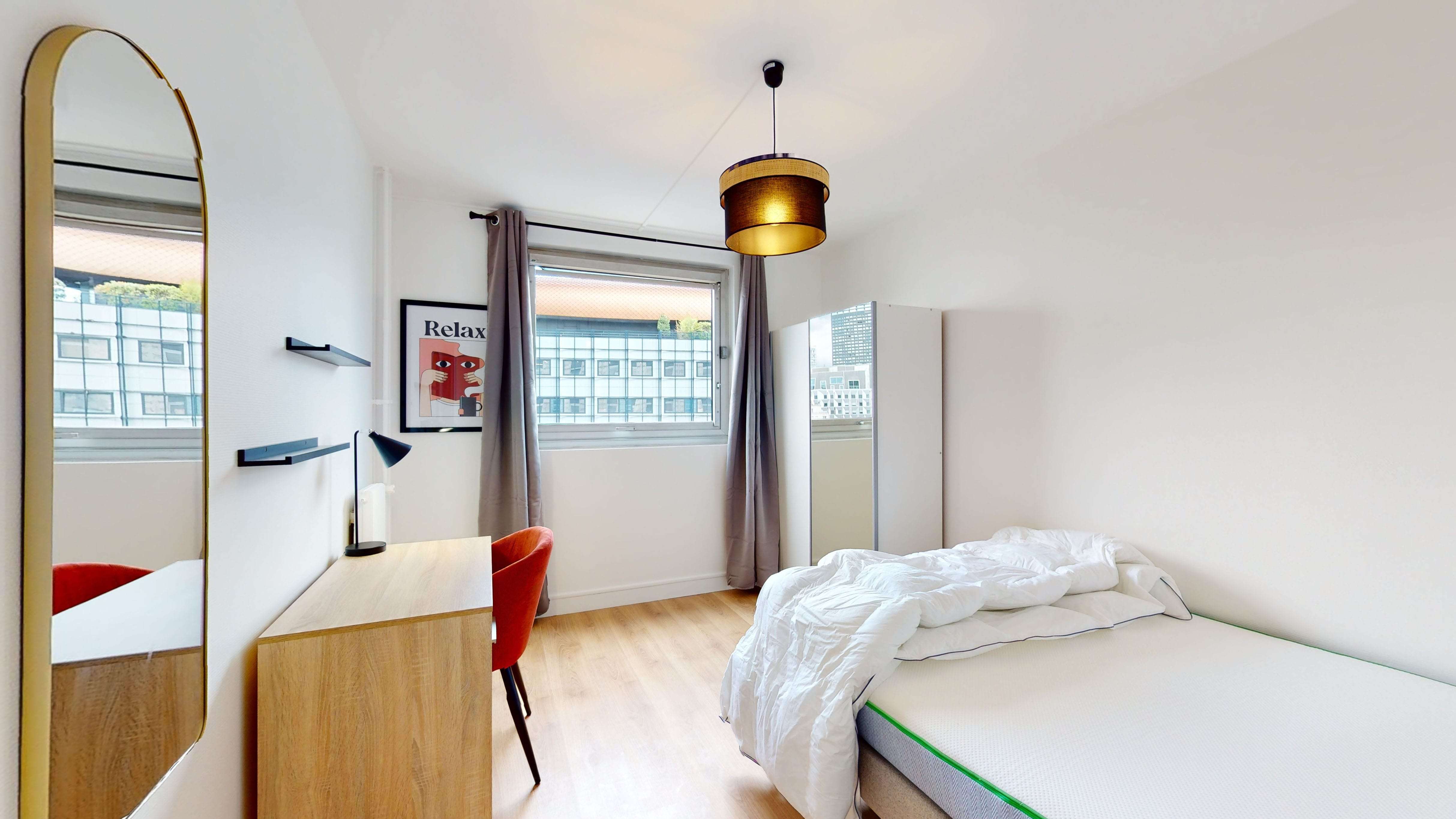 Room 2 est une chambre douillette de 11 m², parfaite pour une personne. Elle est meublée d'un lit double confortable, d'une armoire pour vos affaires, d'une chaise et d'un bureau pour travailler ou étudier. Cette chambre partage une salle de bain propre et moderne avec d'autres locataires.