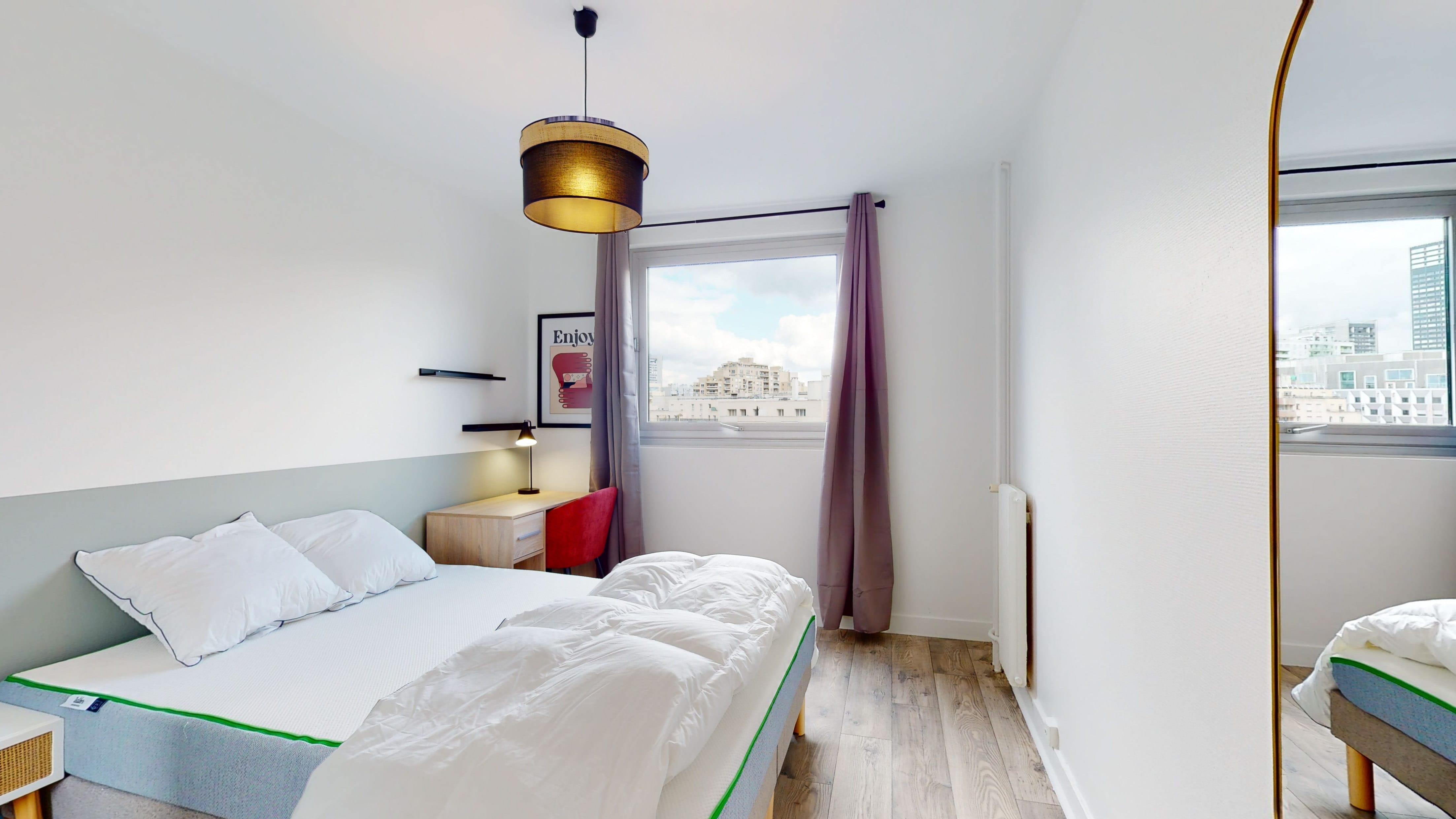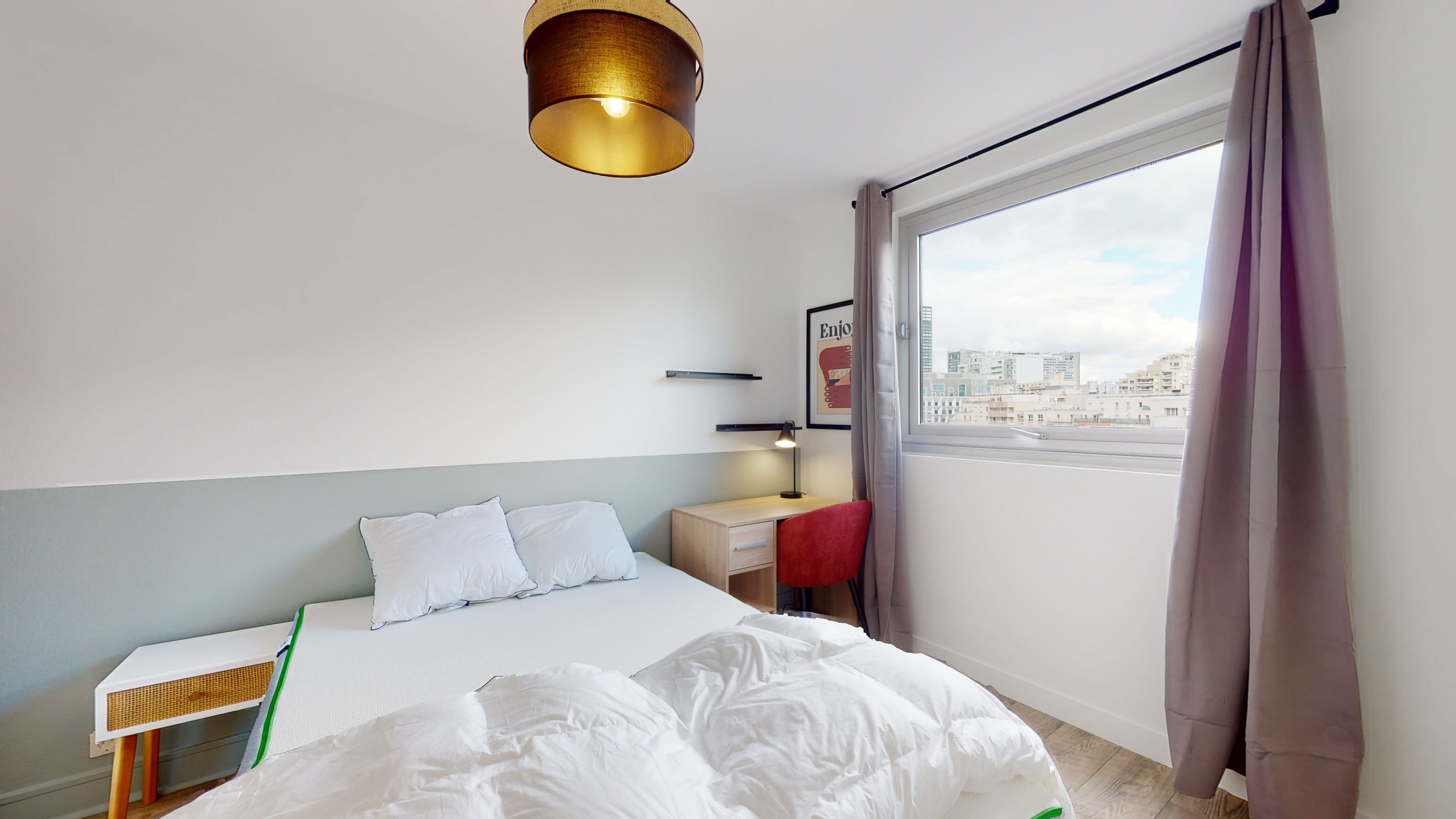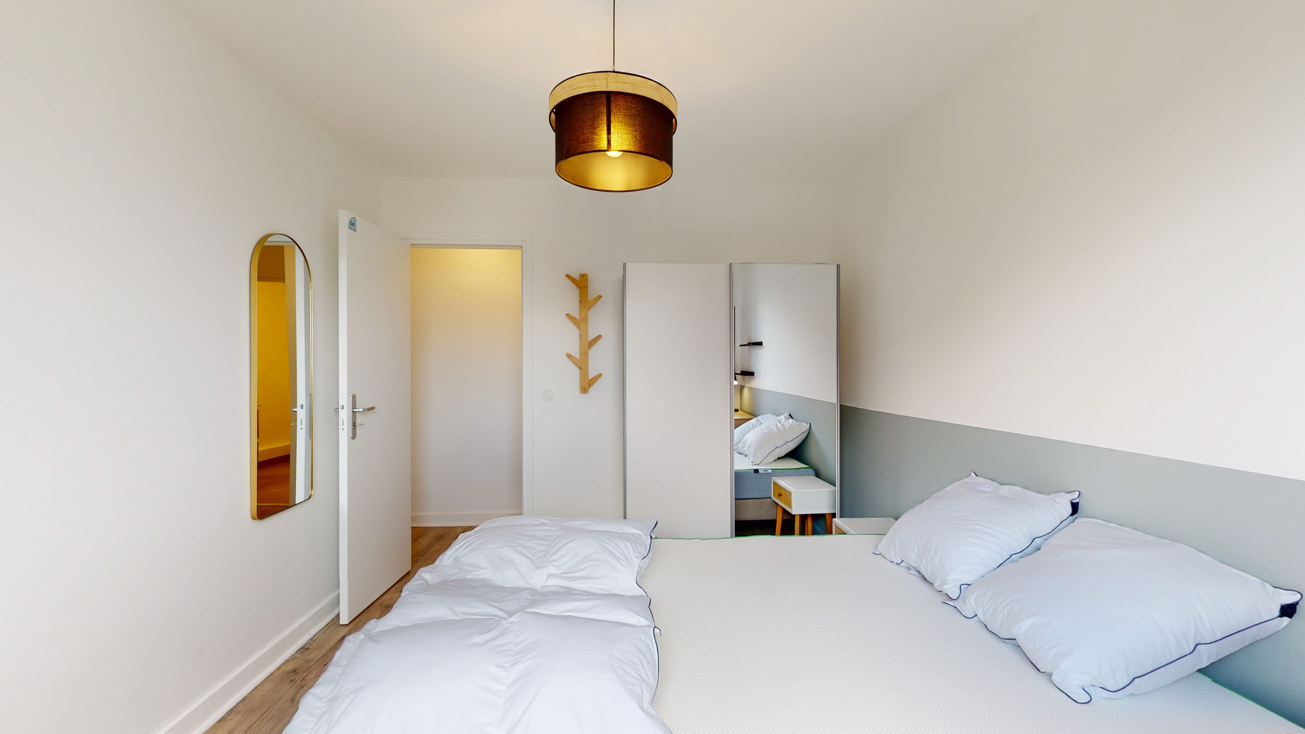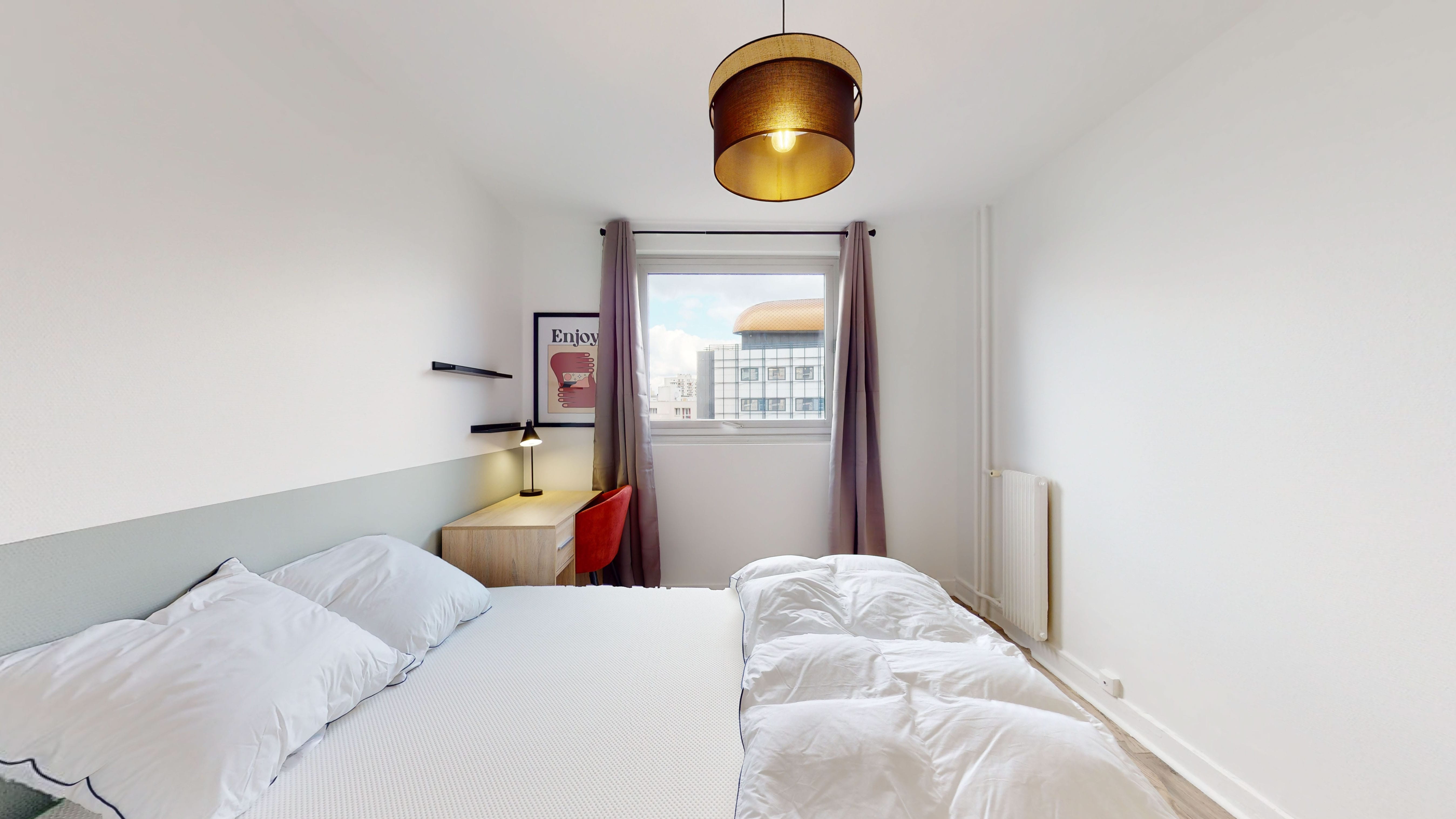 La chambre 4 est une belle pièce de 11 m² juste pour toi. Elle est meublée avec un lit double confortable, une armoire pour ranger tes affaires, une chaise et un bureau pour travailler ou étudier. La salle de bain est à partager avec d'autres locataires, mais elle a tout ce qu'il faut : une douche, un lavabo et des toilettes.