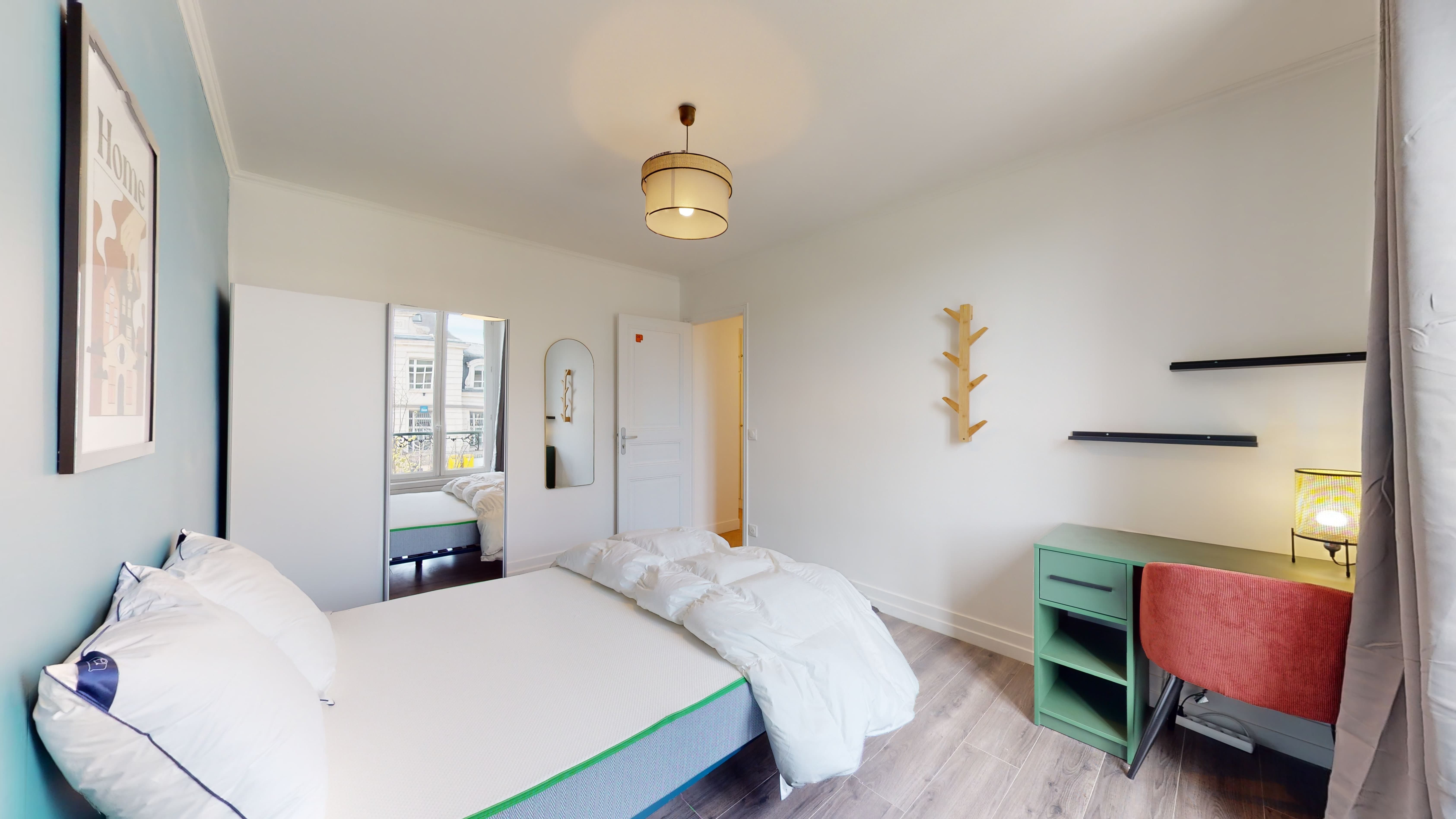 La chambre disponible, nommée "Room 3", est parfaite pour une personne. Elle mesure 12m² et dispose d'un lit double confortable, d'une armoire spacieuse pour vos affaires, ainsi que d'un bureau et d'une chaise pour travailler au calme. La chambre partage une salle de bain bien équipée avec ses colocataires. Vous y trouverez tout le nécessaire : connexion internet haute vitesse, literie de qualité et détails pratiques comme une poubelle et des cintres.