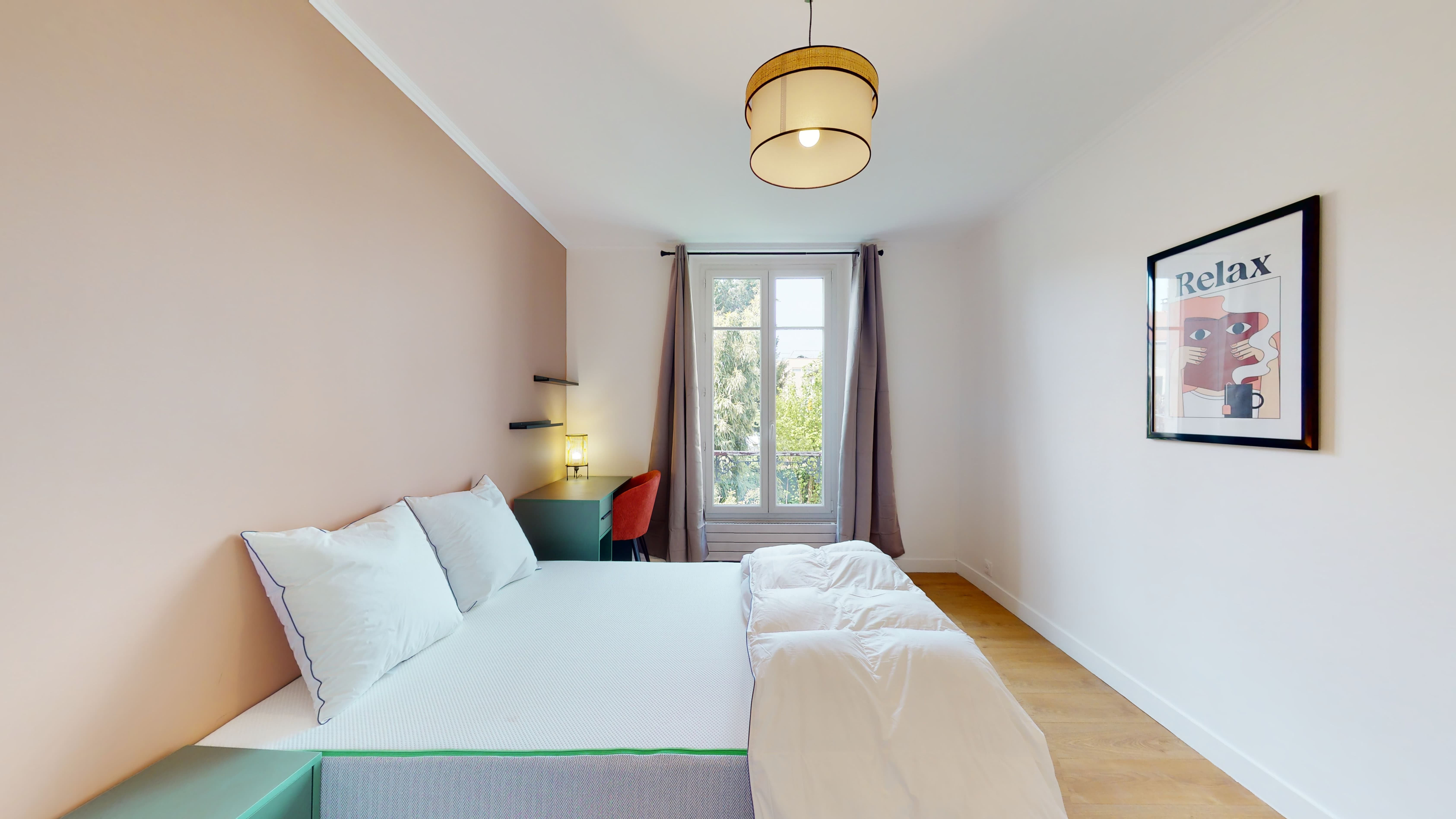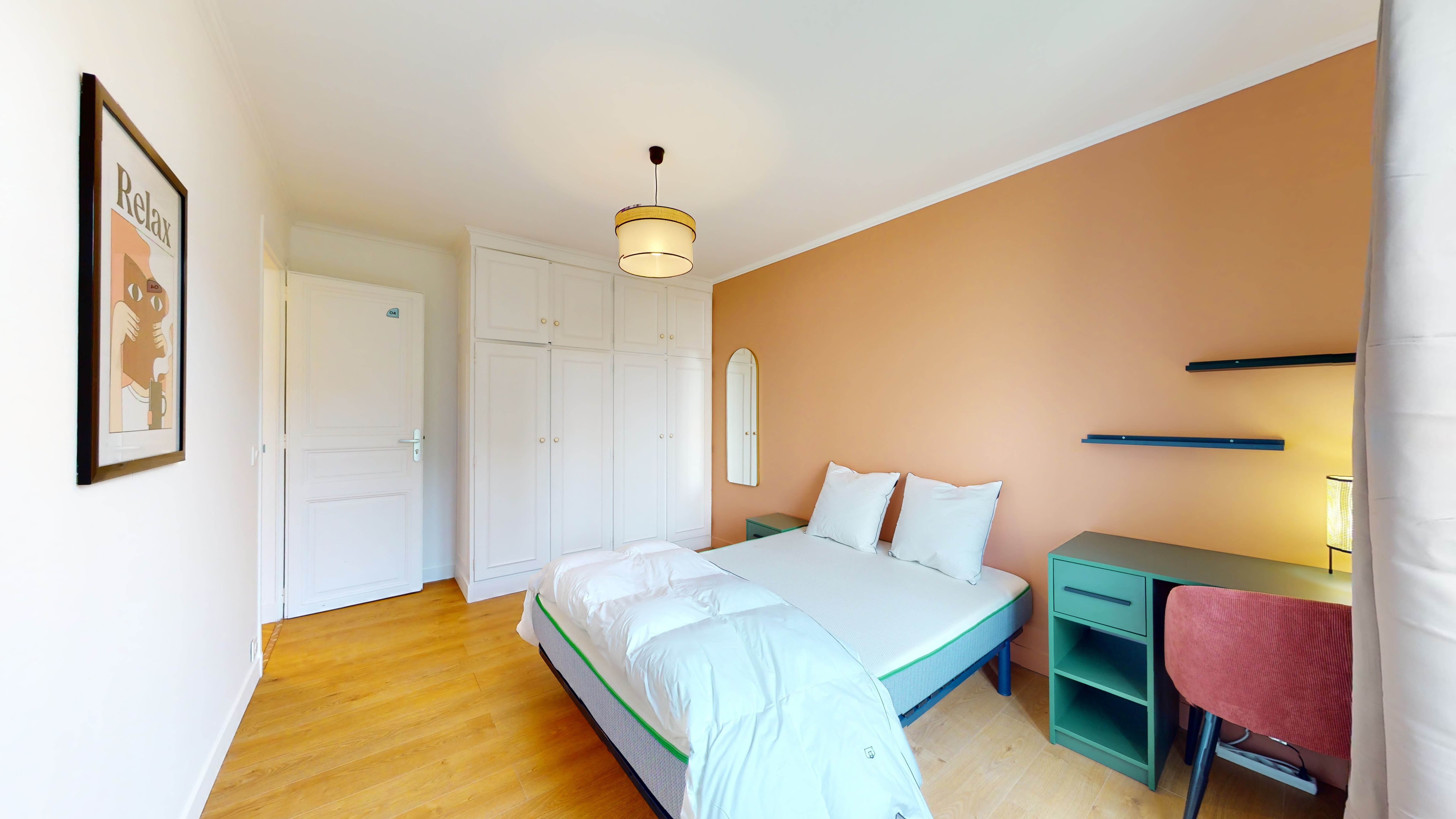 La chambre 4, d'une superficie de 14 m², est pensée pour le confort d'une personne. Elle dispose d'un lit double avec literie de qualité, une armoire spacieuse pour vos vêtements, ainsi qu'un bureau pour étudier ou travailler. La pièce est éclairée par une lampe de chevet et une lampe de bureau, et la salle de bain partagée est équipée d'une douche moderne.