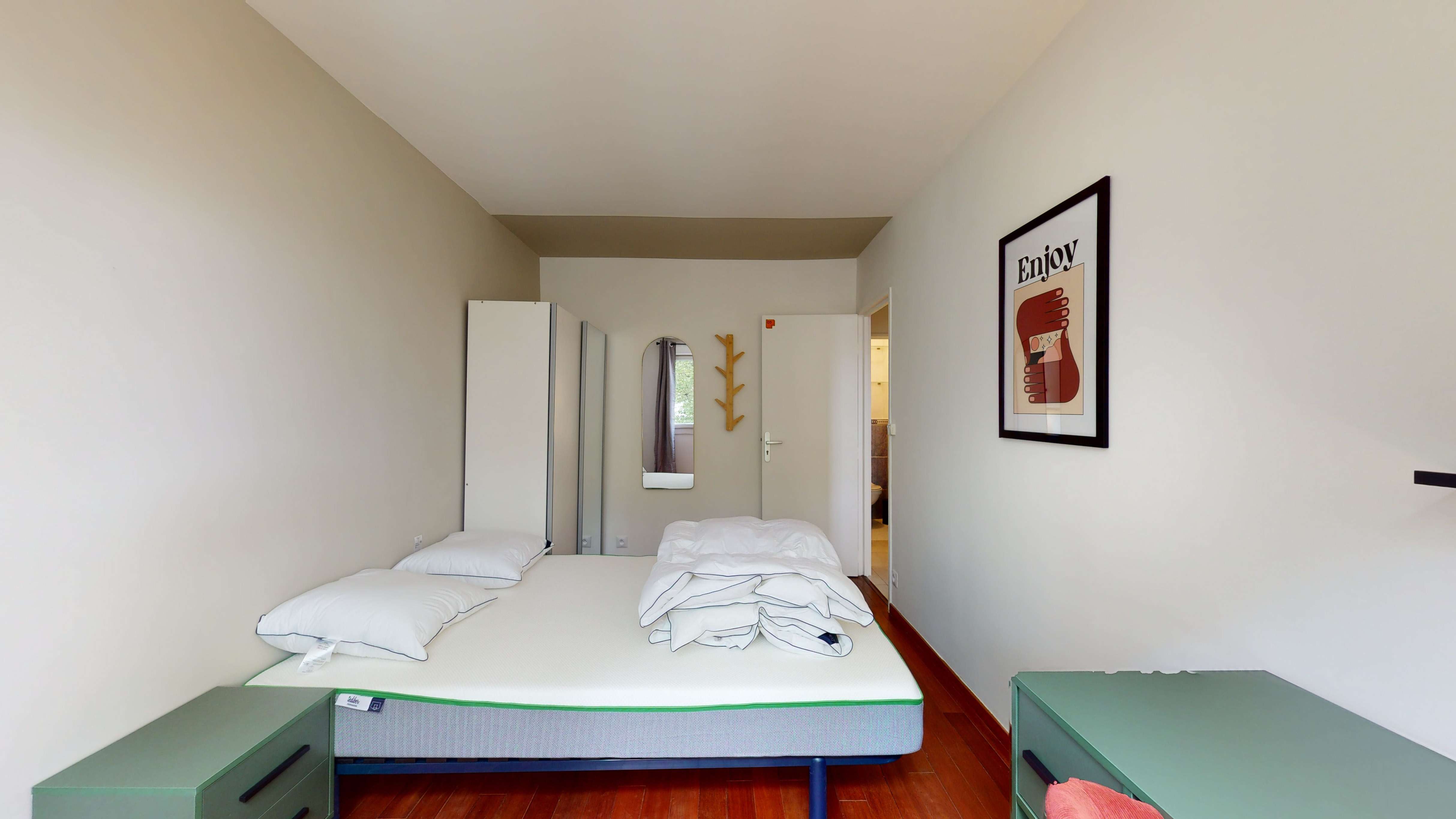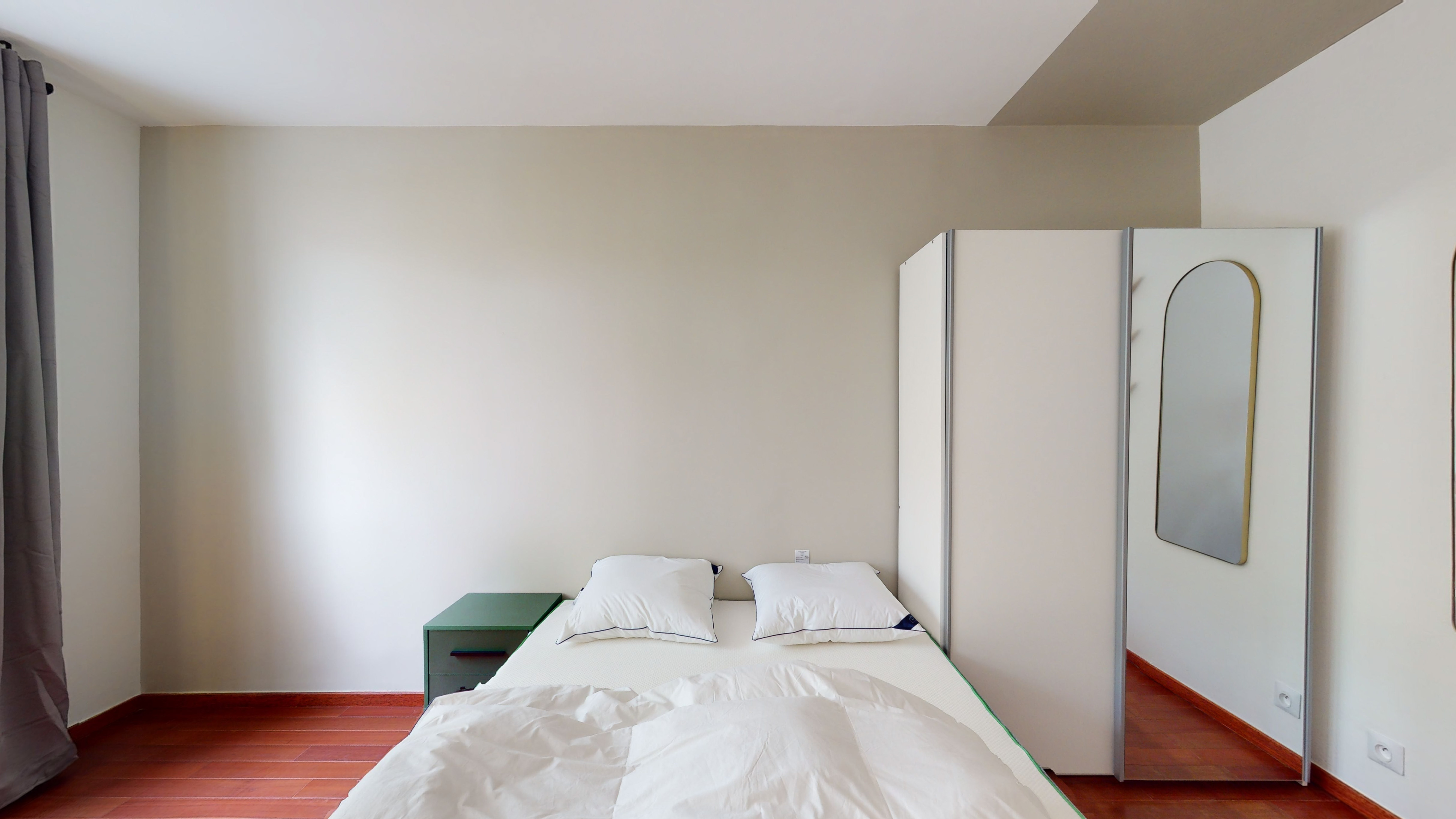La chambre "Room 3" est parfaite pour une personne. Elle possède un lit double douillet, une grande armoire pour vos affaires, ainsi qu'un bureau et une chaise pour vos moments de travail ou d'étude. La chambre partage une salle de bain propre et fonctionnelle avec d'autres locataires.