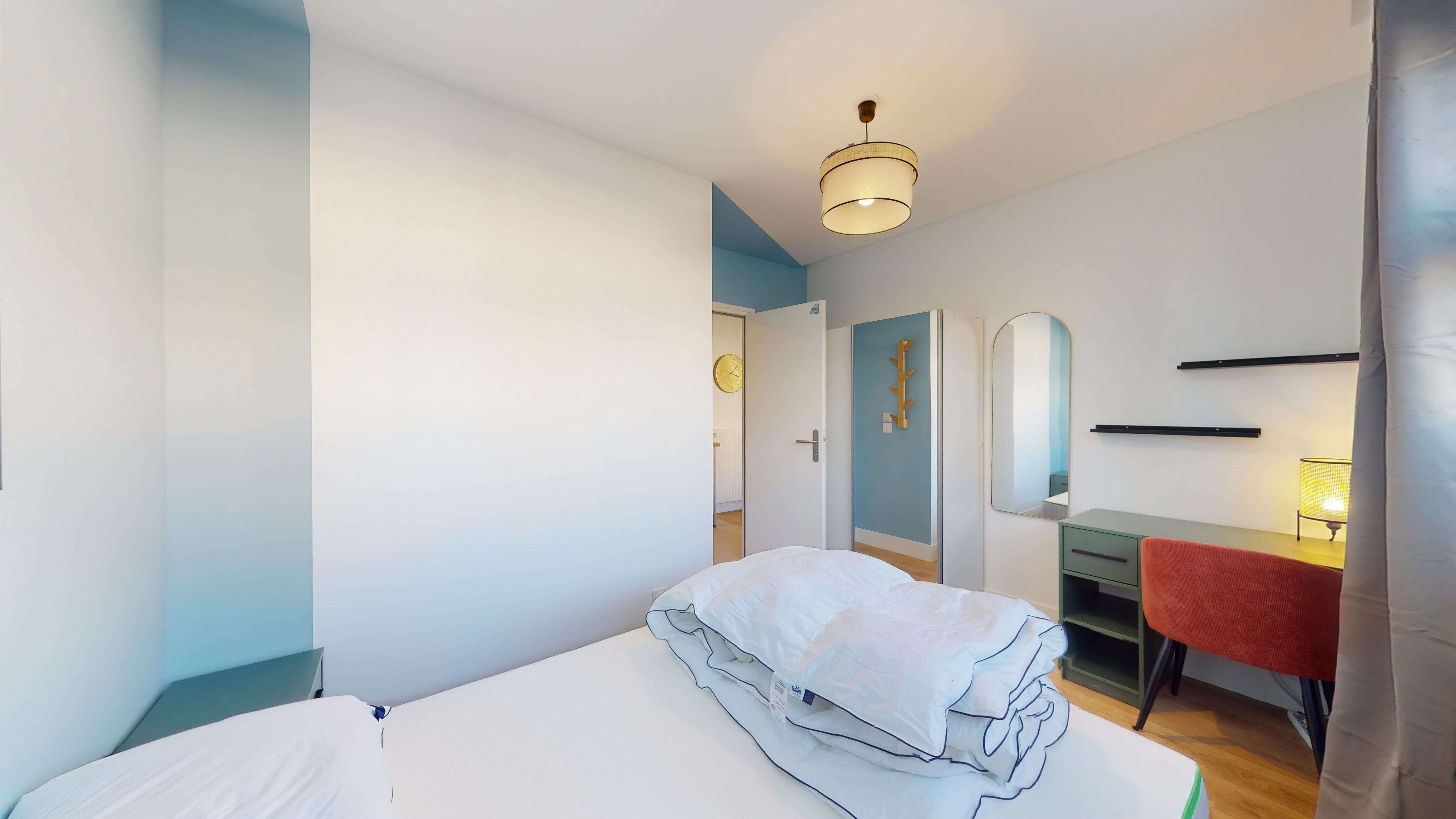 La chambre, conçue spécialement pour une personne, est un véritable petit nid douillet. Elle est meublée d'un confortable lit double, d'une armoire pour vos vêtements, ainsi que d'un bureau et d'une chaise pour travailler ou étudier en toute tranquillité. Avec ses 10 m², elle offre l'intimité dont vous avez besoin et partage une salle de bain bien équipée avec d'autres locataires.