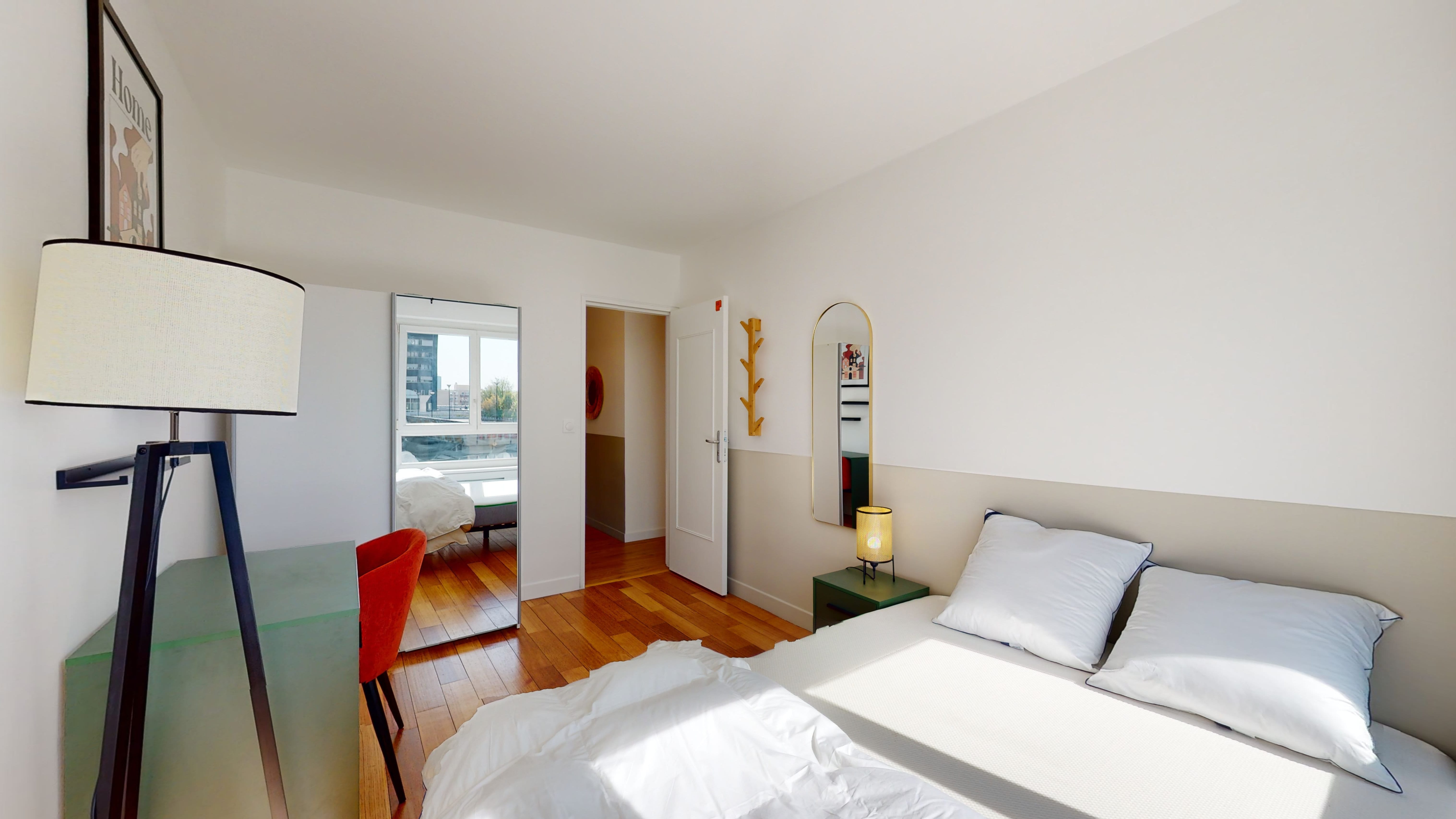La chambre numéro 3, prévue pour une personne, est un petit cocon de 11 m². Elle est meublée d'un lit double confortable avec une literie de qualité, une armoire pour vos vêtements, ainsi que d'un bureau et une chaise pour travailler ou étudier en toute tranquillité. La chambre partage une salle de bain propre avec douche et toilettes avec d'autres locataires.