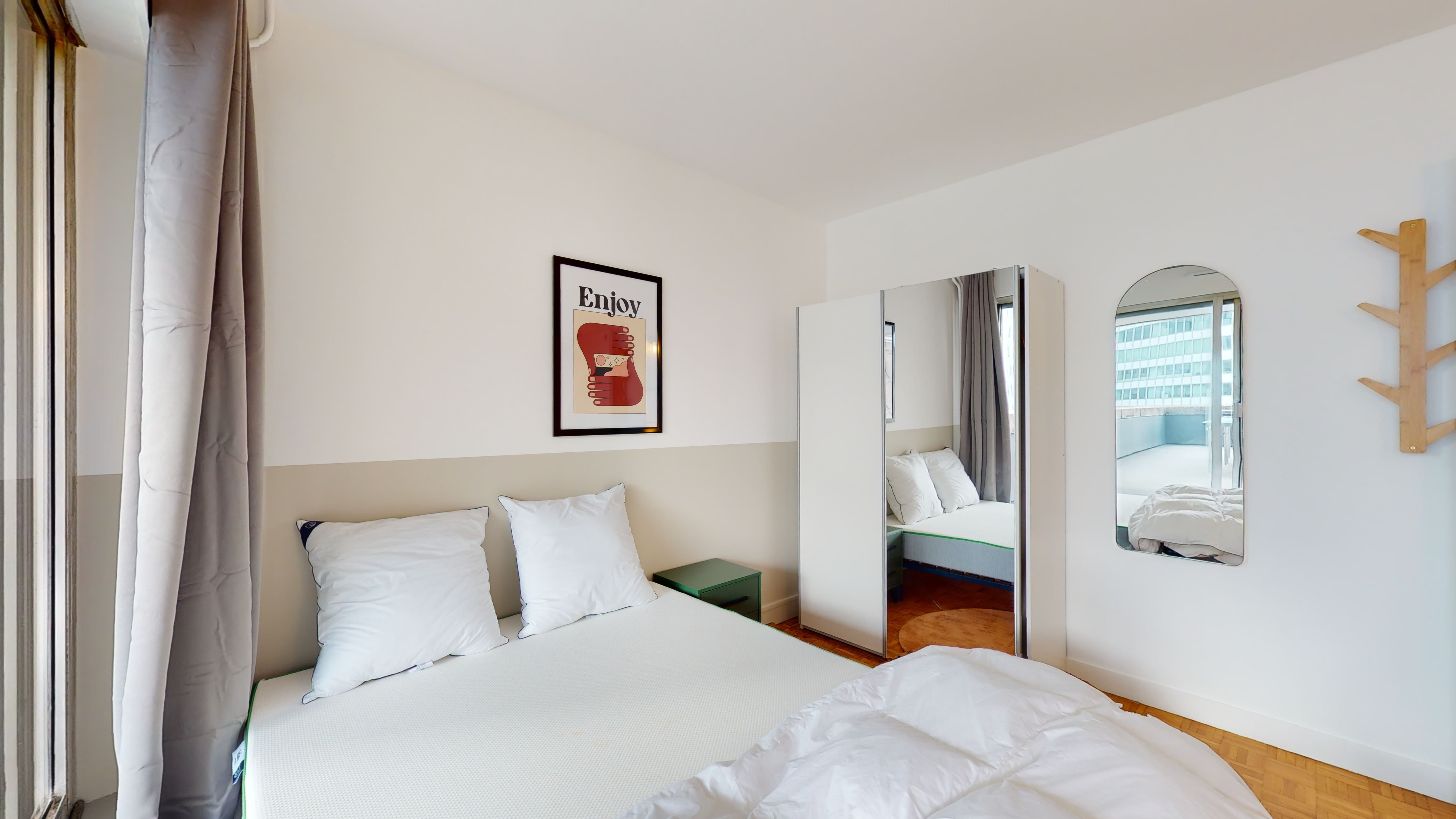 Room 1 est une chambre douillette de 10 m² conçue spécialement pour une personne. Elle est meublée d'un lit double confortable, d'une armoire pour vos affaires, d'un bureau et d'une chaise pour travailler ou étudier, et donne accès à un balcon privé pour prendre l'air. La chambre partage une salle de bain moderne avec les autres locataires.