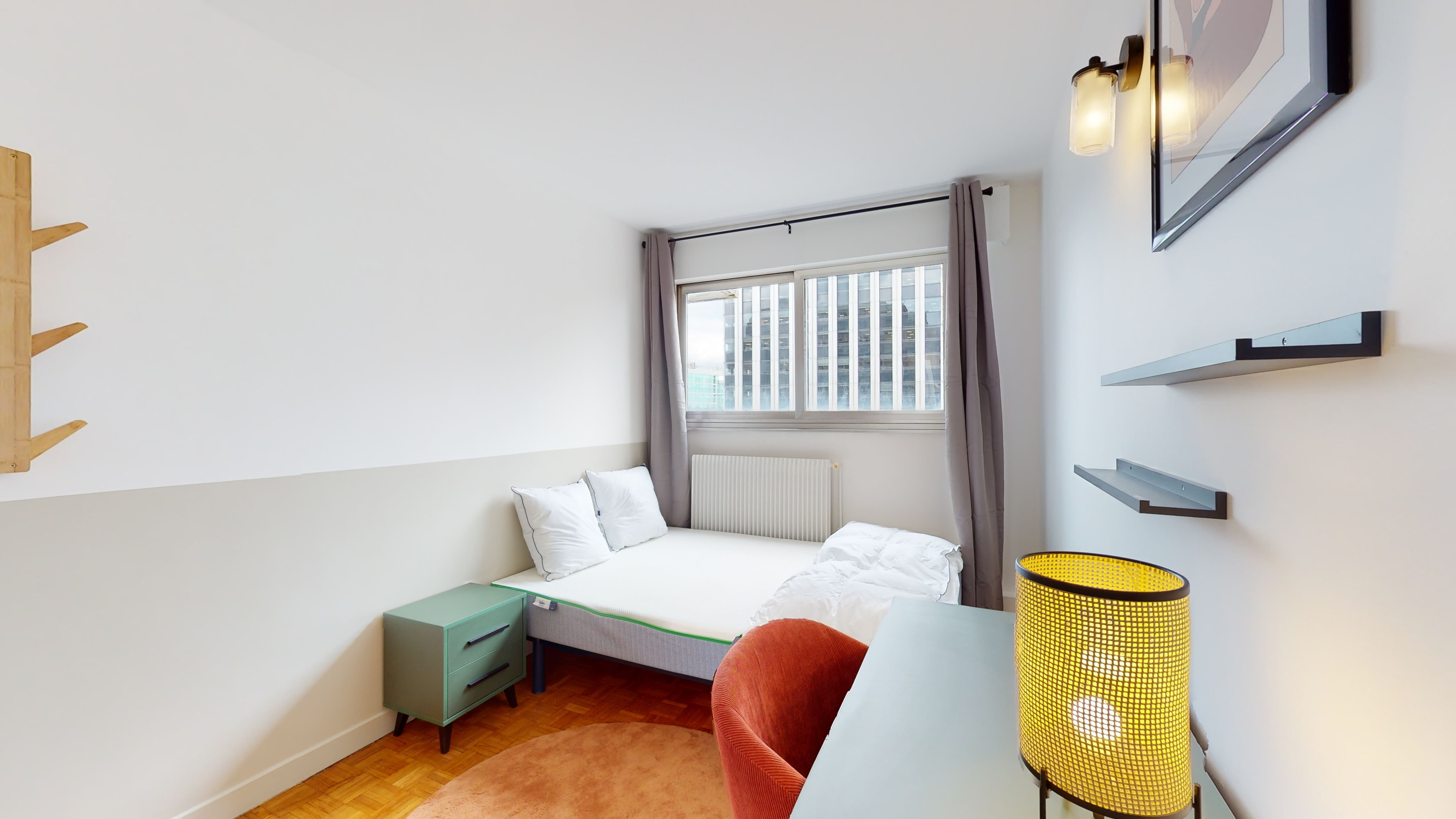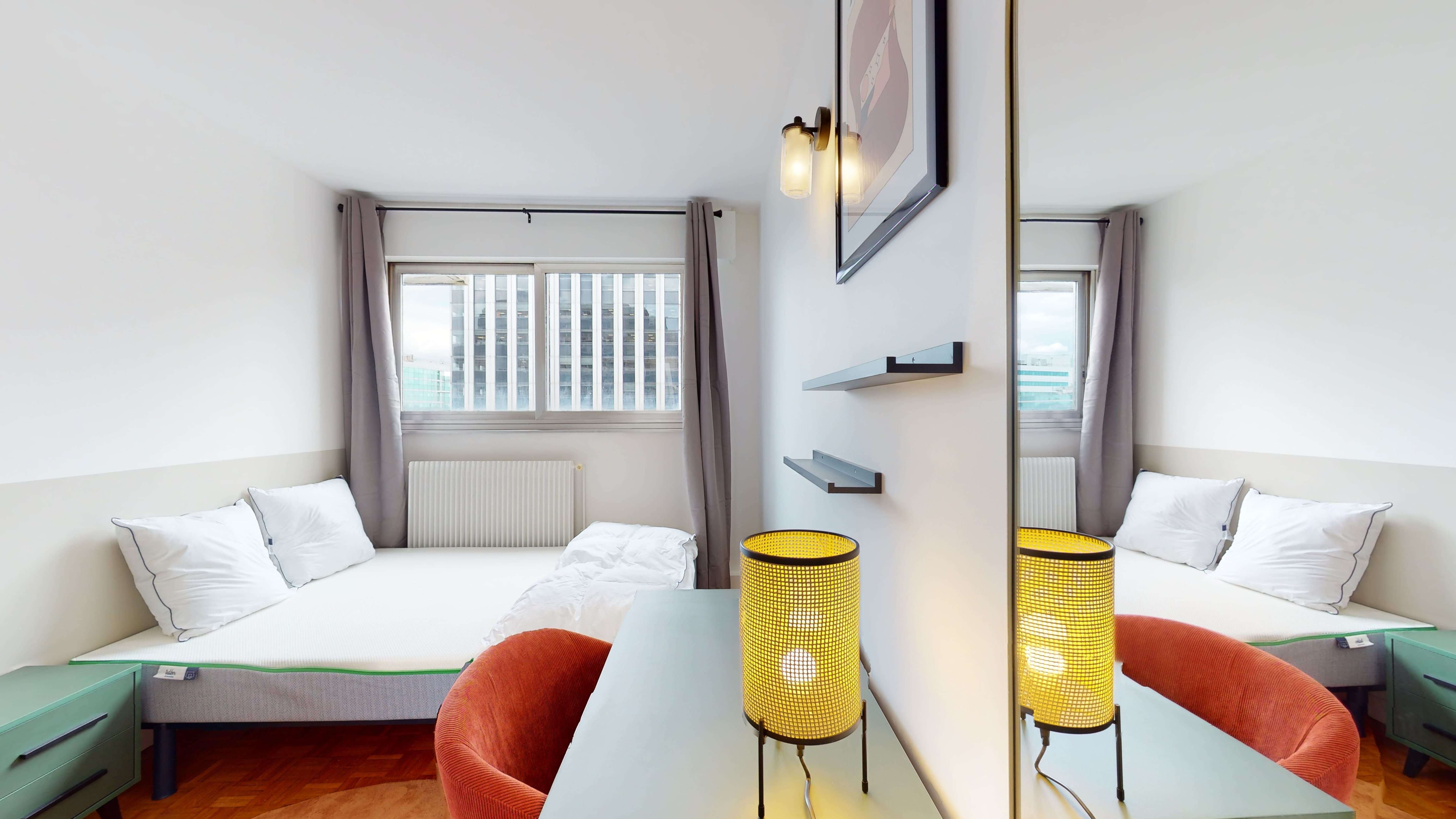 La chambre "Room 2" est parfaite pour une personne. Elle dispose d'un lit double confortable, d'une armoire pour vos affaires, d'un bureau et d'une chaise pour travailler ou étudier. La chambre partage une salle de bain moderne avec d'autres locataires.