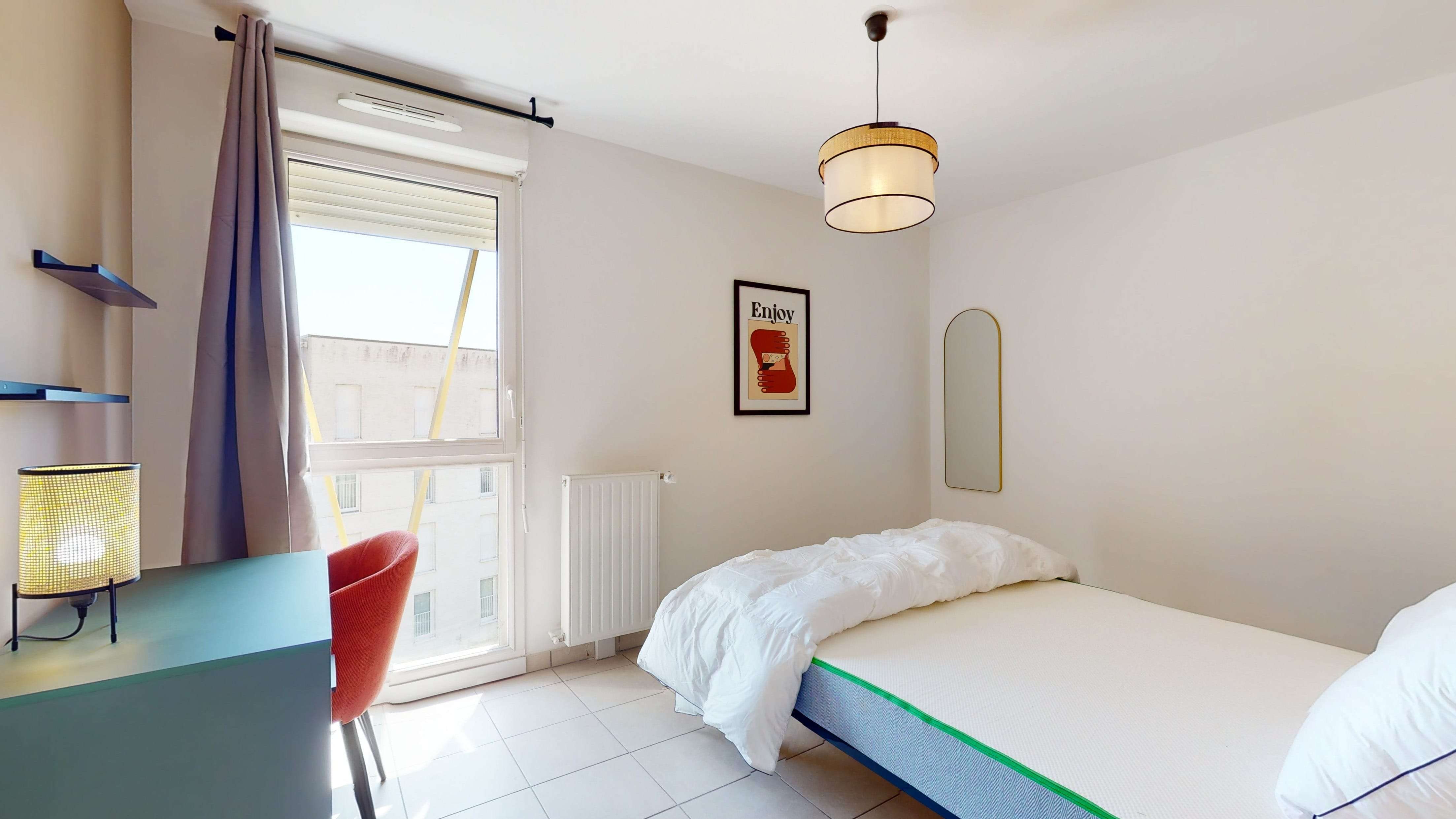 La chambre Room 2 est un petit cocon privé de 12 m², juste pour vous. Elle dispose d'un confortable lit double, d'une armoire spacieuse pour vos vêtements, ainsi que d'un bureau et une chaise pour travailler ou étudier en toute tranquillité. Vous partagerez une salle de bain moderne avec d'autres colocataires.