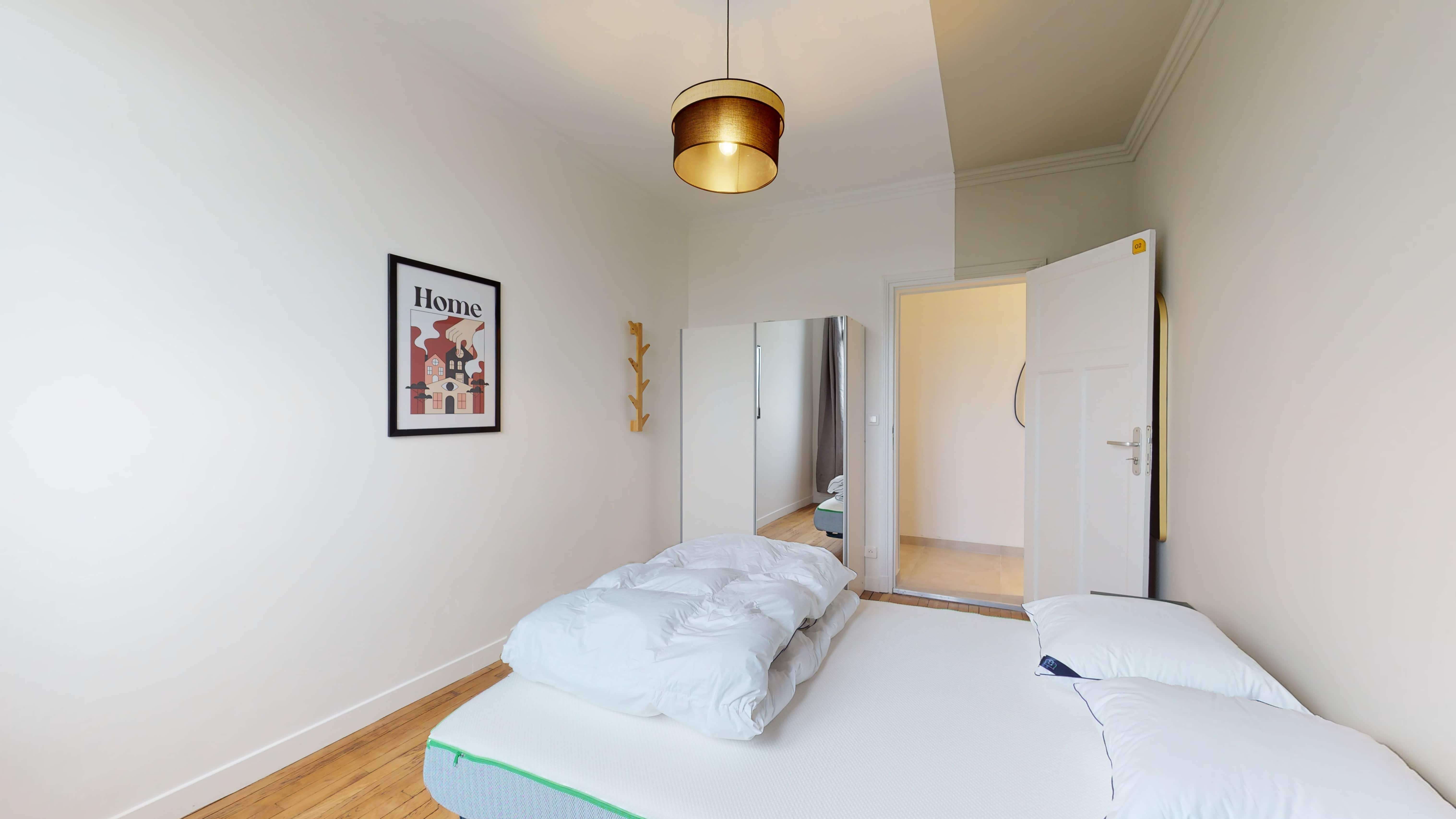 La chambre que nous proposons, Room 2, est un espace personnel de 12 m², conçu pour une personne. Elle est meublée d'un lit double confortable, d'une armoire pour vos affaires, ainsi que d'un bureau et d'une chaise pour vos moments d'étude ou de travail. La chambre bénéficie également d'une connexion internet haut débit et de tout le nécessaire pour votre confort quotidien.