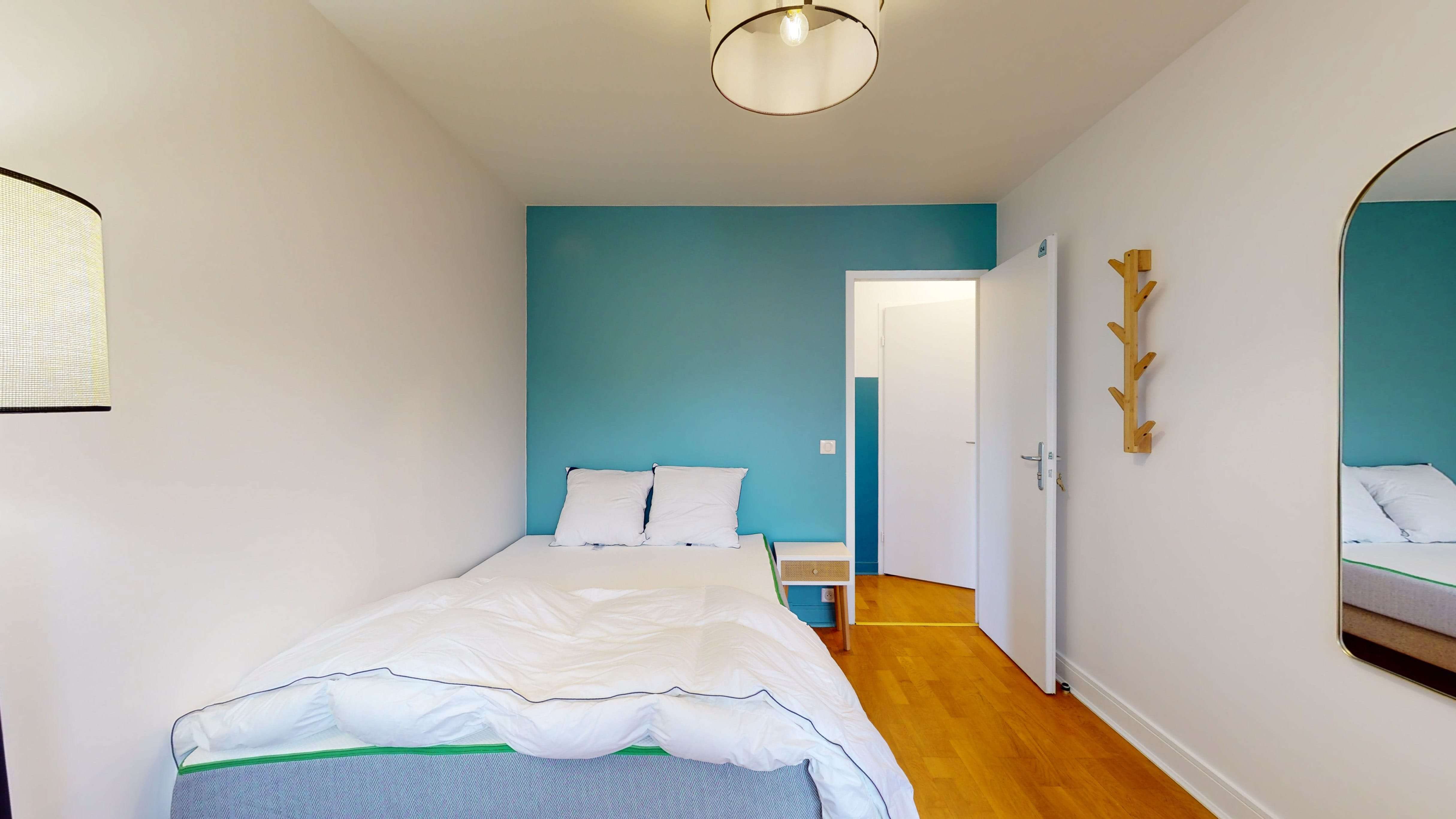 La chambre Room 2, de 12 m², est conçue pour une personne. Avec son confortable lit double, une grande armoire pour toutes vos affaires, un bureau pour travailler et une chaise, c'est un espace à vous où vous pourrez vous reposer et étudier en toute tranquillité. La chambre partage une salle de bain moderne avec douche, lavabo et toilettes.
