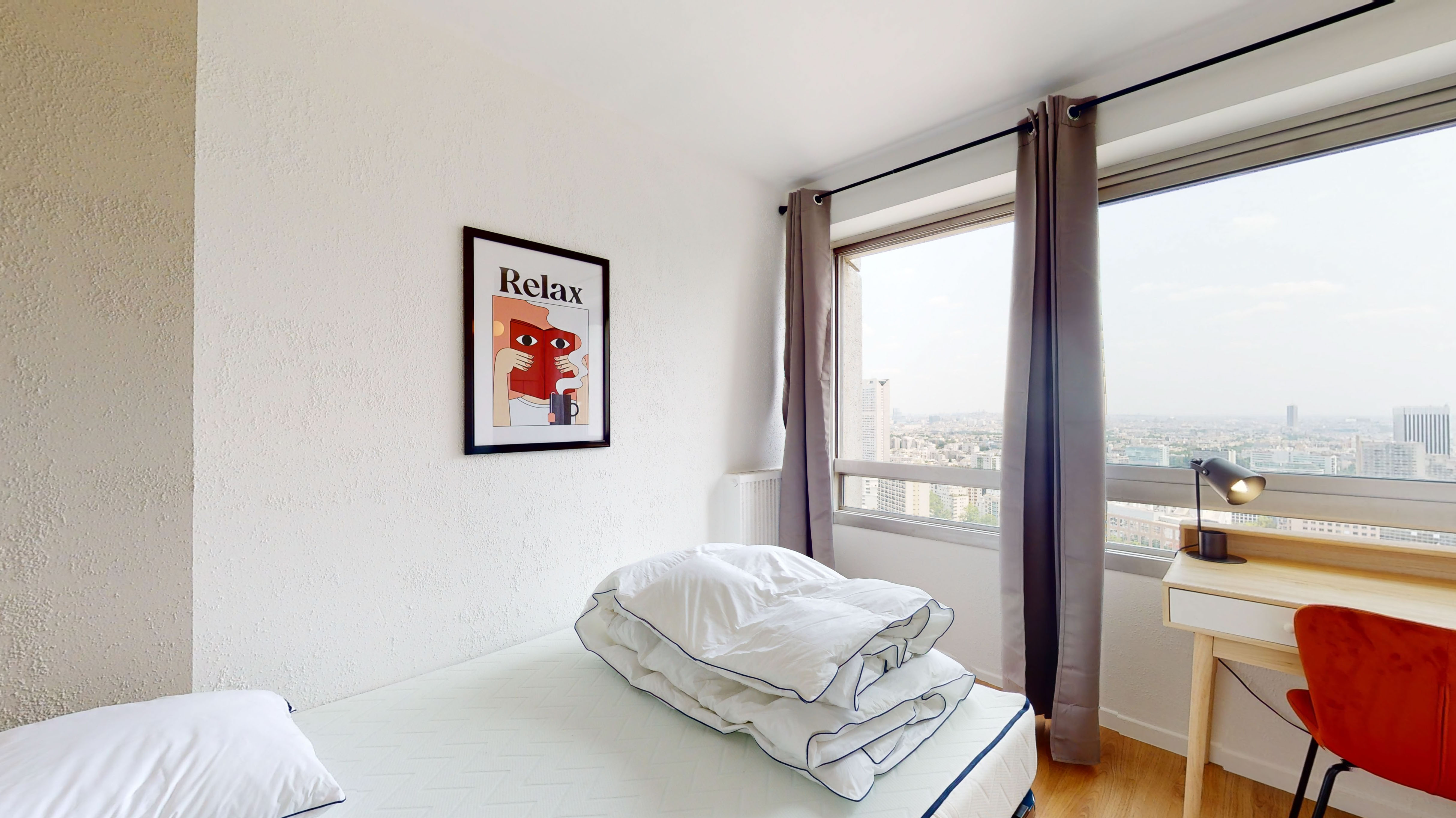 La chambre, baptisée "Room 3", est un espace personnel pensé pour le confort d'une personne. Elle dispose d'un lit double douillet, d'un espace de travail avec bureau et chaise, et de rangements suffisants pour toutes vos affaires. La salle de bain est à partager, garantissant propreté et fonctionnalité.