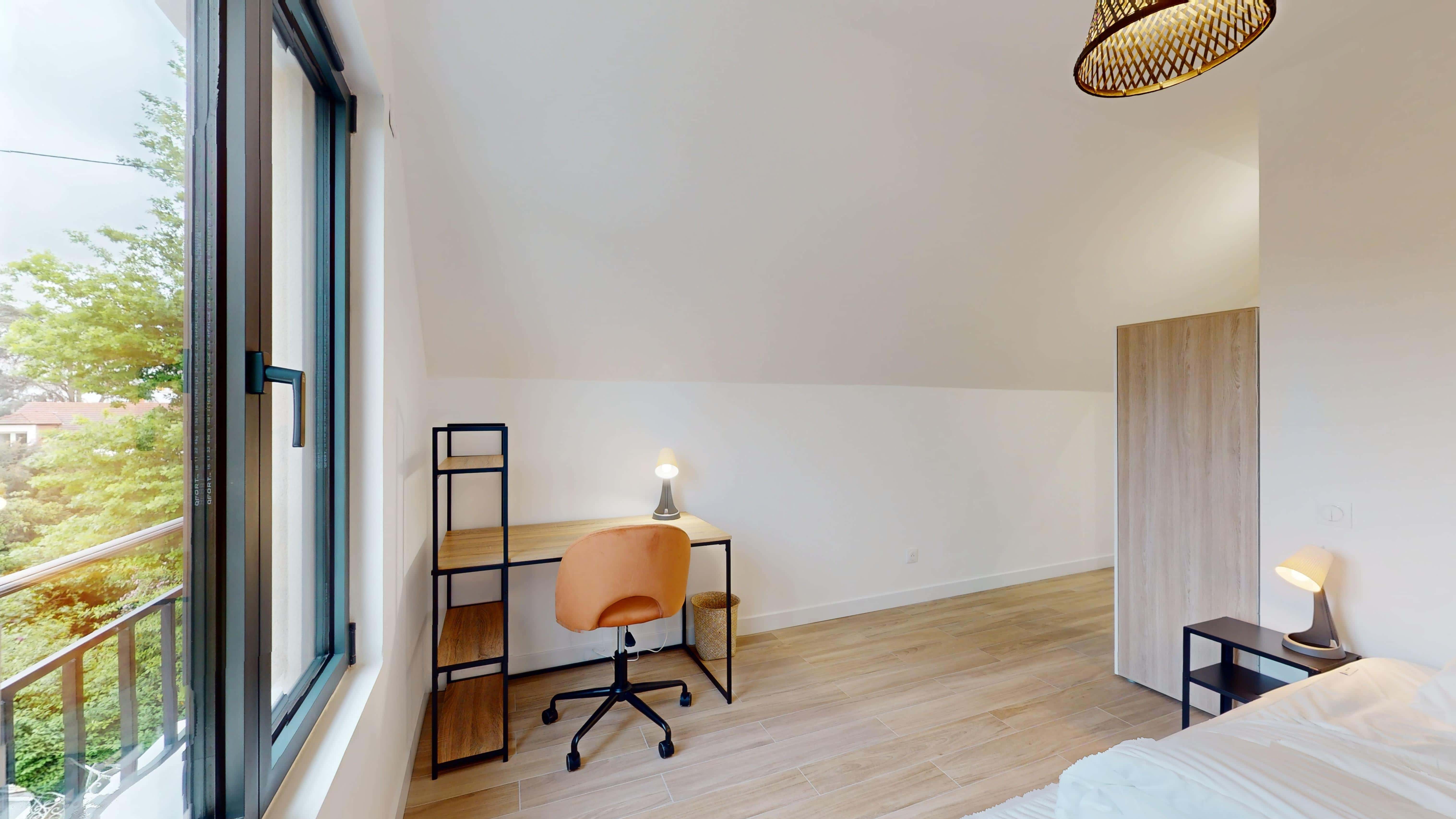 La chambre Room 4, conçue pour une personne, est un espace privé de 16 m² où vous pourrez vous reposer et travailler confortablement. Elle est meublée d'un lit double avec literie de qualité, d'une armoire pour vos affaires, d'un bureau avec lampe et chaise pour étudier ou travailler, et d'étagères murales pour vos livres ou décorations. La chambre partage une salle de bain moderne avec douche et toilettes.