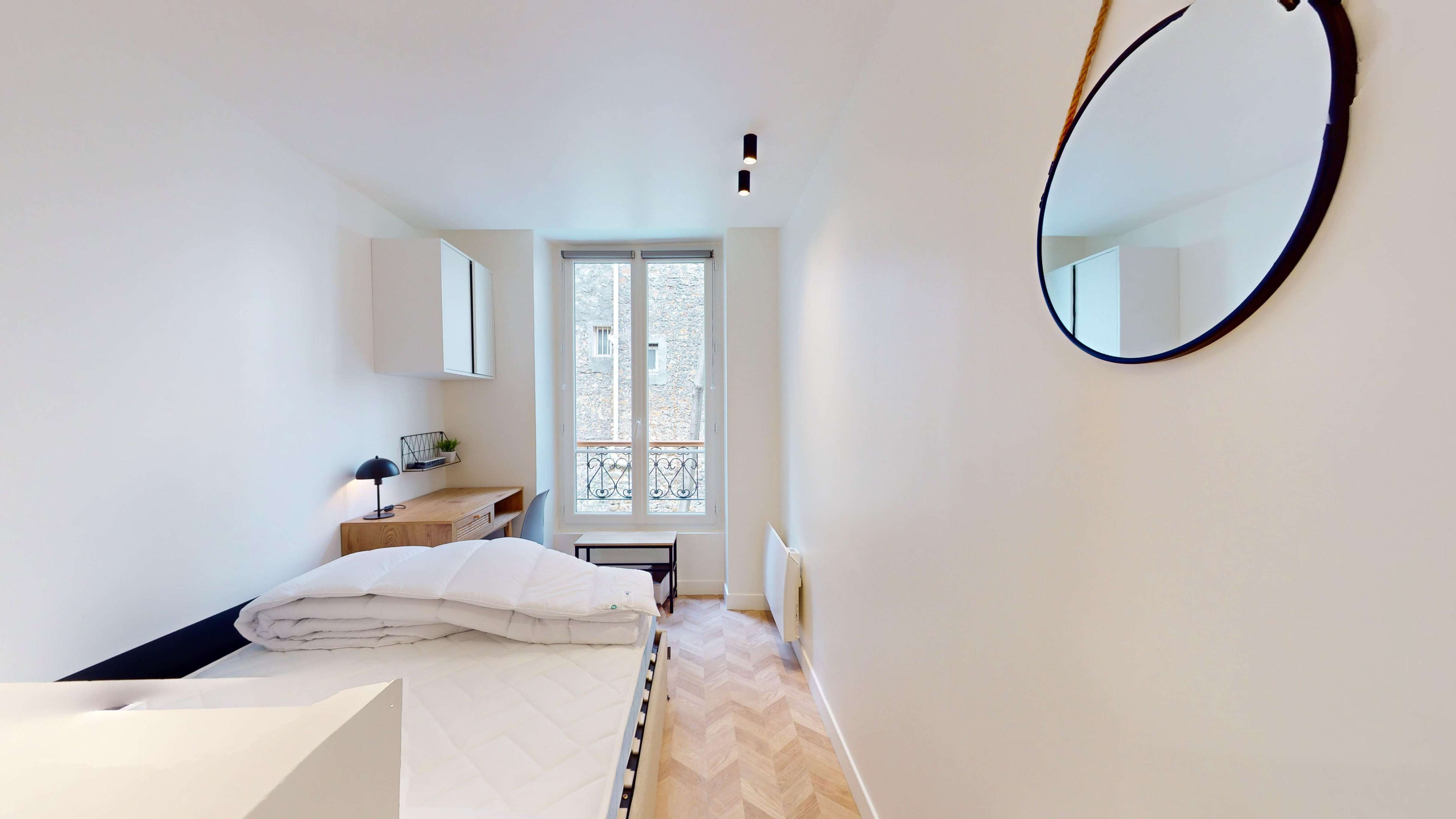 Votre chambre privée, située au premier étage, est un véritable cocon de confort. Elle est meublée d'un lit double avec des rangements intégrés, une armoire pour vos affaires, un bureau et une chaise pour travailler ou étudier. Vous bénéficiez également d'une salle de bain privée avec douche et lavabo. La chambre est conçue pour une personne et offre tout le nécessaire pour un quotidien agréable.