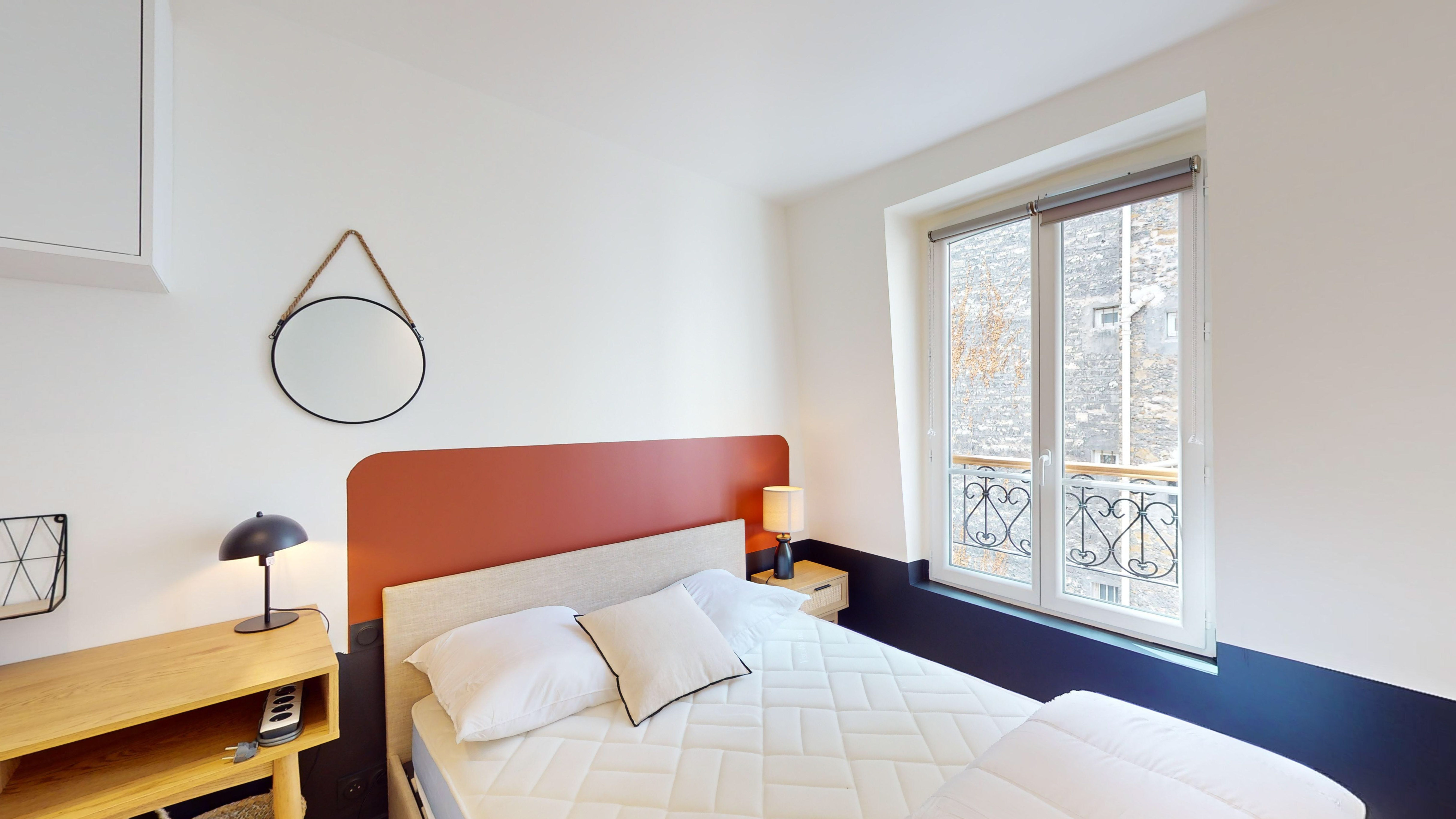 La chambre "Room for one person - 11", située au dernier étage, est un véritable cocon personnel. Avec ses 16m2, elle est équipée d'un lit double confortable avec rangement intégré, d'une armoire pour vos affaires, d'un bureau et d'une chaise pour travailler ou étudier. La salle de bain privée comprend une douche moderne, un lavabo et des toilettes. La chambre dispose également de l'internet haut débit et de tout le nécessaire pour votre confort quotidien.
