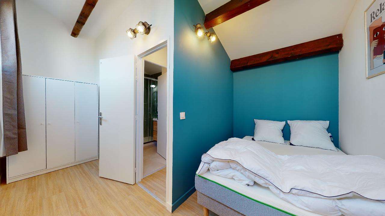 Room 4 est votre espace privé, conçu juste pour vous. Avec 9 m², elle dispose d'un lit double douillet, d'une armoire pour ranger vos affaires, d'un bureau pour étudier ou travailler, et d'une chaise. Vous partagerez une salle de bain moderne avec douche et toilettes.