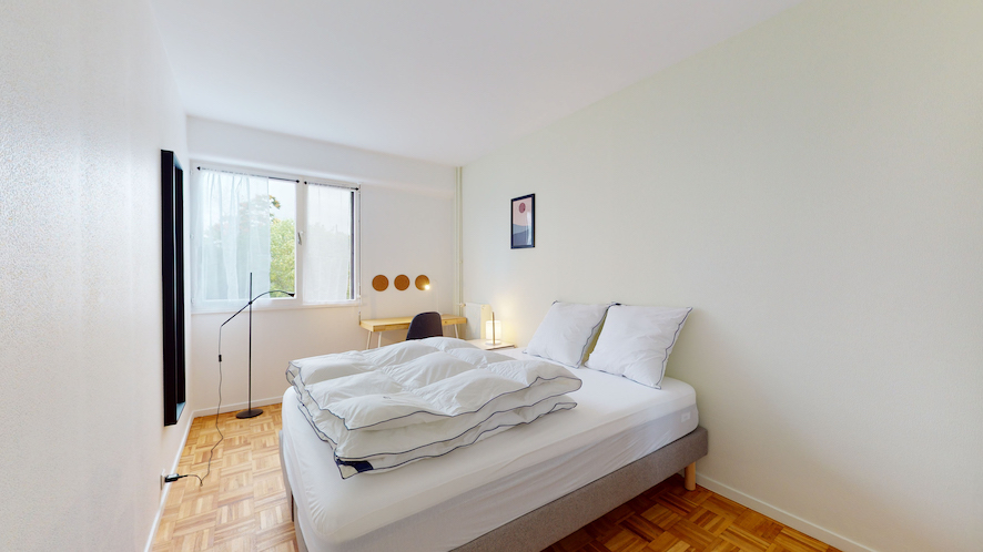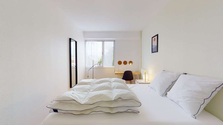 La chambre Room 2 est un cocon douillet de 12 m², pensée spécialement pour une personne. Vous y trouverez tout le confort nécessaire : un lit double pour des nuits reposantes, une armoire pour ranger vos affaires, une chaise et un bureau pour étudier ou travailler. Elle partage une salle de bain moderne avec d'autres colocataires.