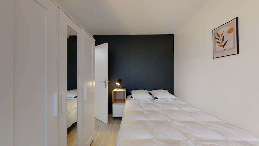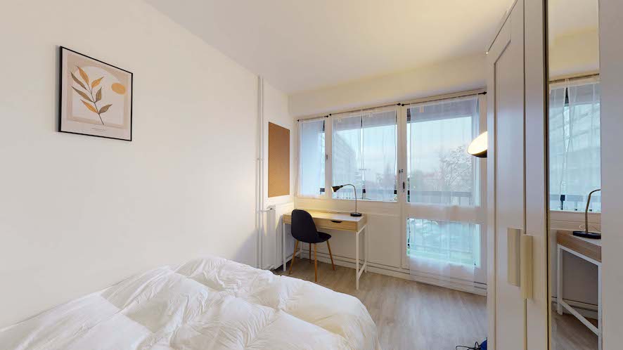 Room 2 est parfaite pour une personne. Cette chambre de 9 m² comprend un lit double confortable, une armoire pour ranger vos vêtements, une chaise et un bureau pour étudier ou travailler. Vous aurez même un accès direct à la terrasse pour profiter de l'air frais. La salle de bain est à partager avec les autres colocataires.