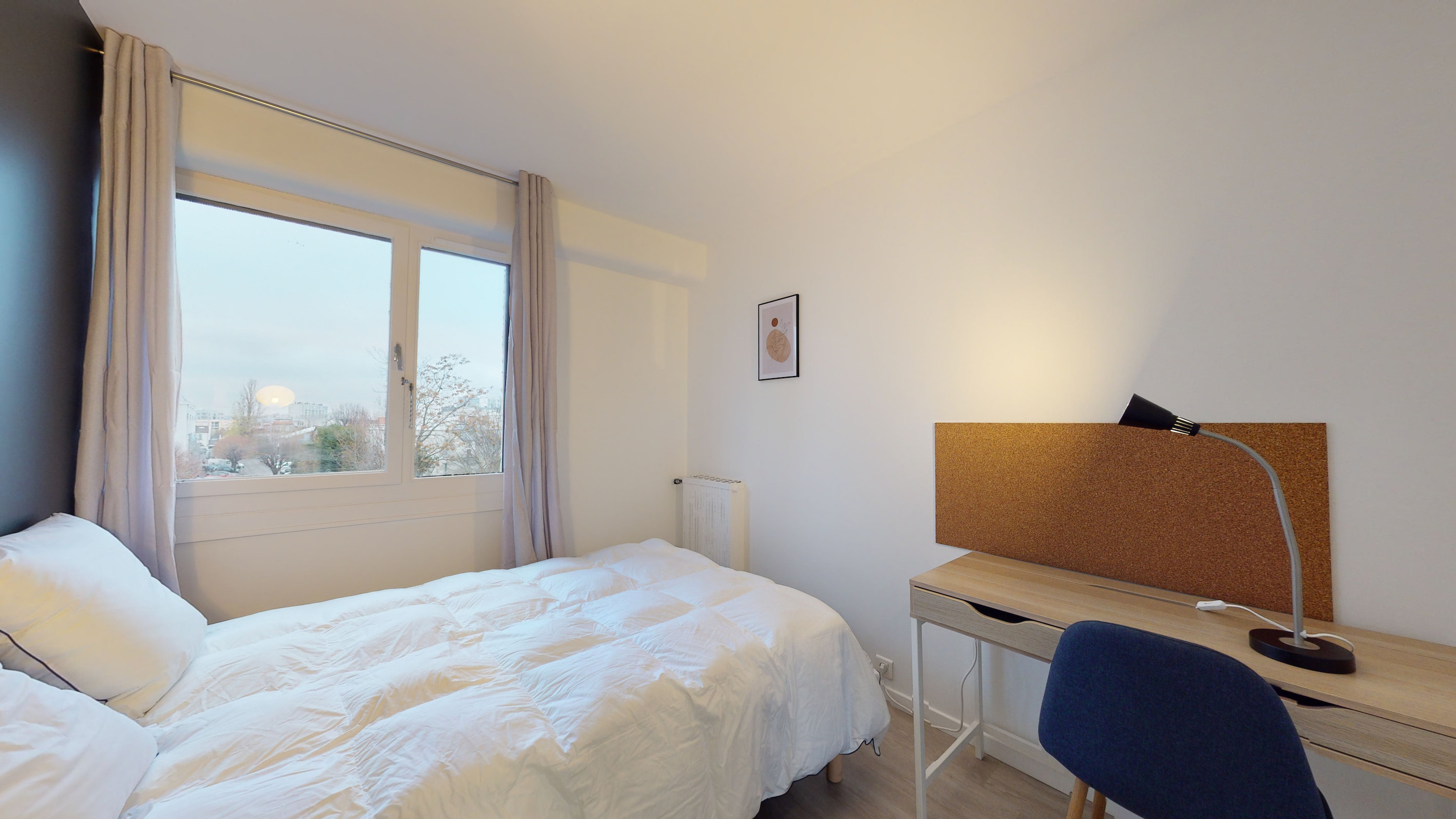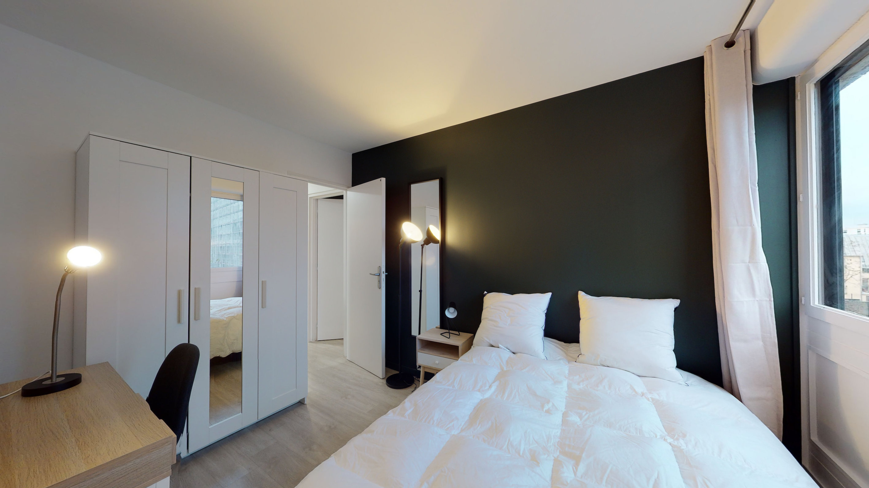La chambre 4 est parfaite pour une personne. Avec ses 9 m², elle comprend un lit double confortable avec une literie de qualité, un bureau pratique pour travailler, une chaise, une armoire pour ranger vos affaires et une lampe de bureau. Elle partage une salle de bain équipée d'une douche, d'un lavabo et de toilettes avec d'autres locataires.