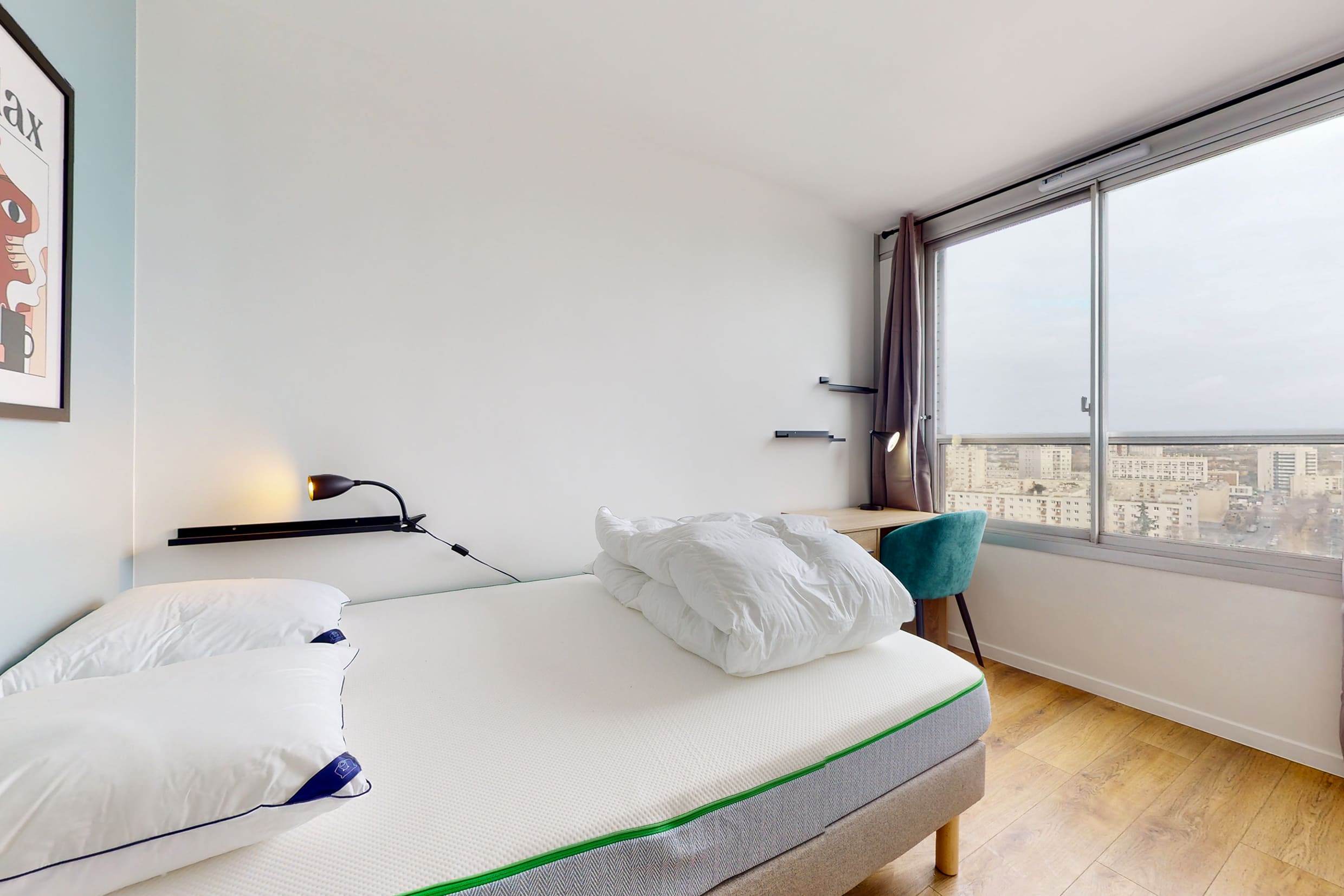 La chambre que nous proposons, nommée Room 2, mesure 9 m² et est parfaitement adaptée pour une personne. Elle est meublée d'un confortable lit double, d'une armoire pour ranger vos affaires, d'une chaise et d'un bureau idéal pour travailler ou étudier. La salle de bain avec douche et toilettes est à partager avec d'autres locataires.