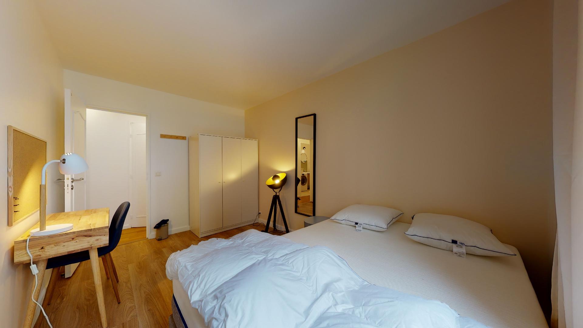 La chambre 3 est un petit cocon personnel de 11 m², juste pour vous. Elle est meublée d'un lit double confortable, d'une armoire pour vos vêtements, d'un bureau avec une lampe pour travailler et d'une chaise. Vous partagerez une salle de bain propre et fonctionnelle avec douche et toilettes.