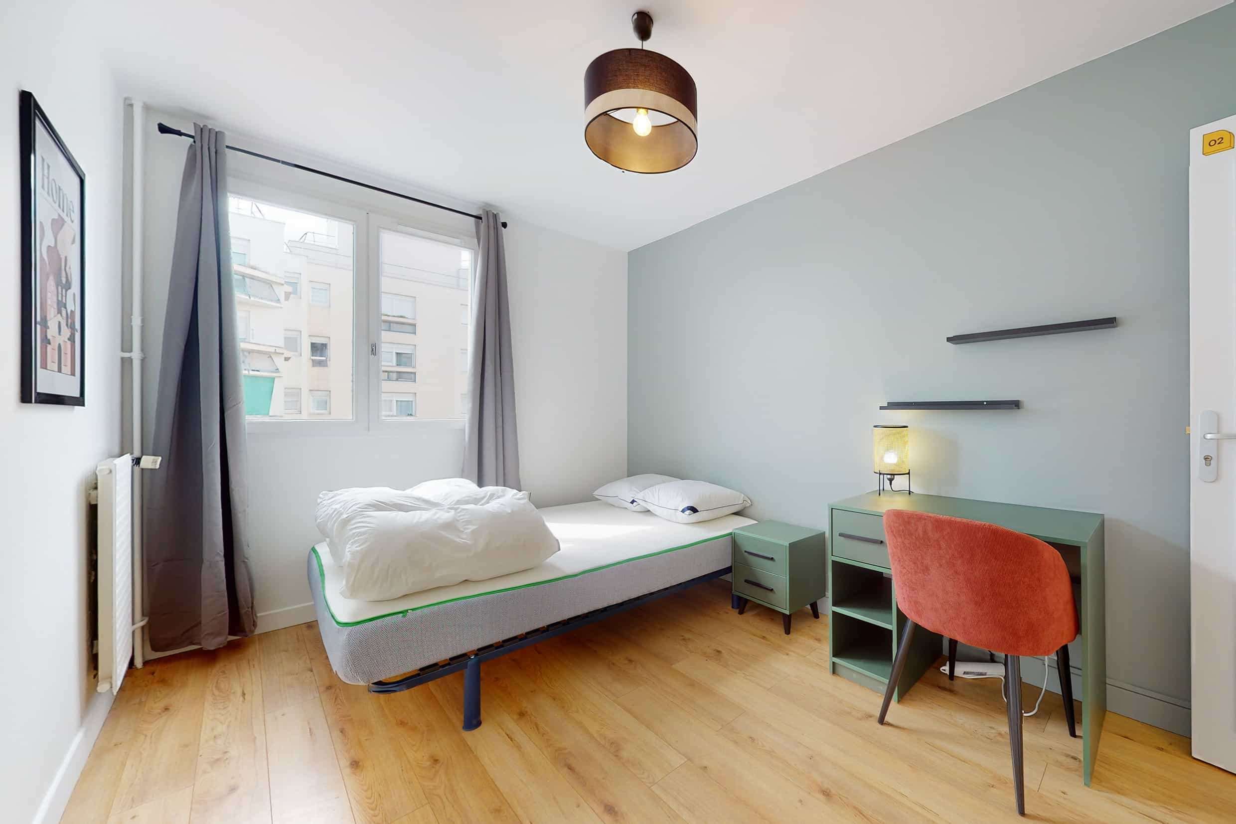 La chambre que nous proposons, Room 2, est un petit cocon juste pour vous. Elle est meublée d'un lit double douillet avec de la literie de qualité, une armoire pour vos affaires, ainsi qu'un bureau et une chaise pour travailler ou étudier en toute tranquillité. La fenêtre habillée de rideaux offre une lumière douce et l'intimité nécessaire.