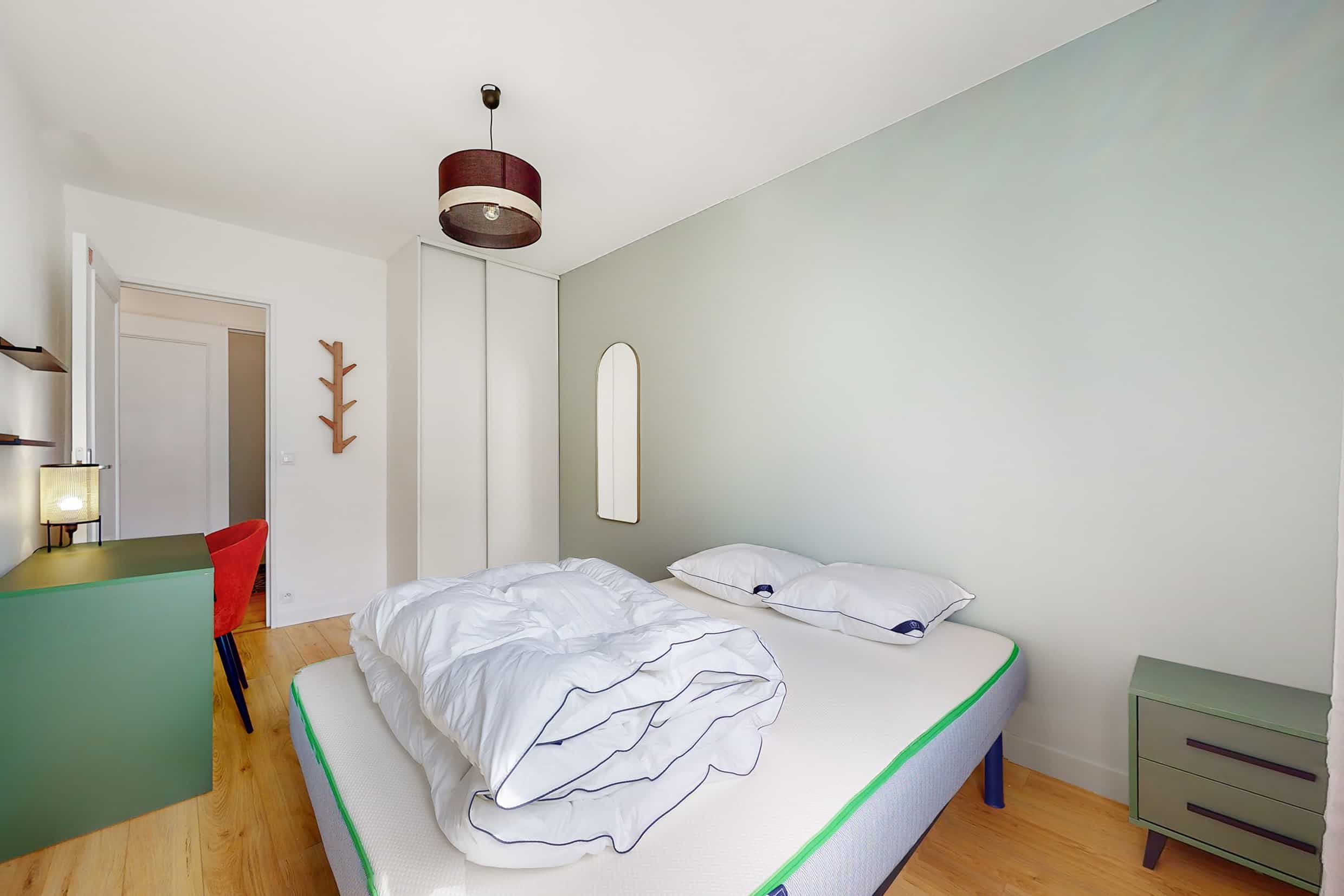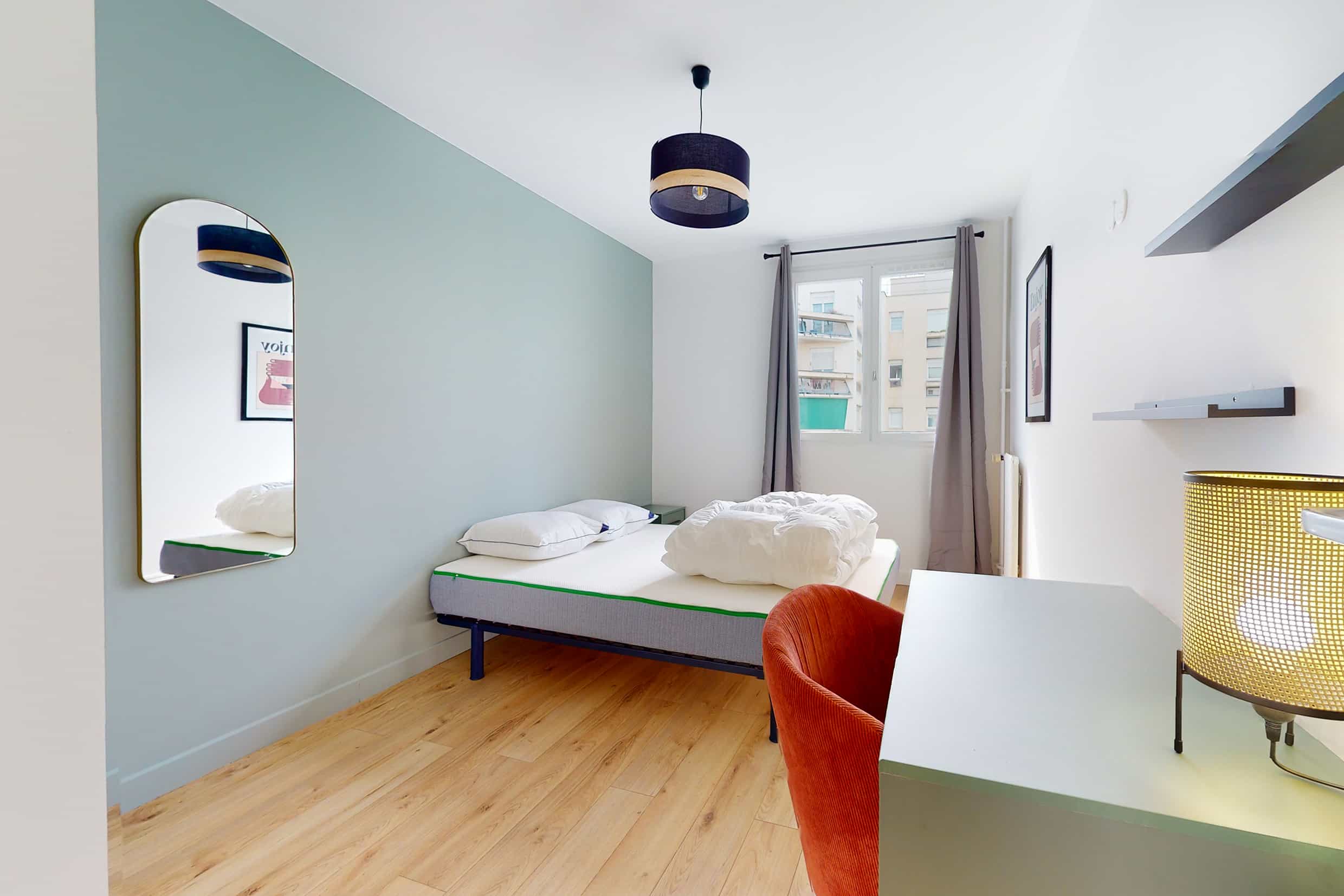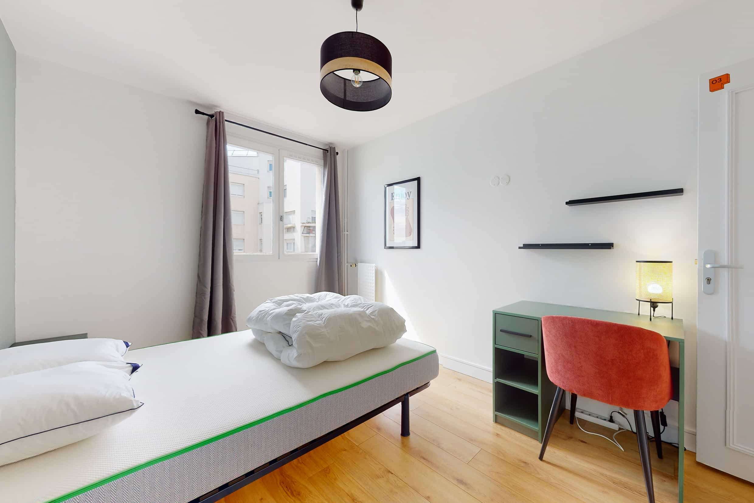 La chambre, nommée "Room 3", est conçue spécialement pour une personne. Elle dispose d'un lit double douillet, d'une grande armoire pour ranger vos affaires, ainsi que d'un bureau et d'une chaise pour travailler ou étudier. La chambre partage une salle de bain bien équipée avec les autres locataires.