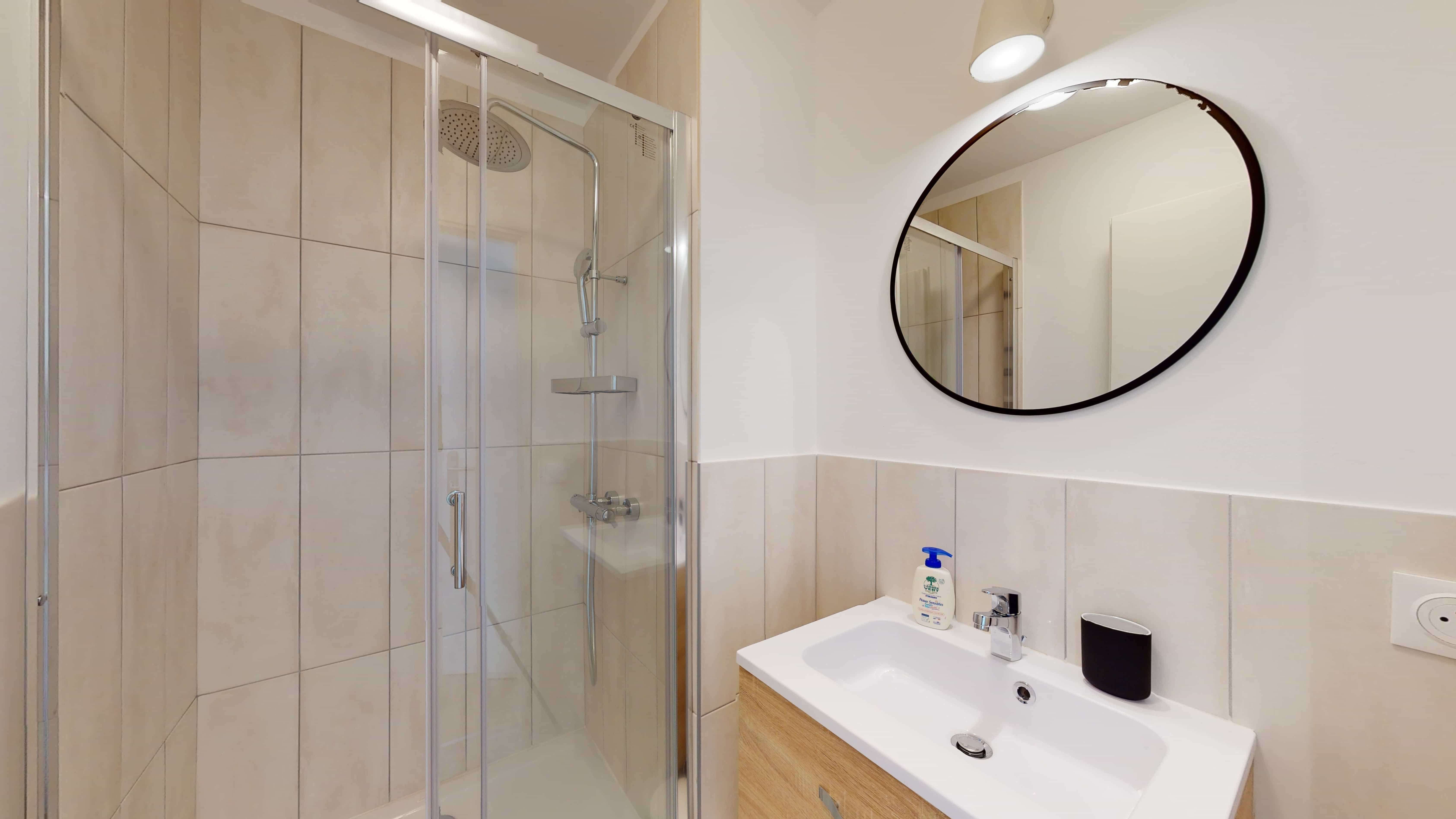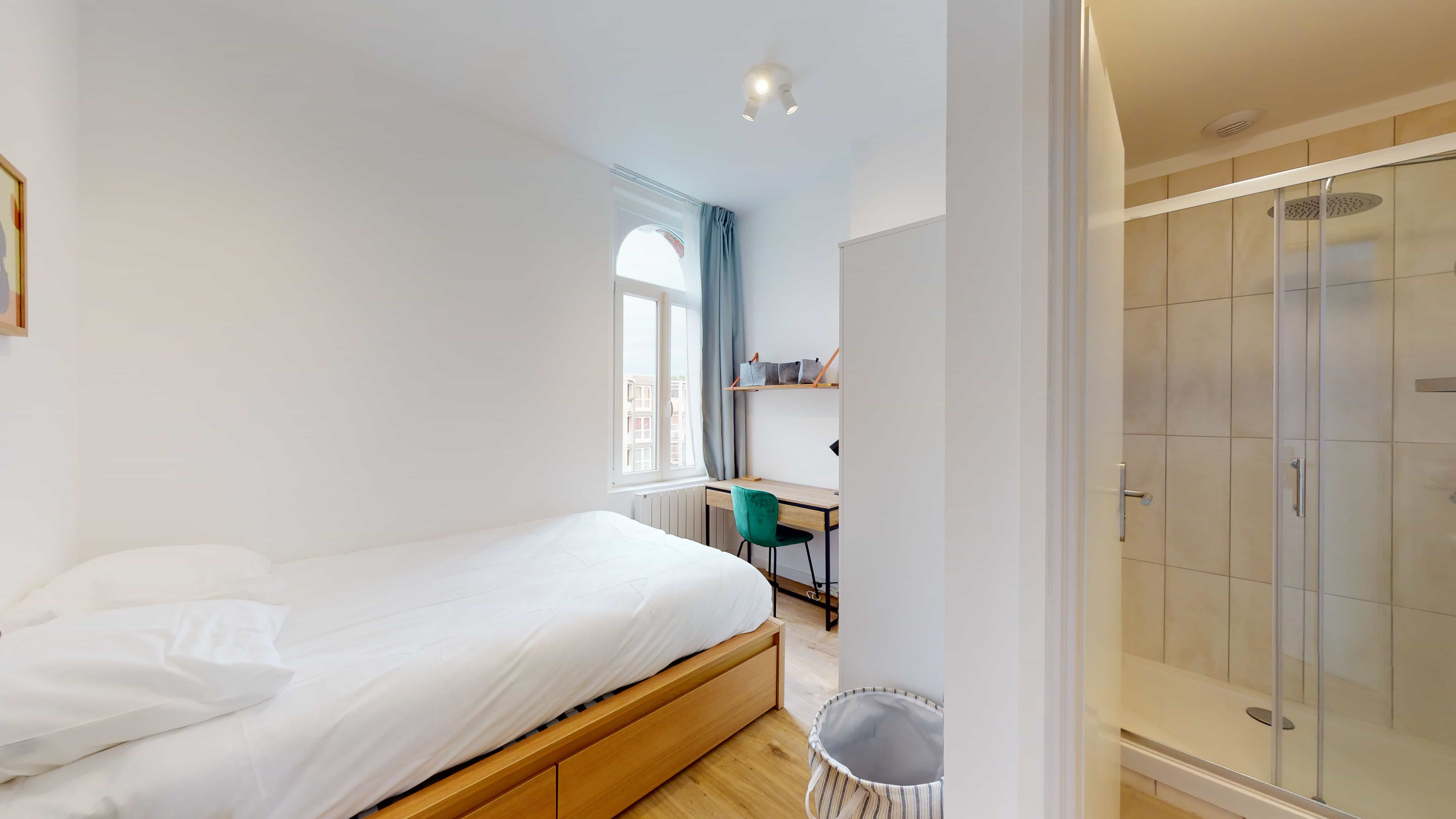 La chambre "Room for one person - 10", située au 2e étage, est un cocon personnel de 12m2 conçu pour votre confort. Elle est équipée d'un lit confortable avec rangement intégré, d'une penderie pour vos vêtements, d'un bureau avec lampe pour travailler ou étudier, et d'une chaise. La salle de bain privée comprend une douche et un lavabo, tandis que les toilettes sont partagées avec un autre locataire.