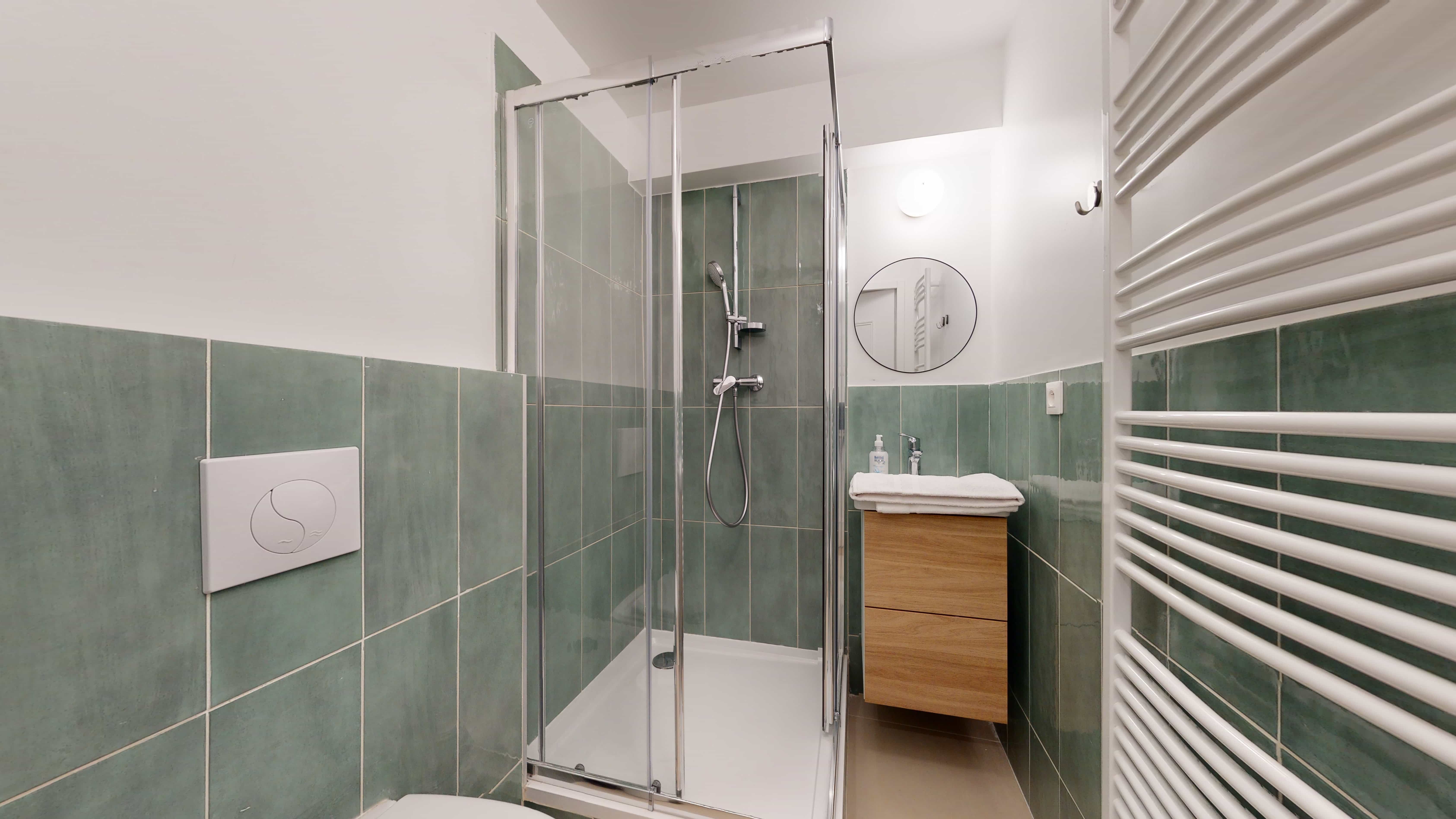 La chambre "Room for one people - 2" est un cocon douillet situé au rez-de-chaussée avec un accès direct à la terrasse. Cette unité privative de 21m² est parfaitement équipée pour votre confort : un lit double avec literie de qualité, une armoire spacieuse pour vos affaires, un bureau et une chaise pour travailler ou étudier, ainsi qu'une lampe de bureau. La salle de bain privative comprend une douche moderne où vous pourrez vous rafraîchir en toute intimité.