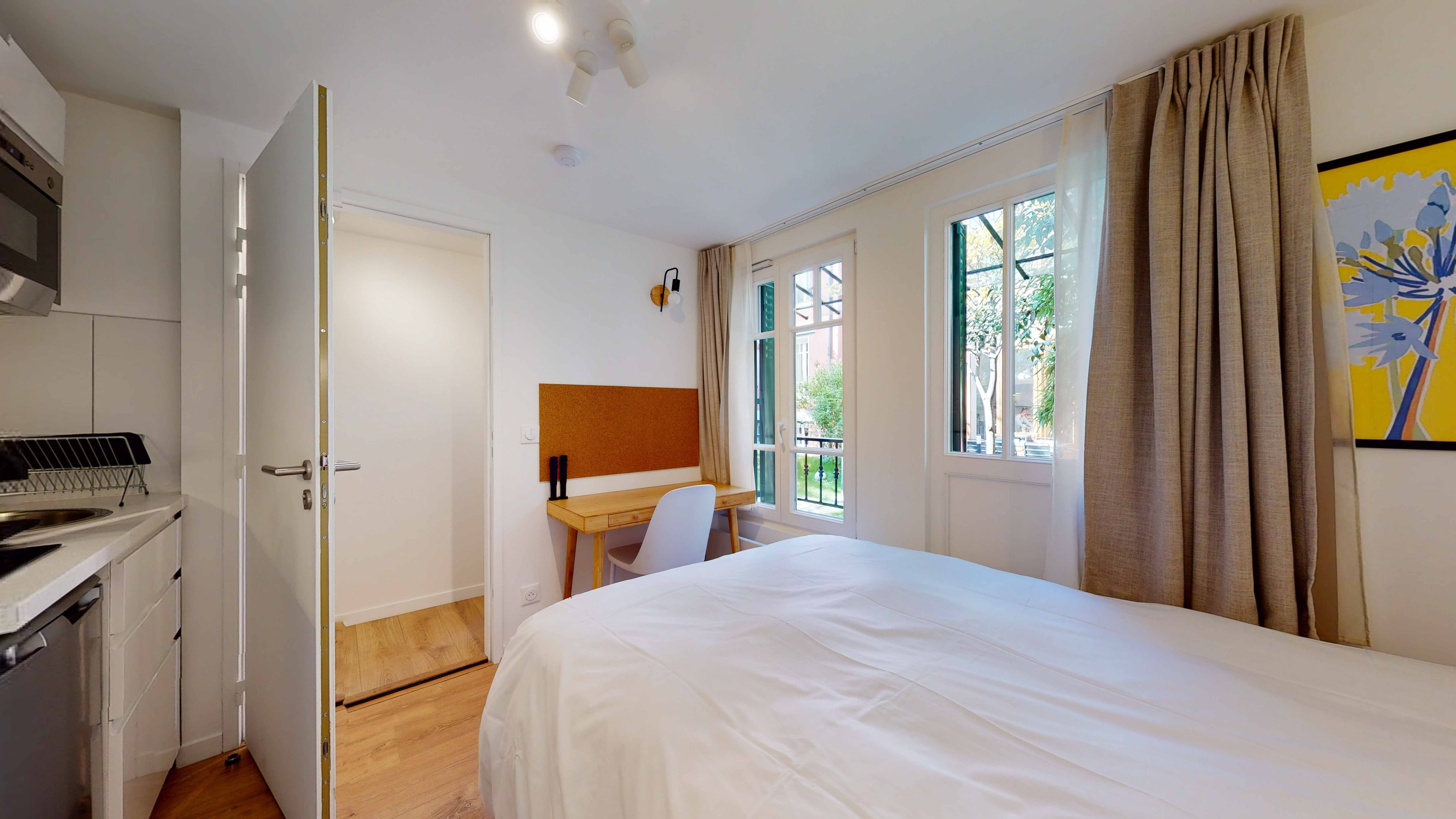 Le Studio for one person - 11, situé au rez-de-chaussée de la dépendance, est parfait pour une personne. Avec ses 9m², il offre tout le confort nécessaire : un lit confortable avec literie de qualité, un bureau et une chaise pour travailler, une penderie pour vos vêtements et même un lit double avec rangement. La kitchenette privée est équipée d'un mini-frigo, d'un micro-onde, de plaques de cuisson et d'une hotte, sans oublier l'évier et tout le nécessaire pour cuisiner et manger. La salle de bain privative comprend une douche moderne.