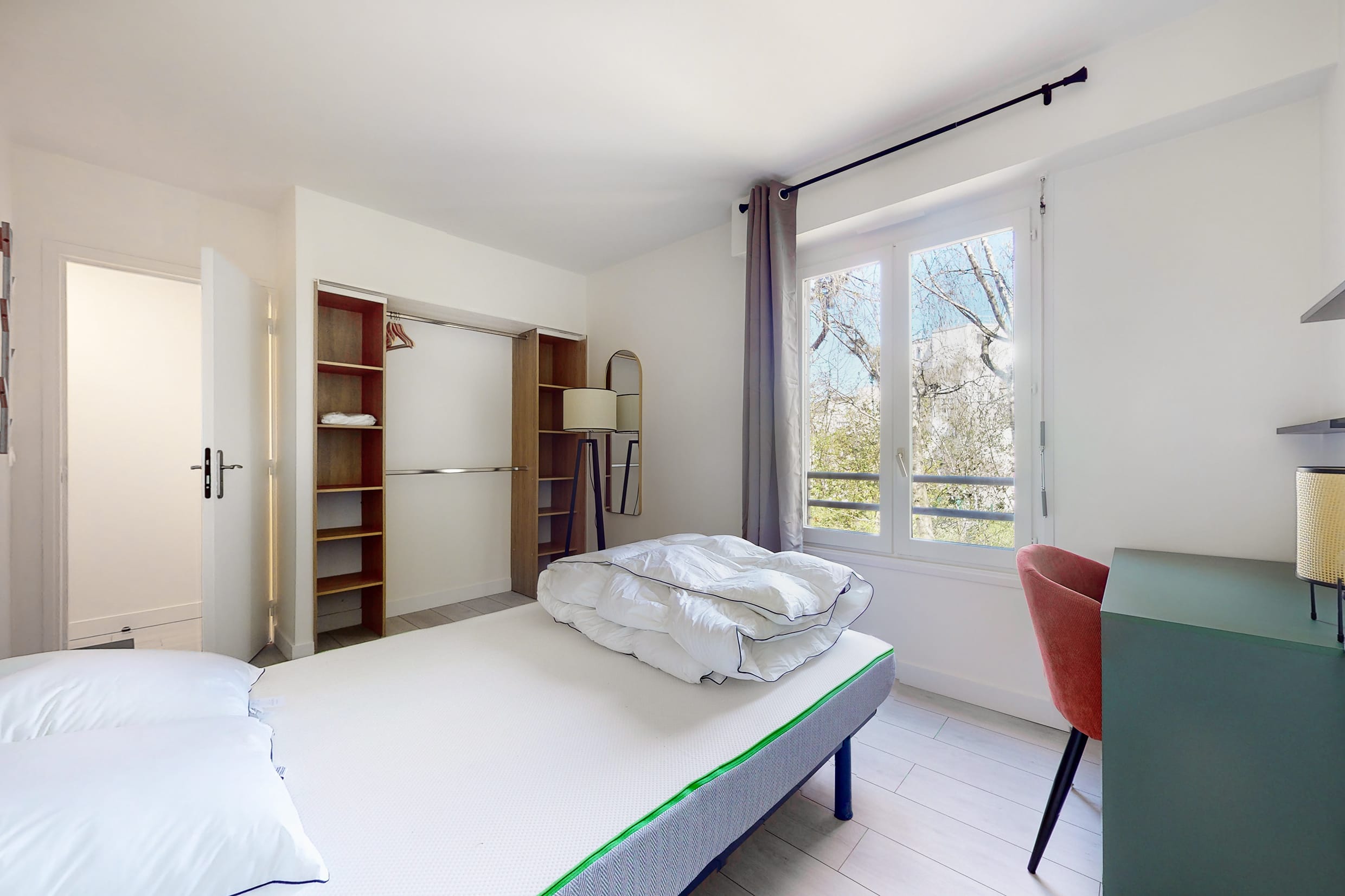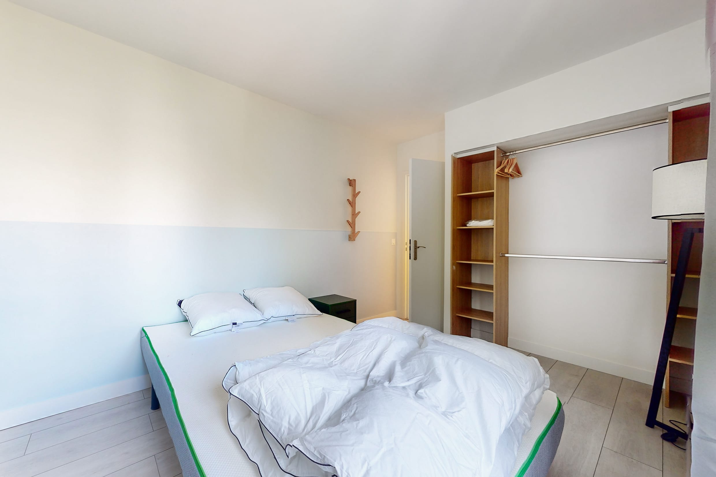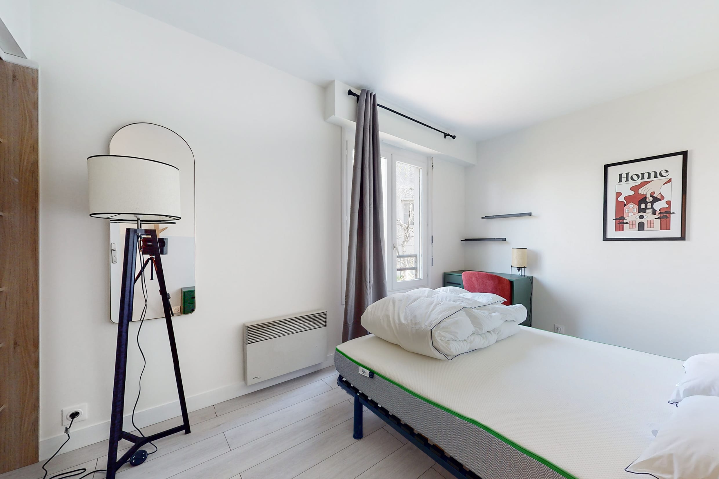 La chambre Room 5 est spécialement conçue pour une personne. Elle est meublée d'un lit double confortable, d'une armoire pour vos vêtements, d'un bureau et d'une chaise pour travailler ou étudier, ainsi que de tous les accessoires nécessaires tels qu'une lampe de bureau et une lampe de chevet. Vous partagerez une salle de bain propre et moderne avec les autres locataires.