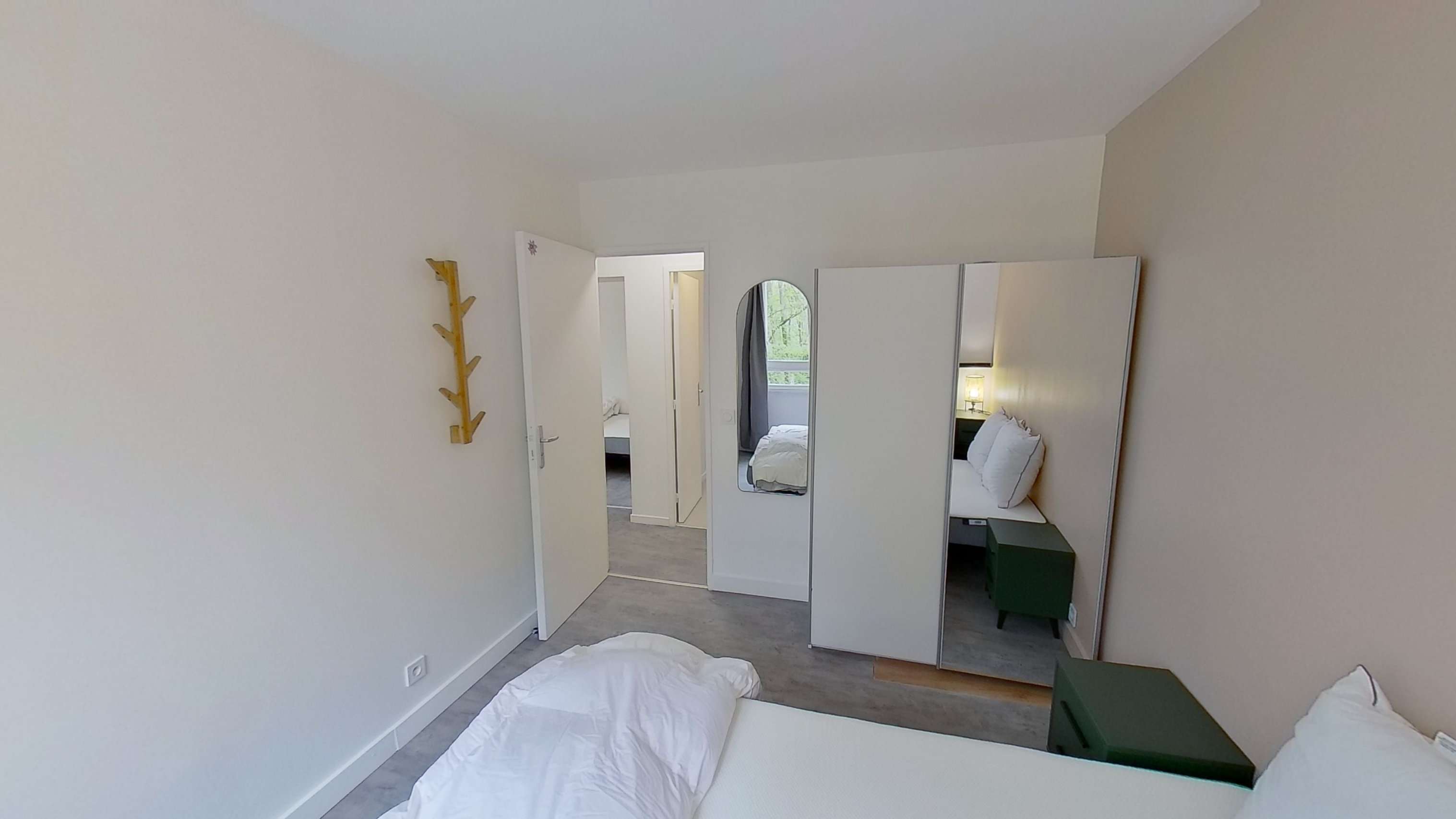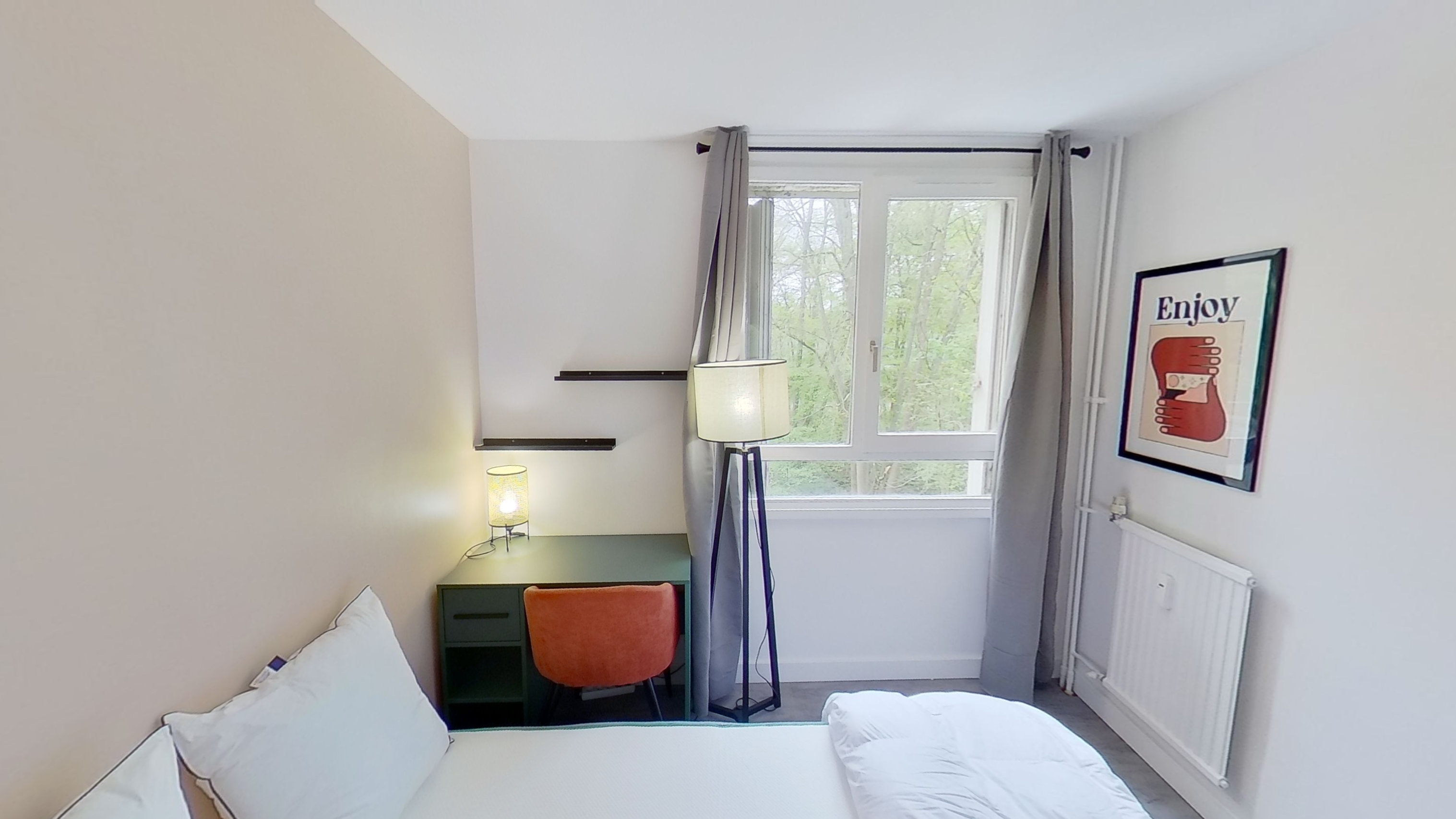 La chambre Room 1 est un cocon confortable pour une personne, avec un lit double douillet, une armoire pour vos vêtements, et un bureau pour travailler ou étudier en toute tranquillité. La chambre bénéficie d'une belle lumière naturelle et partage une salle de bain moderne avec d'autres locataires.