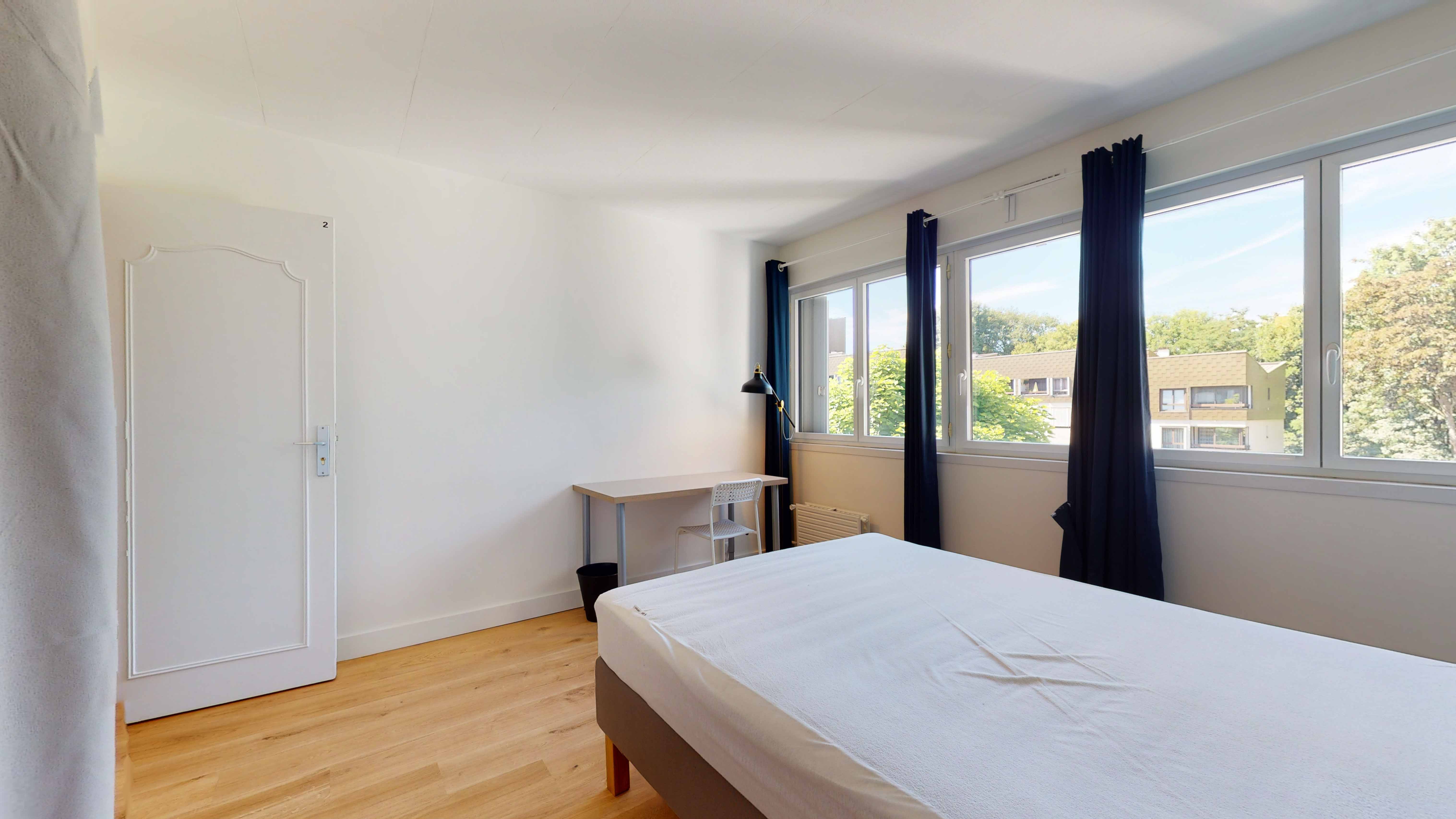 Room 2 est votre espace privé juste pour vous. Cette chambre de 10m² est aménagée avec tout ce dont vous avez besoin : un lit double pour bien dormir, une armoire pour vos vêtements, une chaise et un bureau pour travailler ou étudier. En plus, vous partagerez une salle de bain propre et moderne avec douche et toilettes.