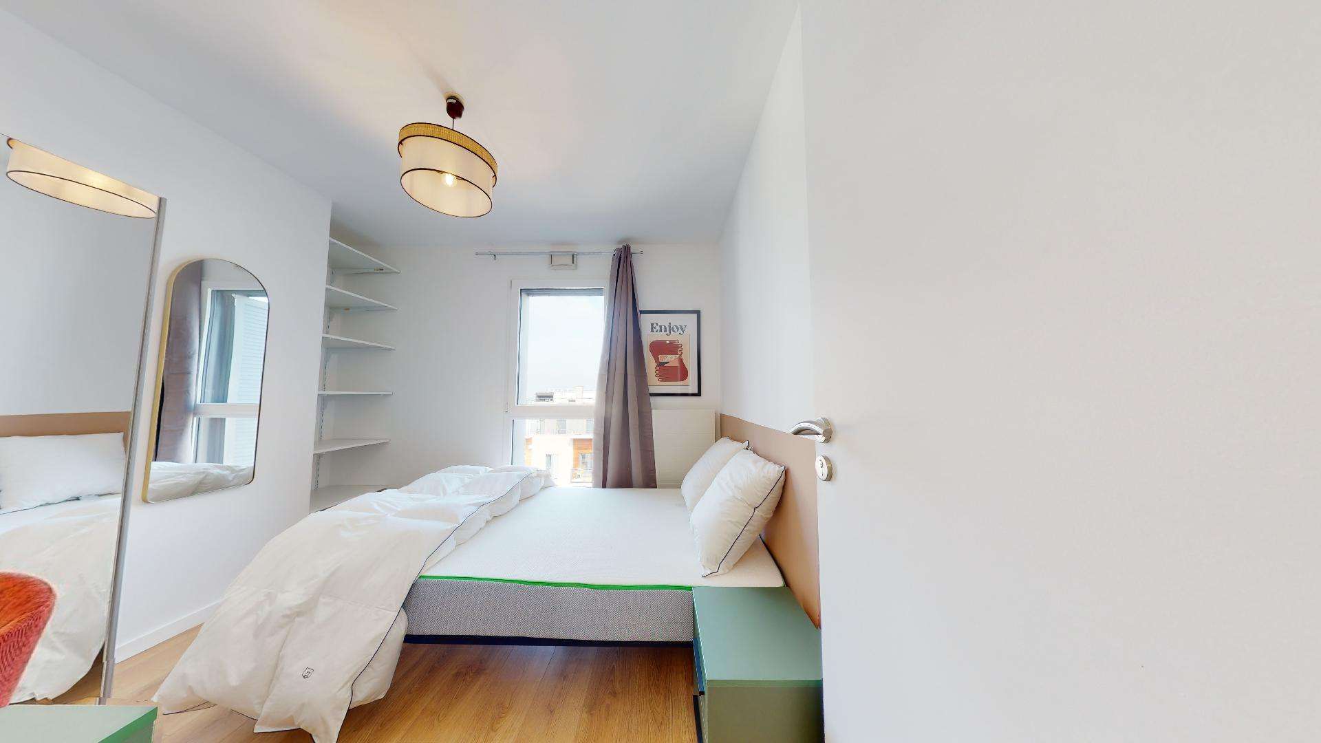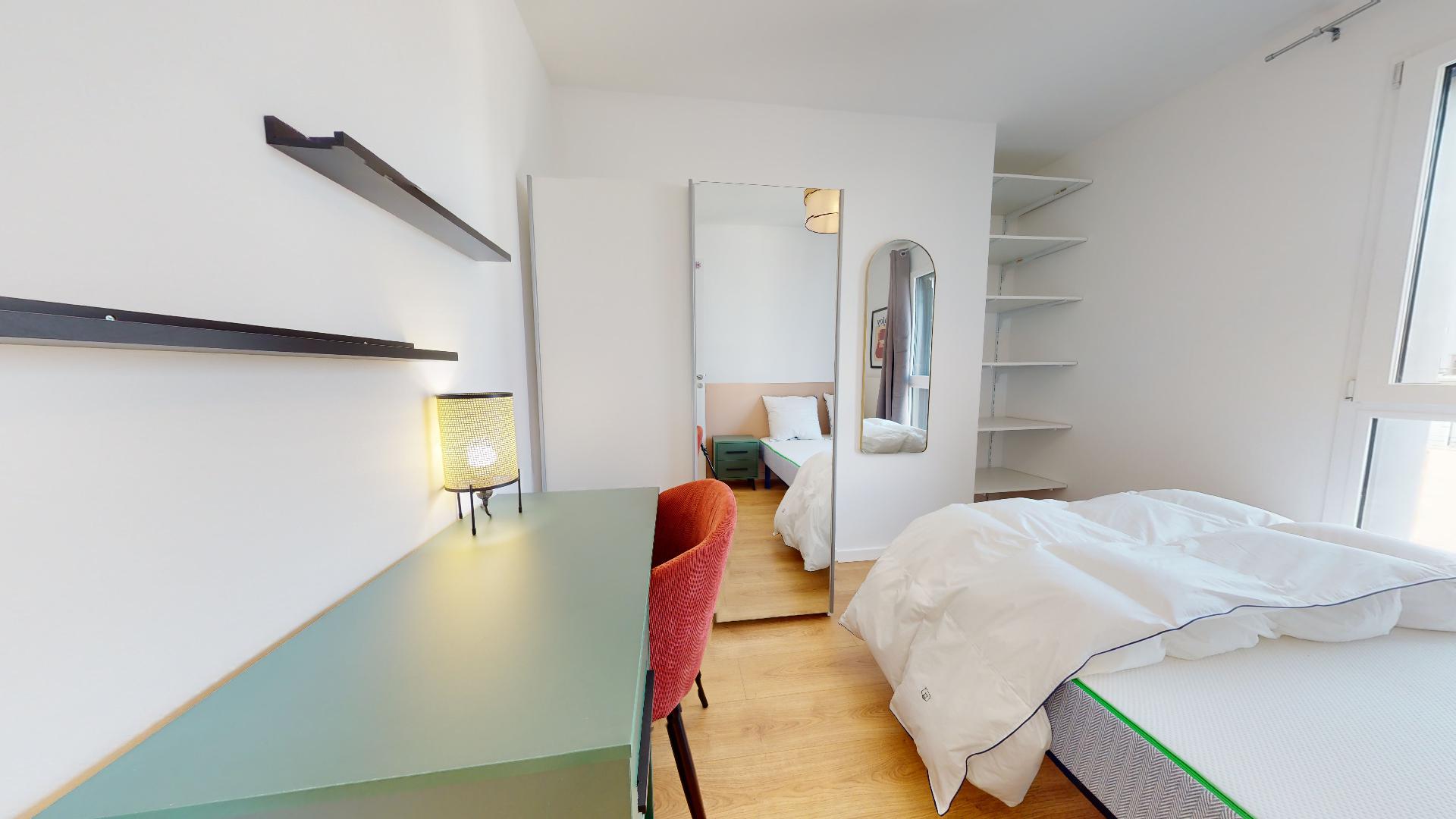 La chambre "Room 1" est votre espace personnel parfait pour se détendre et étudier. Elle est aménagée avec un lit double confortable, une armoire pour vos vêtements, une chaise et un bureau pour travailler. La chambre partage une salle de bain bien équipée avec d'autres colocataires, offrant intimité et commodité.