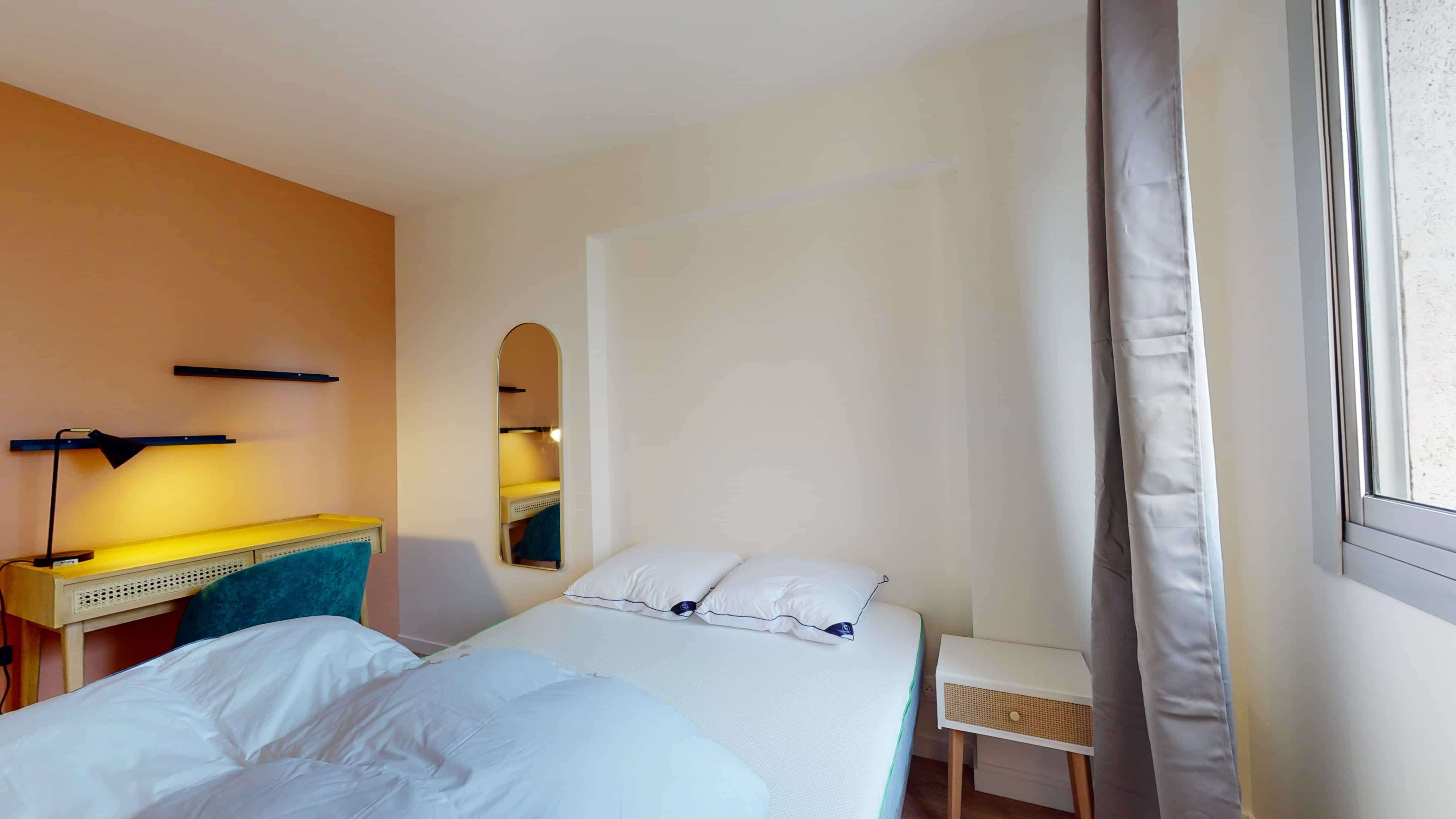 La chambre Room 2 est idéale pour une personne avec son lit double confortable, une grande armoire pour ranger toutes vos affaires, un bureau et une chaise pour travailler ou étudier. La chambre mesure 10 m² et bénéficie d'une salle de bain partagée qui comprend une douche, un lavabo et des toilettes.