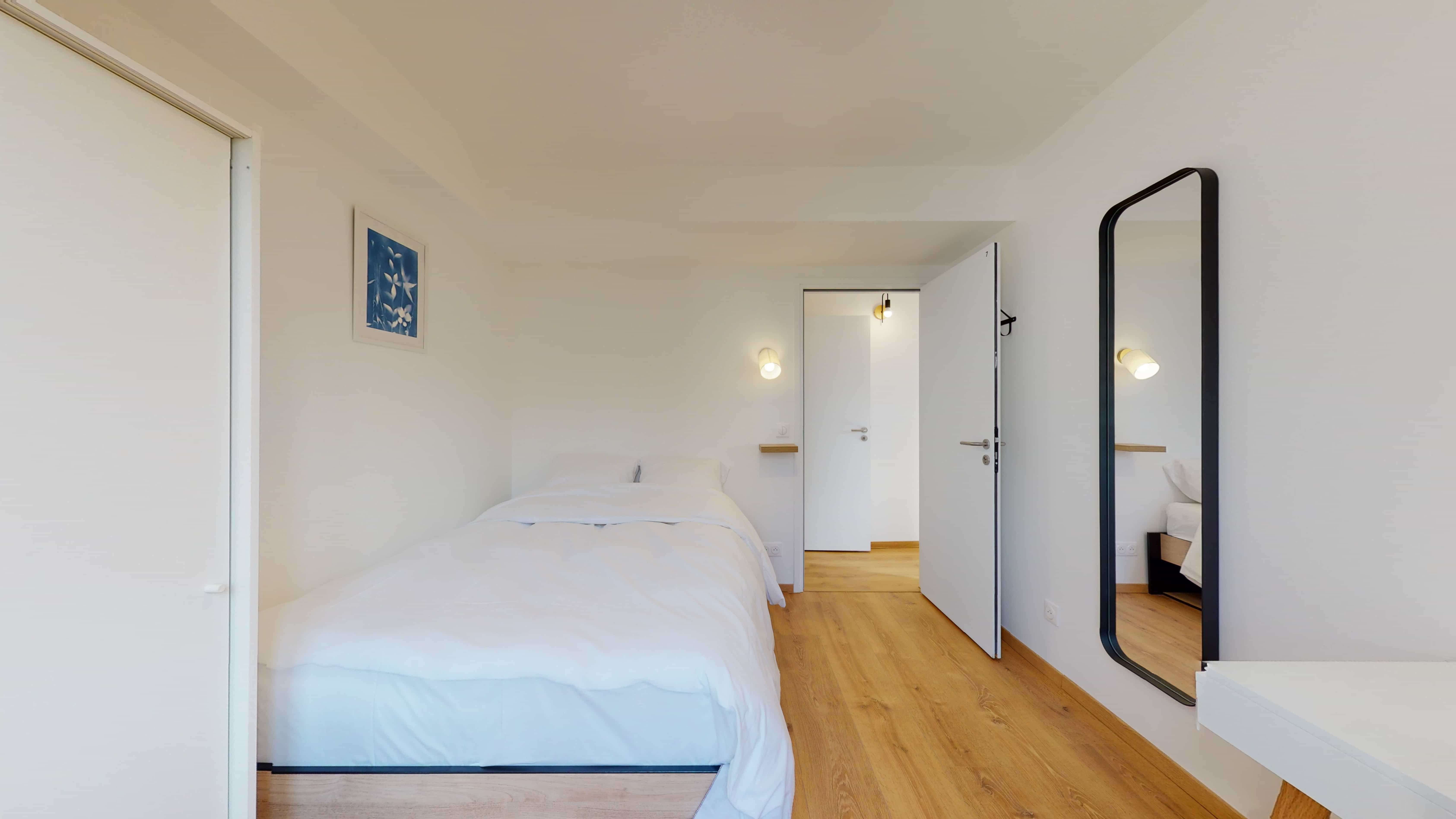 La chambre "Room for one person - 7", située au premier étage, est conçue pour offrir confort et intimité. Elle est meublée d'un lit double avec rangement intégré, d'une armoire pour vos vêtements, d'une chaise confortable et d'un bureau pour travailler ou étudier. La chambre partage une salle de bain moderne avec douche avec un autre locataire. Vous y trouverez également un radiateur pour les jours plus frais et tout le nécessaire de literie de qualité.