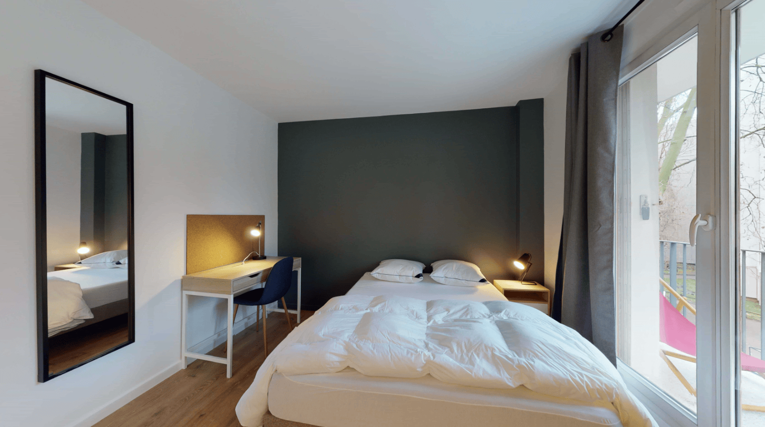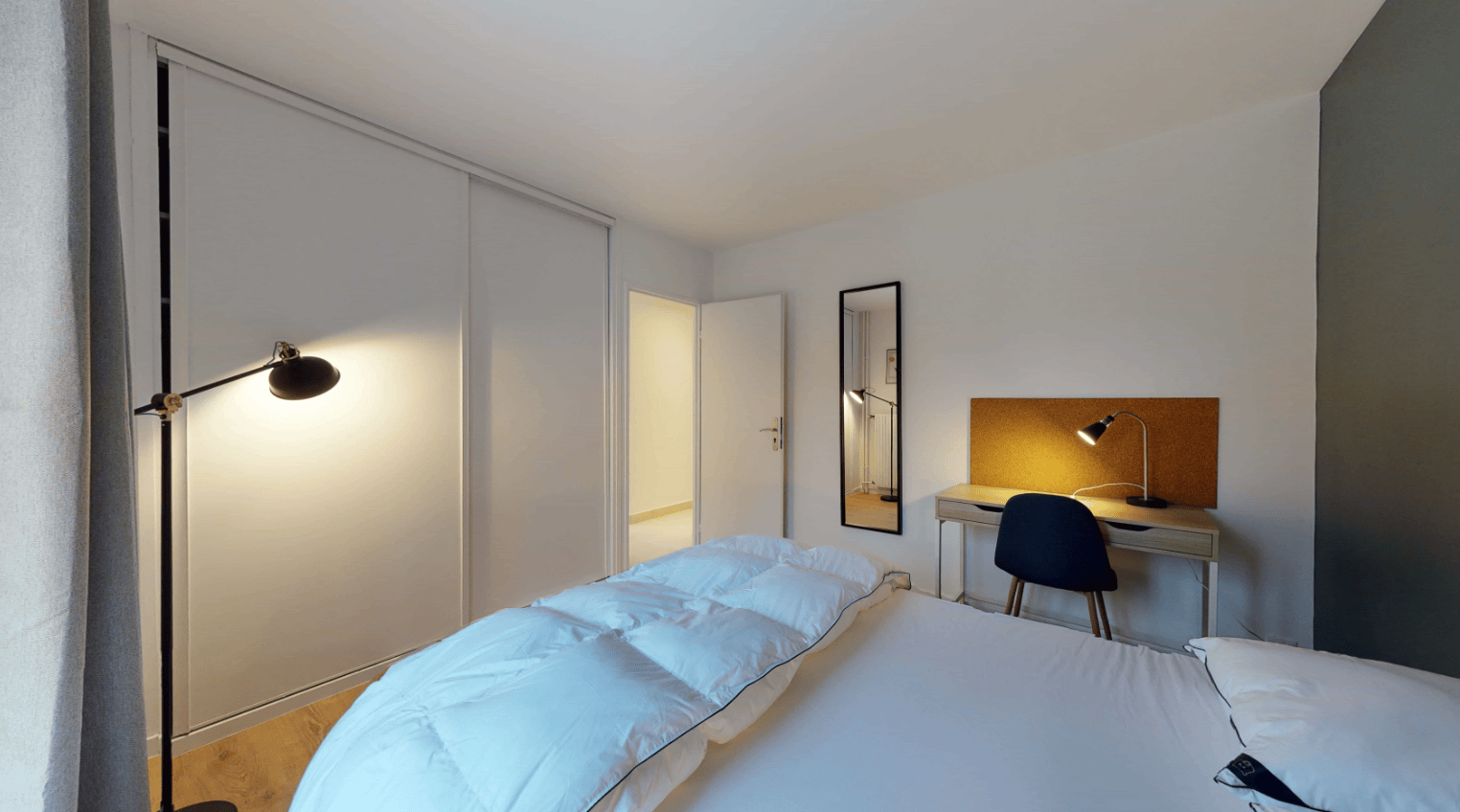 La chambre Room 2, d'environ 11 m², est parfaitement meublée pour une personne. Elle comprend un lit double confortable, une armoire pour vos affaires, un bureau pour travailler et une chaise. La chambre bénéficie d'un balcon privé et partage une salle de bains moderne avec d'autres locataires. Vous aurez tout ce qu'il faut pour être à l'aise.