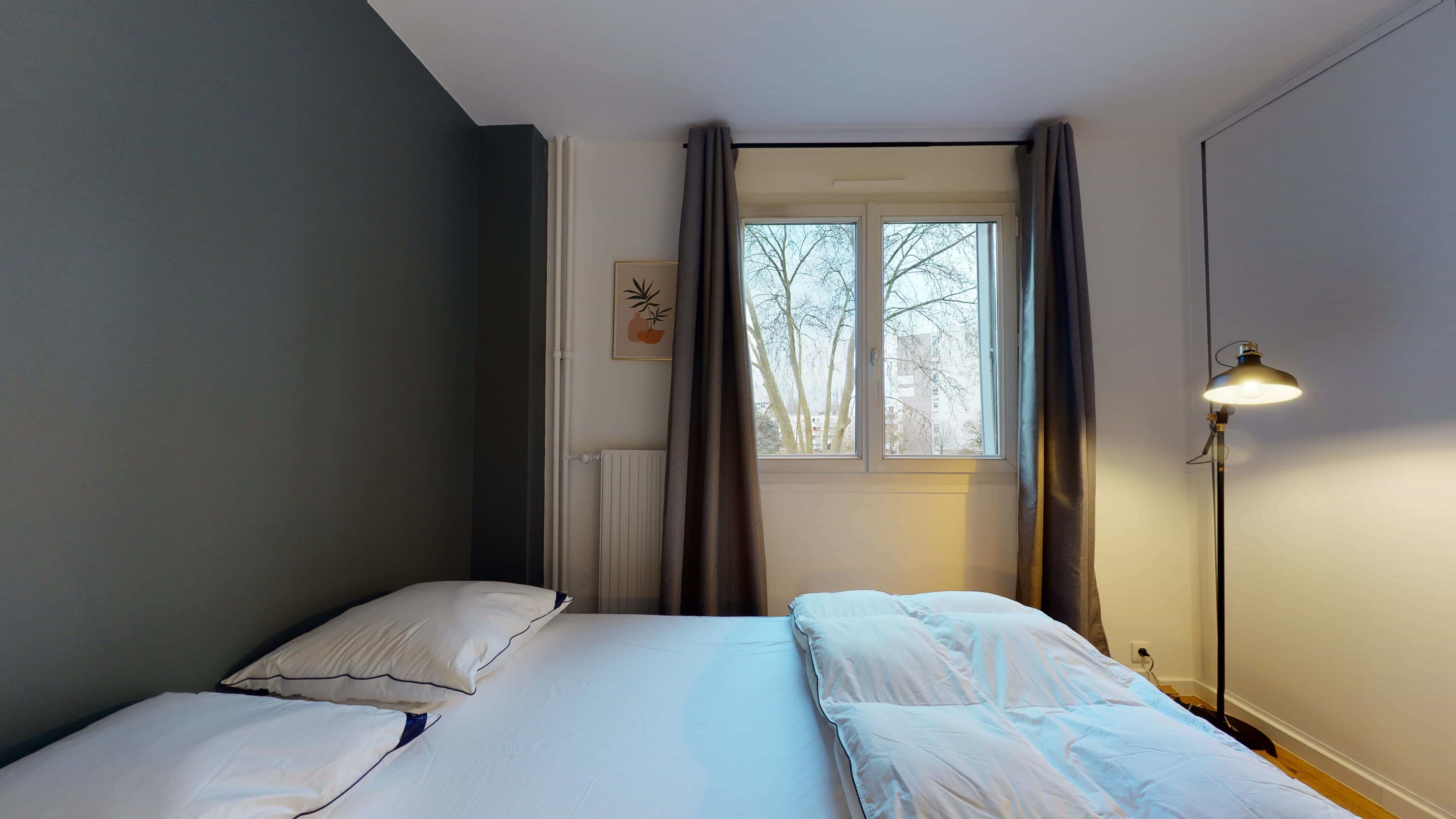 La chambre 3 est spécialement conçue pour une personne. Avec ses 9 m², elle offre un lit double confortable, une armoire pour ranger vos affaires, ainsi qu'un bureau et une chaise pour travailler ou étudier. De plus, vous avez un accès direct à une terrasse privée pour vous détendre après une journée bien remplie.