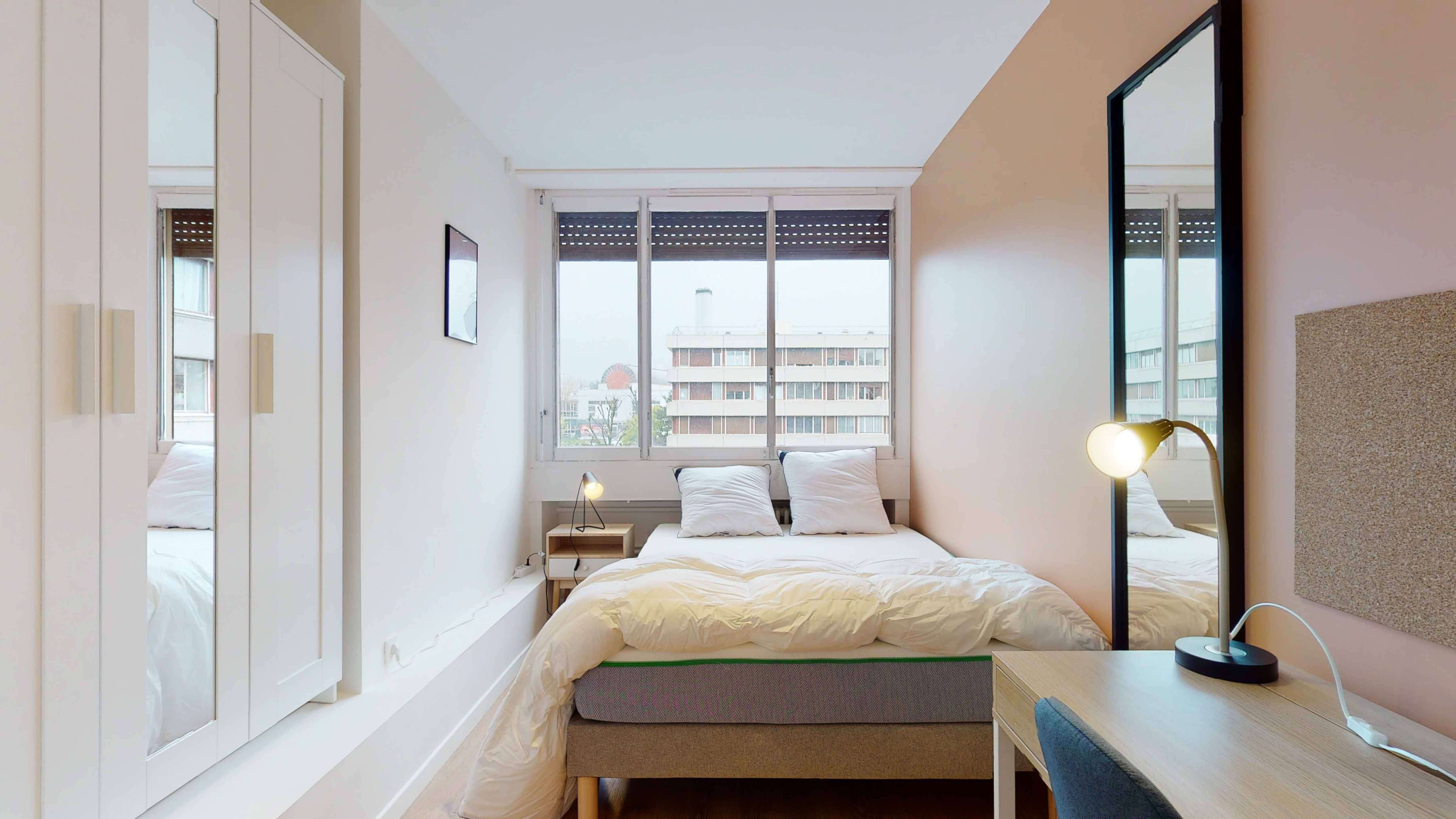 Room 1 est spécialement aménagée pour vous offrir un espace personnel agréable et fonctionnel. Elle est composée d'un lit double confortable, d'une armoire pour vos affaires, d'une chaise, et d'un bureau pour travailler ou étudier. La chambre partage une salle de bain propre et moderne avec d'autres locataires.