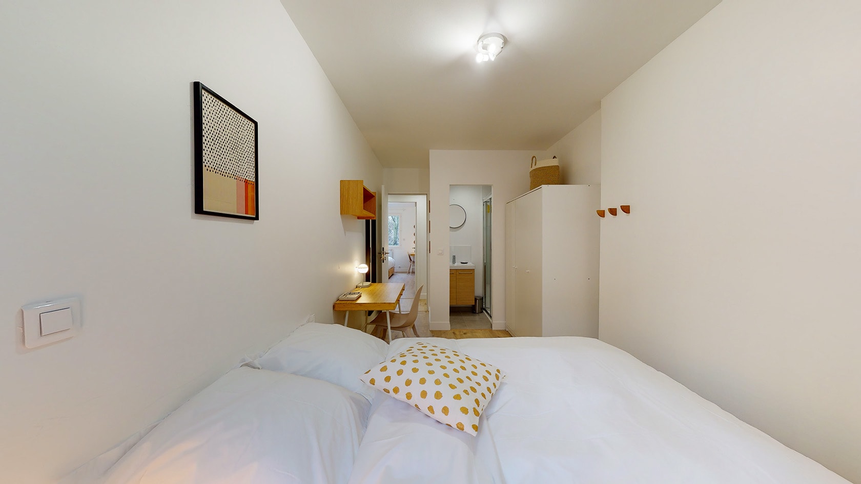 La Chambre 2, située au rez-de-chaussée, est parfaite pour une personne. Elle est meublée d'un lit double avec rangement intégré, d'une penderie spacieuse pour vos affaires, ainsi que d'une table et une chaise pour travailler ou étudier confortablement. La chambre bénéficie d'une salle de bain privée avec douche et lavabo. Les toilettes sont partagées avec un autre locataire.