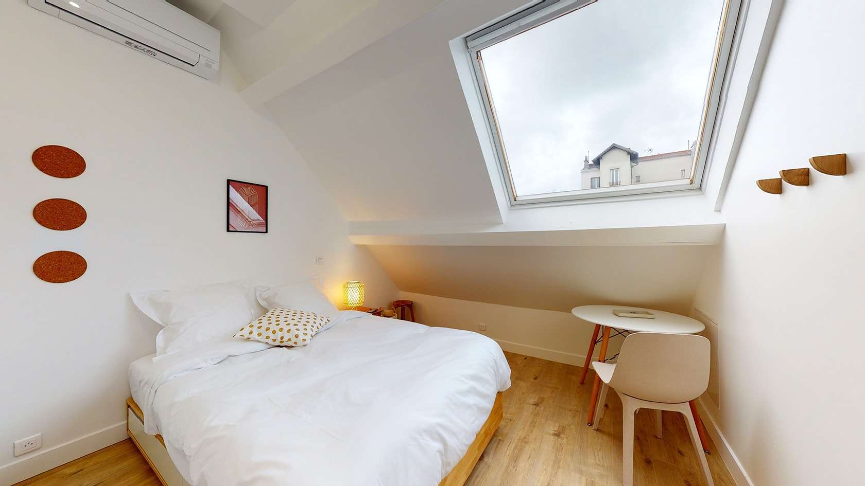 La Chambre 8, située au deuxième étage, est un cocon juste pour vous. Elle est équipée d'un confortable lit double avec rangement intégré, d'une penderie spacieuse pour vos affaires, d'une table et d'une chaise pour travailler ou écrire. La chambre dispose aussi d'une salle de bain privée avec douche, offrant intimité et confort. L'air conditionné vous permettra de rester au frais pendant les chaudes journées d'été.