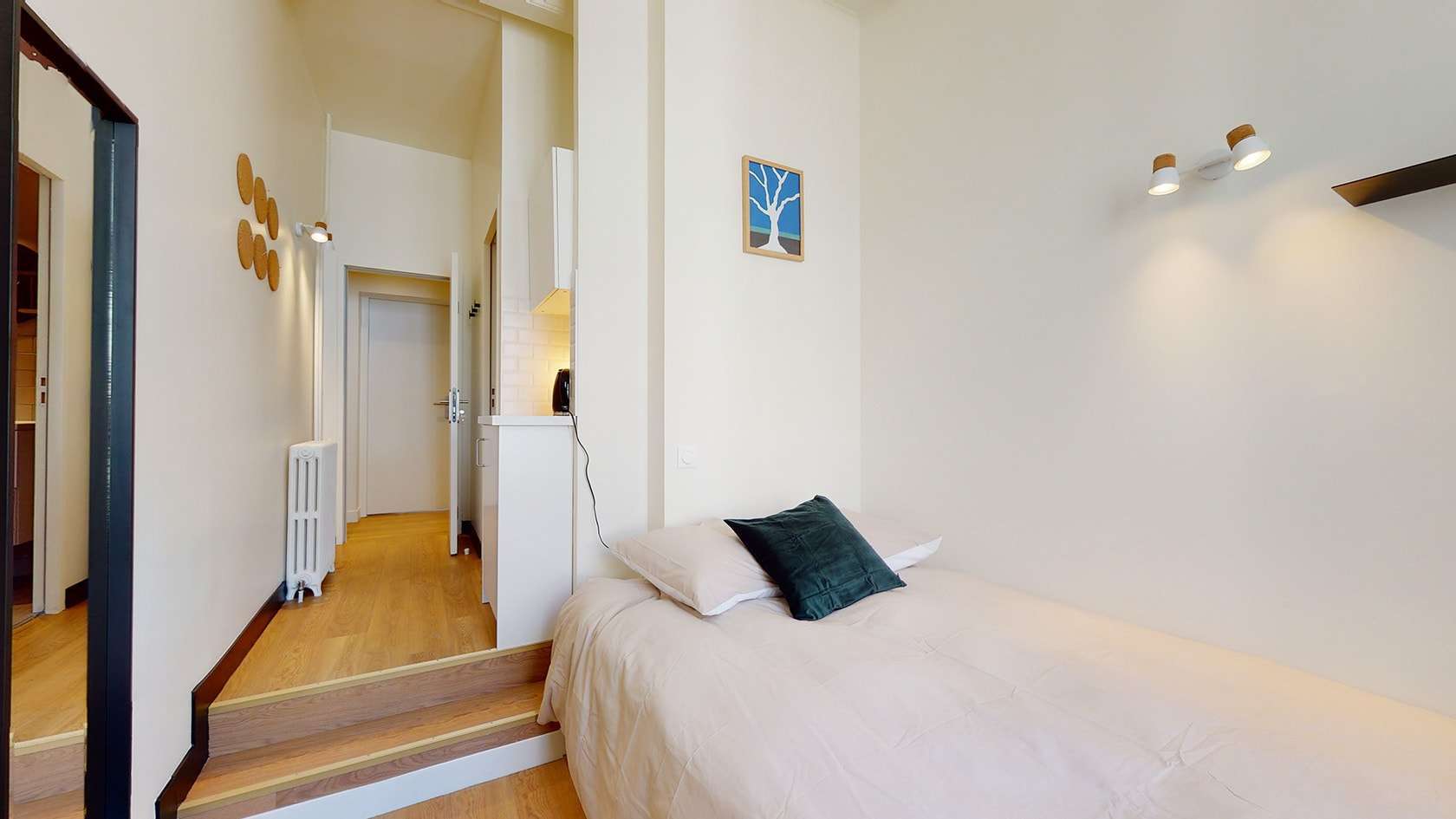 La chambre 8 est conçue spécialement pour une personne, offrant intimité et confort avec sa salle de bain privée comprenant une douche. Vous y trouverez un lit avec rangements intégrés, une penderie spacieuse, une table pratique pour travailler ou étudier, ainsi qu'une chaise confortable. La chambre est également équipée d'un radiateur pour les jours plus frais, d'une lampe de chevet pour vos lectures nocturnes, d'un petit frigo pour vos en-cas et d'une bouilloire pour vos pauses thé ou café. La literie de qualité vous promet de douces nuits.