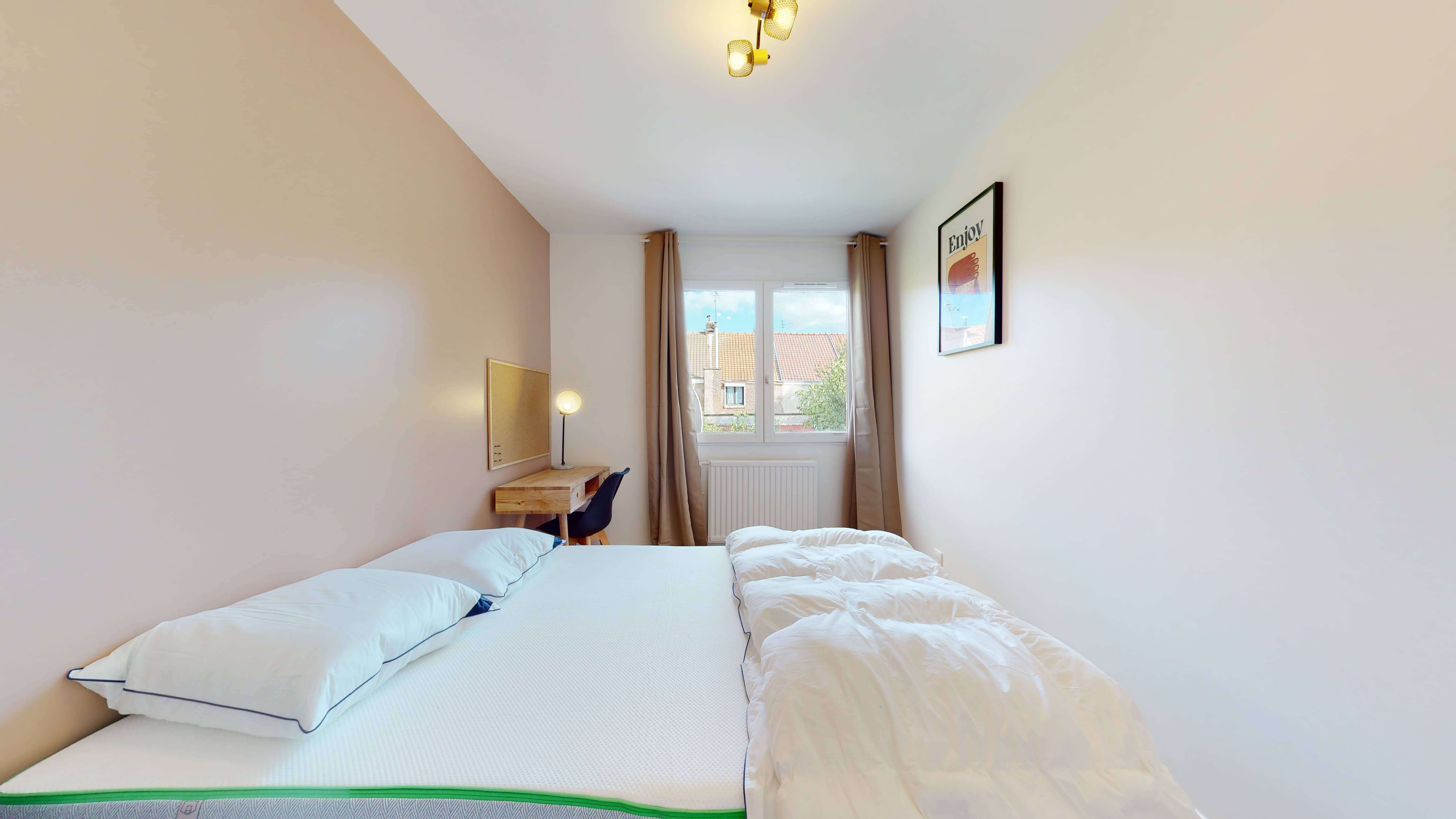 La chambre 3, spécialement conçue pour une personne, est un cocon douillet de 11 m². Elle est meublée avec un lit double confortable, une armoire spacieuse, un bureau pratique pour travailler et une chaise. Vous bénéficiez également d'une salle de bain partagée équipée d'une douche, d'un lavabo et de toilettes. La chambre est agréablement chauffée grâce à son radiateur et éclairée par une lampe de chevet.