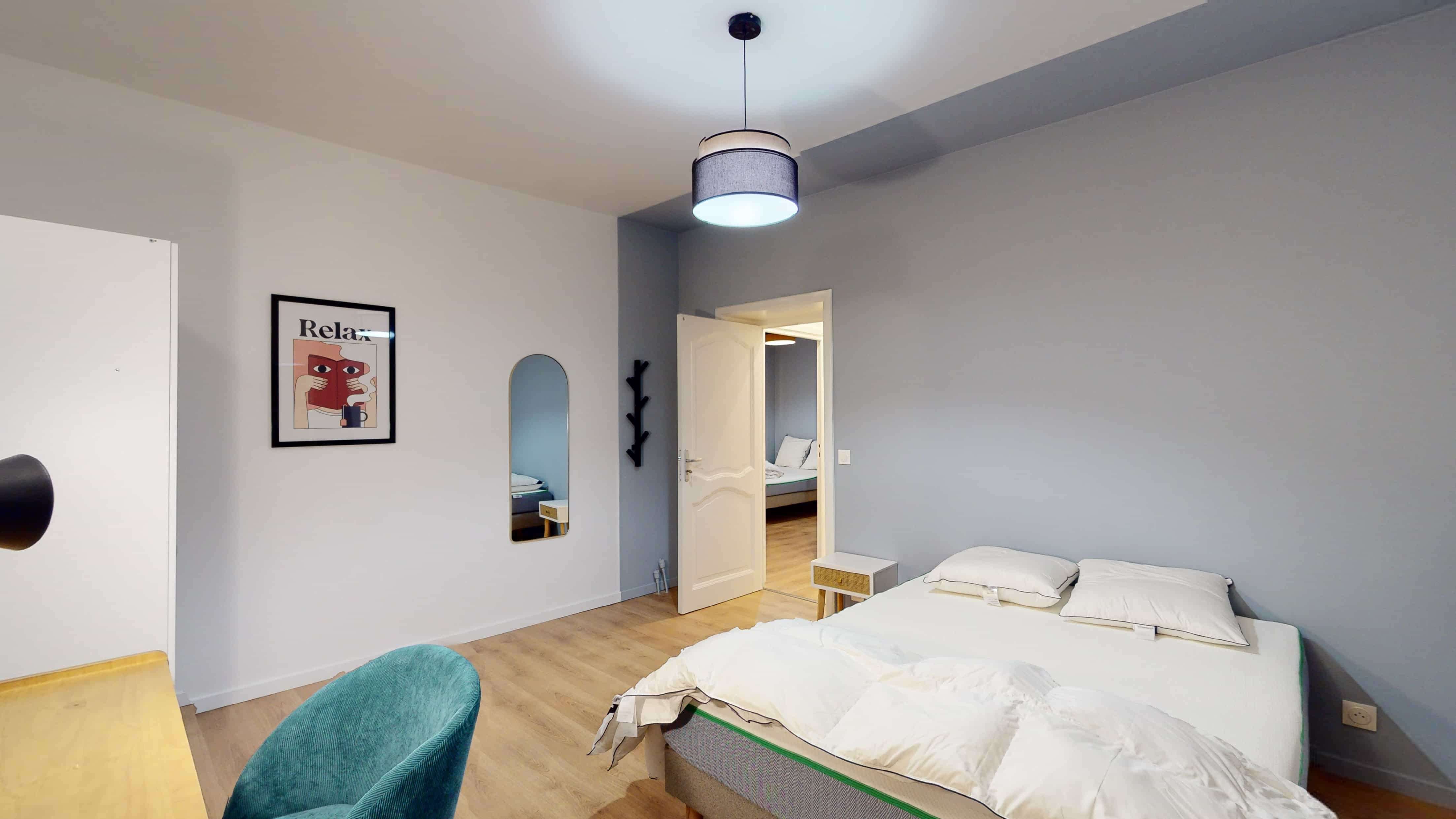 La chambre Room 6, d'une superficie de 15m², est parfaite pour une personne. Elle est meublée d'un confortable lit double, d'une armoire pour vos affaires, d'une chaise et d'un bureau pour travailler ou étudier. Vous aurez également un accès à un balcon privé. La salle de bain est partagée avec d'autres locataires.