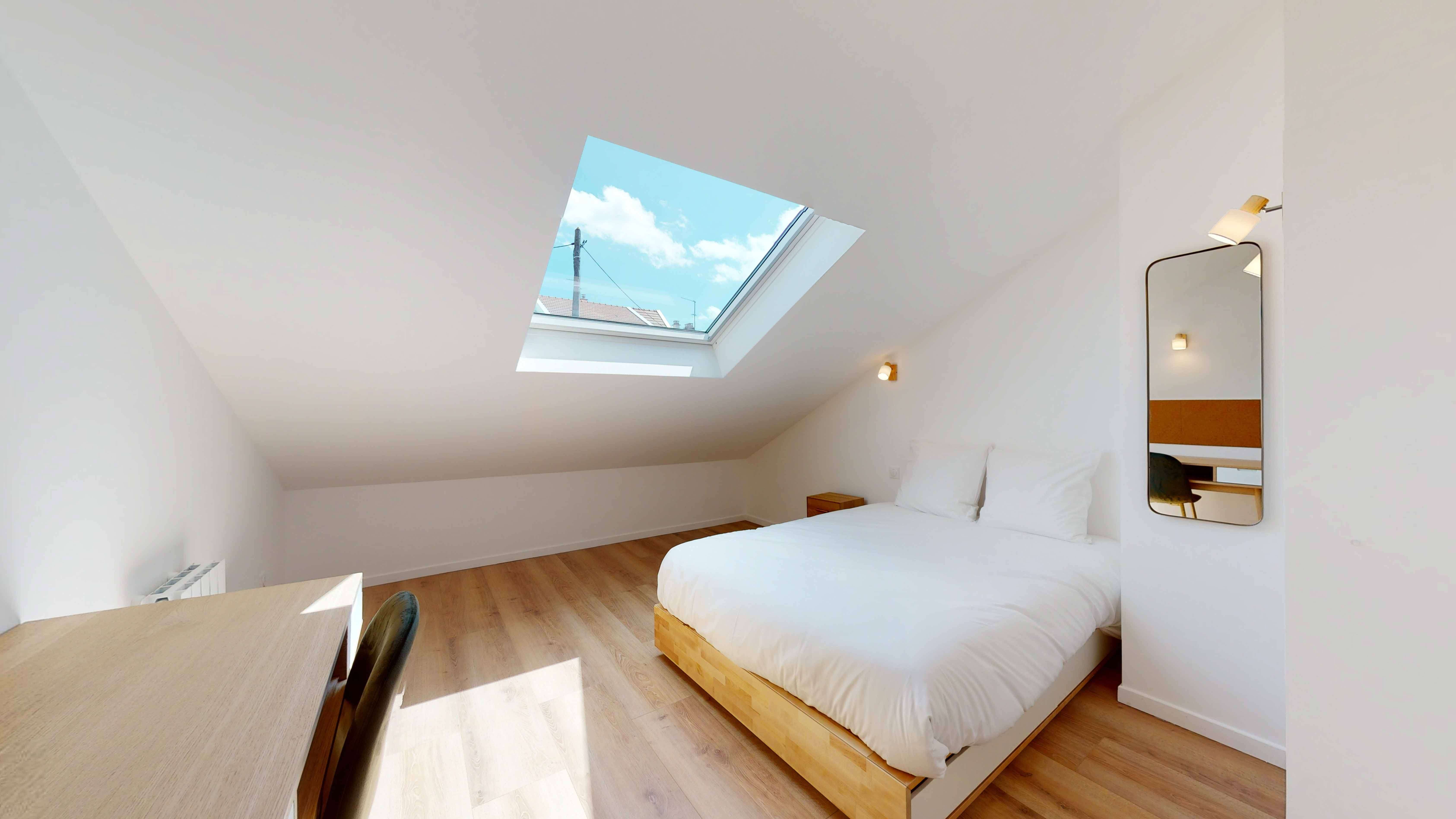 La chambre "Room for one person - 11" est un cocon douillet situé au premier étage. Elle est parfaite pour une personne avec son lit double confortable, sa table de nuit avec lampe, son bureau pour travailler ou étudier, et une armoire pour ranger vos affaires. La chambre partage une salle de bain moderne avec douche et lavabo avec un autre locataire.