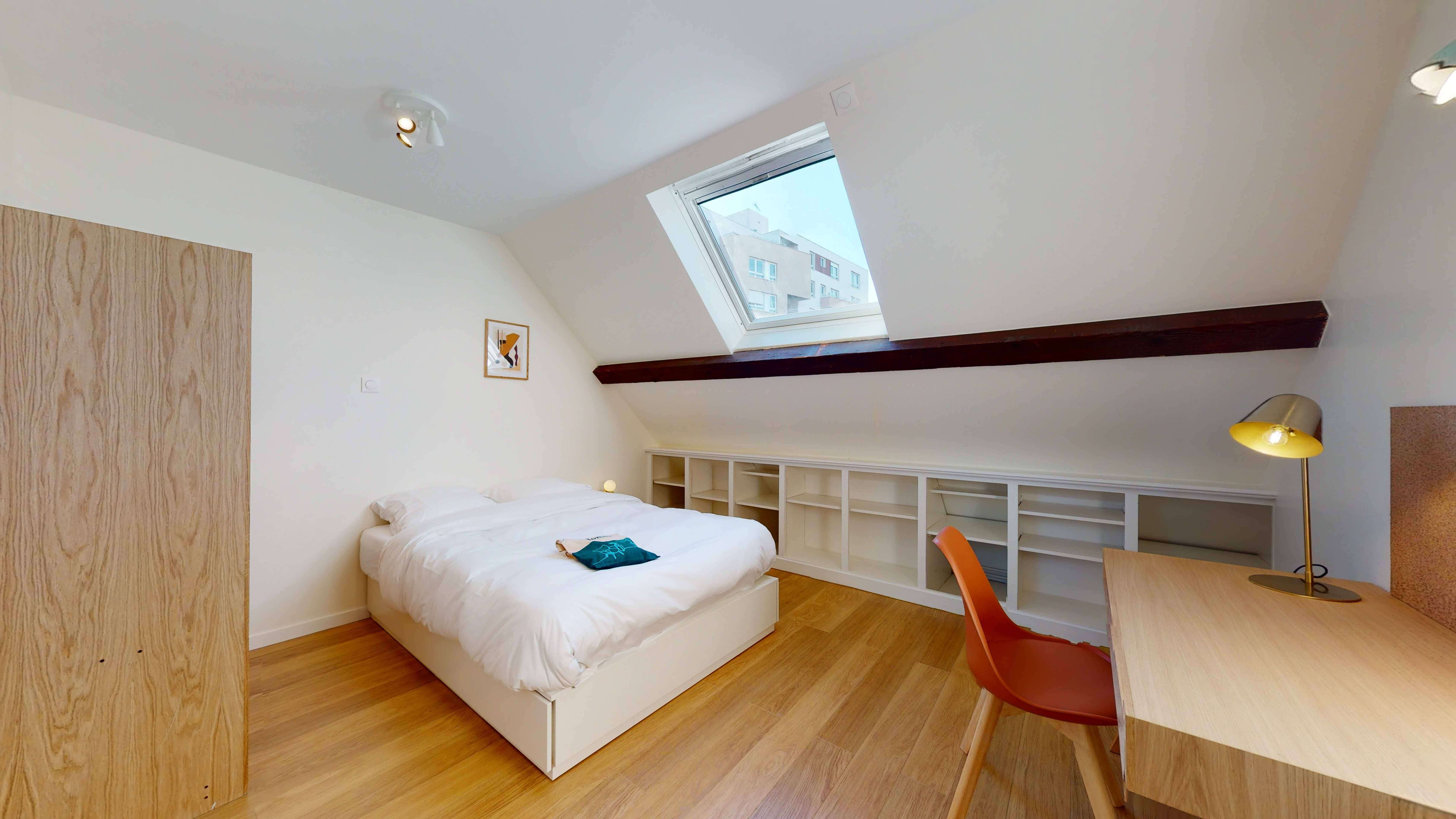 La chambre "Room for one person - 10" est un cocon douillet de 11m2 situé au premier étage. Elle est idéale pour une personne et partage une salle de bain moderne avec un autre locataire. La chambre est bien équipée avec un lit double confortable, une armoire pour vos affaires, une chaise et un bureau pour travailler ou étudier. Vous y trouverez également une lampe de bureau, une lampe de chevet et des draps propres.