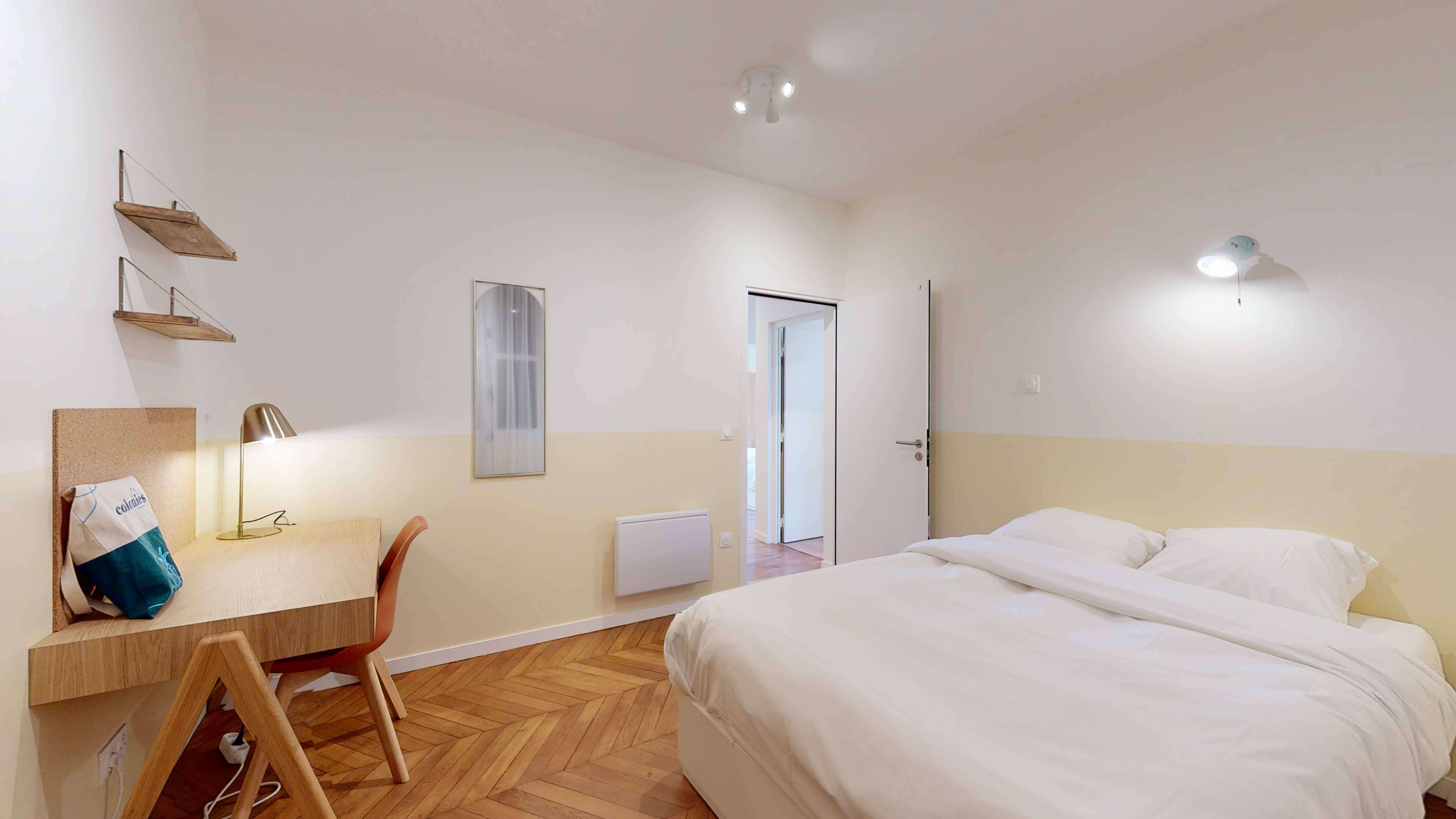 La chambre "Room for one person - 7" est un cocon douillet de 13m2 situé au rez-de-chaussée. Elle est parfaite pour une personne avec son lit double confortable, son bureau pour travailler ou étudier, une chaise, une armoire pour vos affaires et un radiateur pour rester au chaud. La chambre bénéficie d'une salle de bain partagée avec une autre personne, équipée d'une douche moderne.