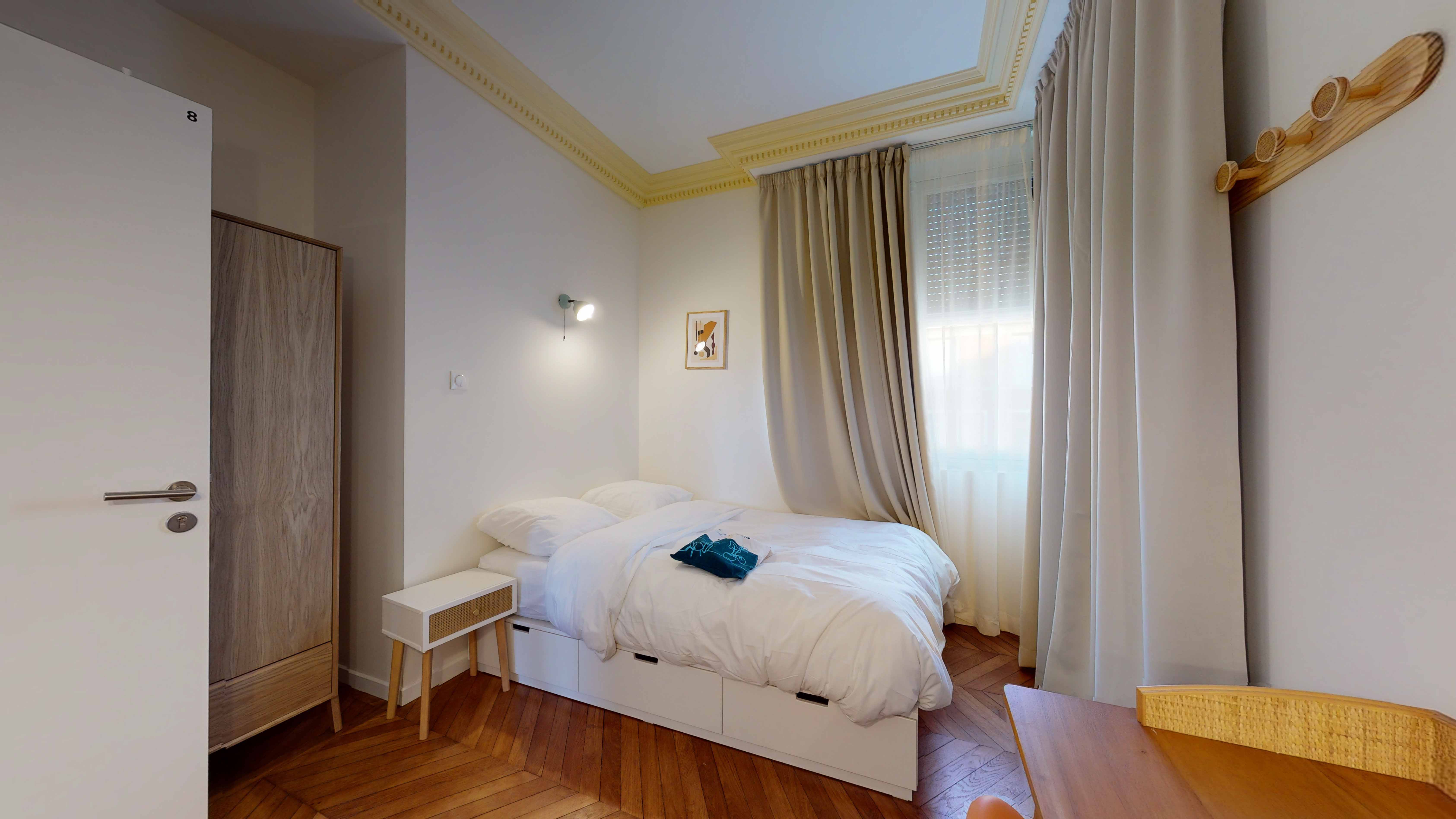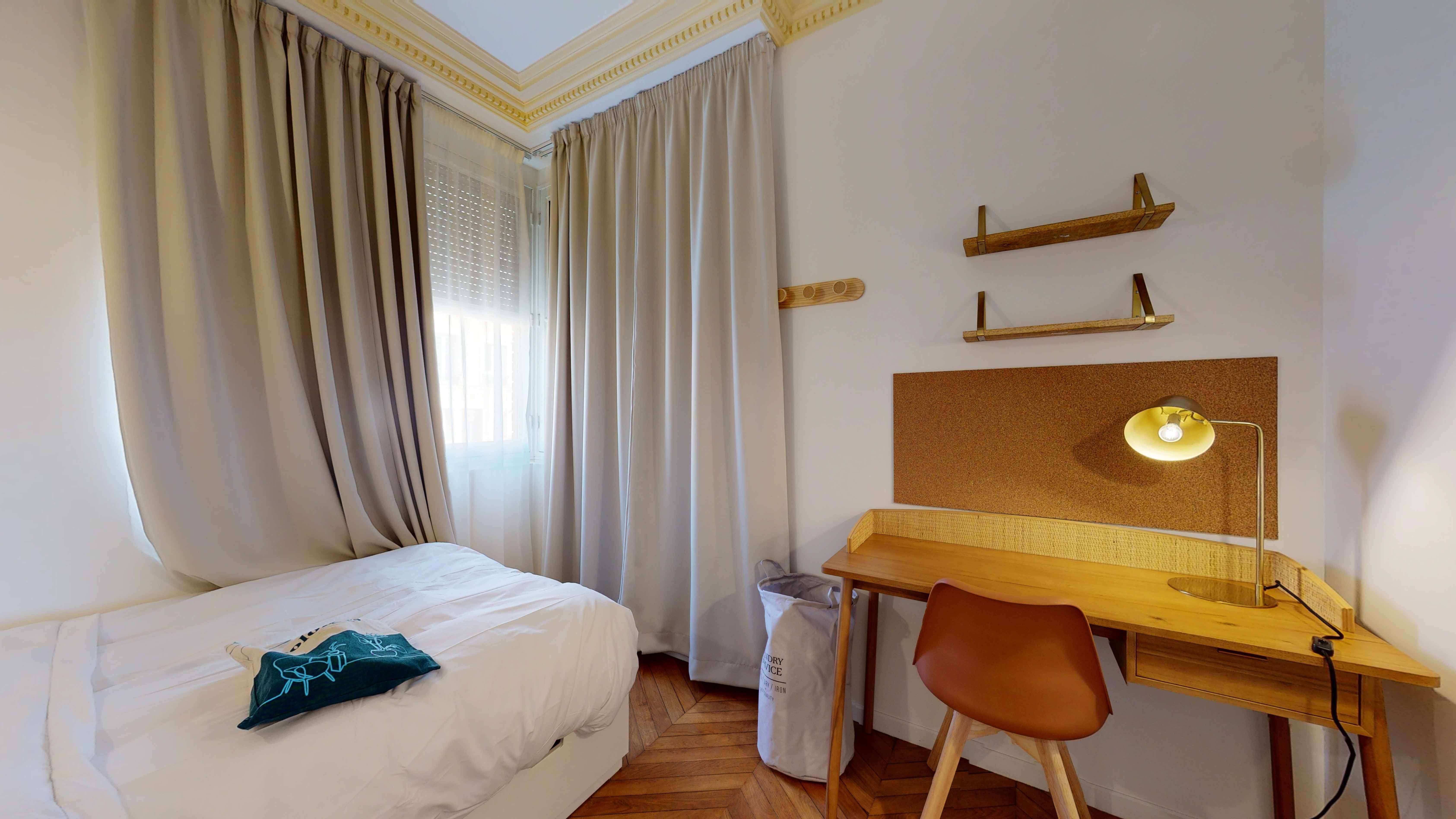 La chambre "Room for one person - 8" est un cocon douillet de 10m2 situé au rez-de-chaussée. Elle est meublée d'un lit double avec rangement intégré, d'une armoire pour vos affaires, d'un bureau et d'une chaise pour travailler ou étudier, ainsi que d'une lampe de bureau et d'une lampe de chevet. La salle de bain est partagée avec un autre locataire et comprend une douche moderne.