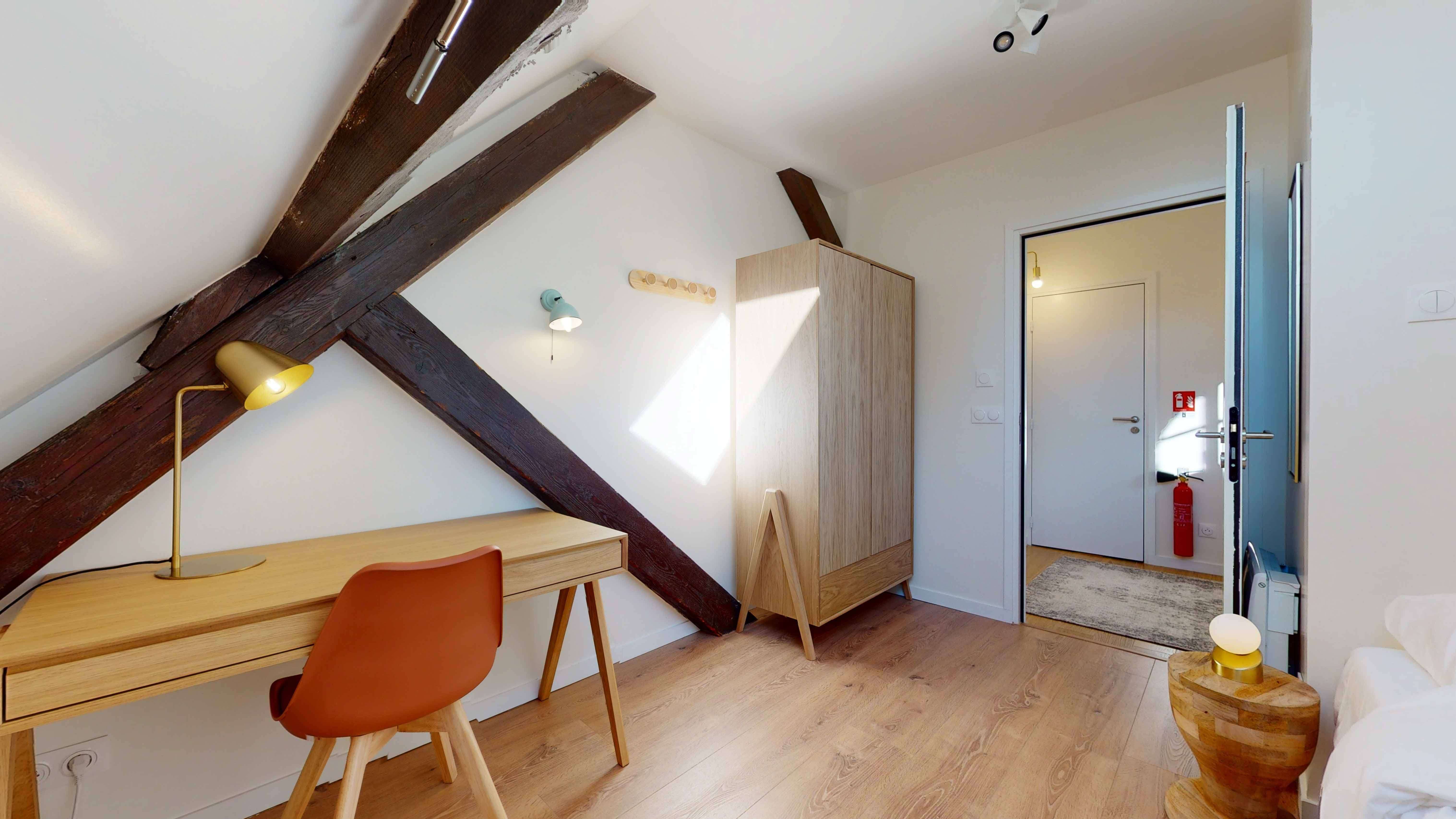 Votre future chambre, située au premier étage, est une unité privée conçue pour une personne. Elle est meublée d'un lit double avec literie de qualité et rangements intégrés, d'une armoire spacieuse, d'un bureau accompagné d'une chaise confortable et d'une lampe de bureau pour vos sessions de travail ou de lecture. La salle de bain est partagée avec un autre locataire et comprend une douche moderne.