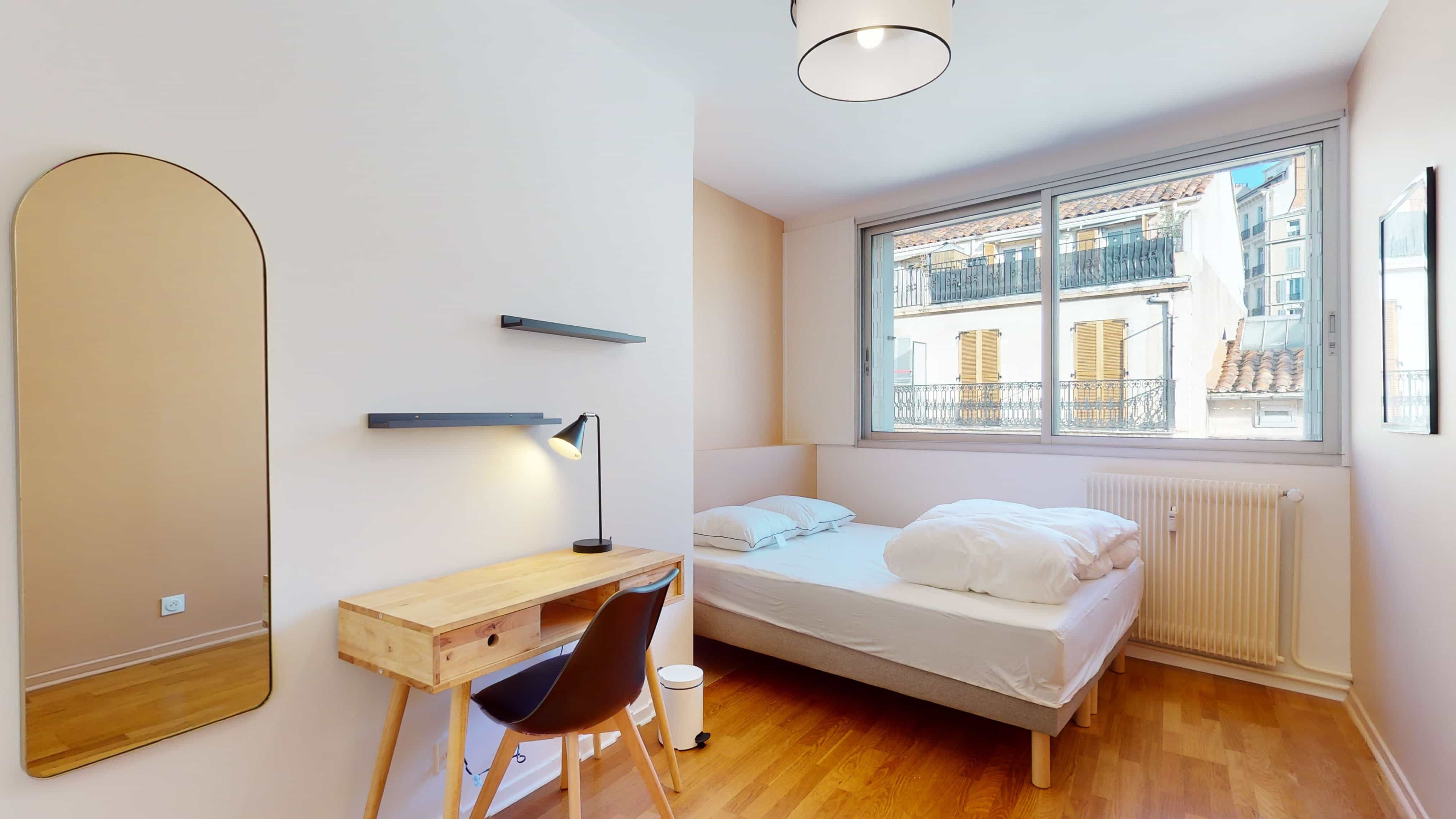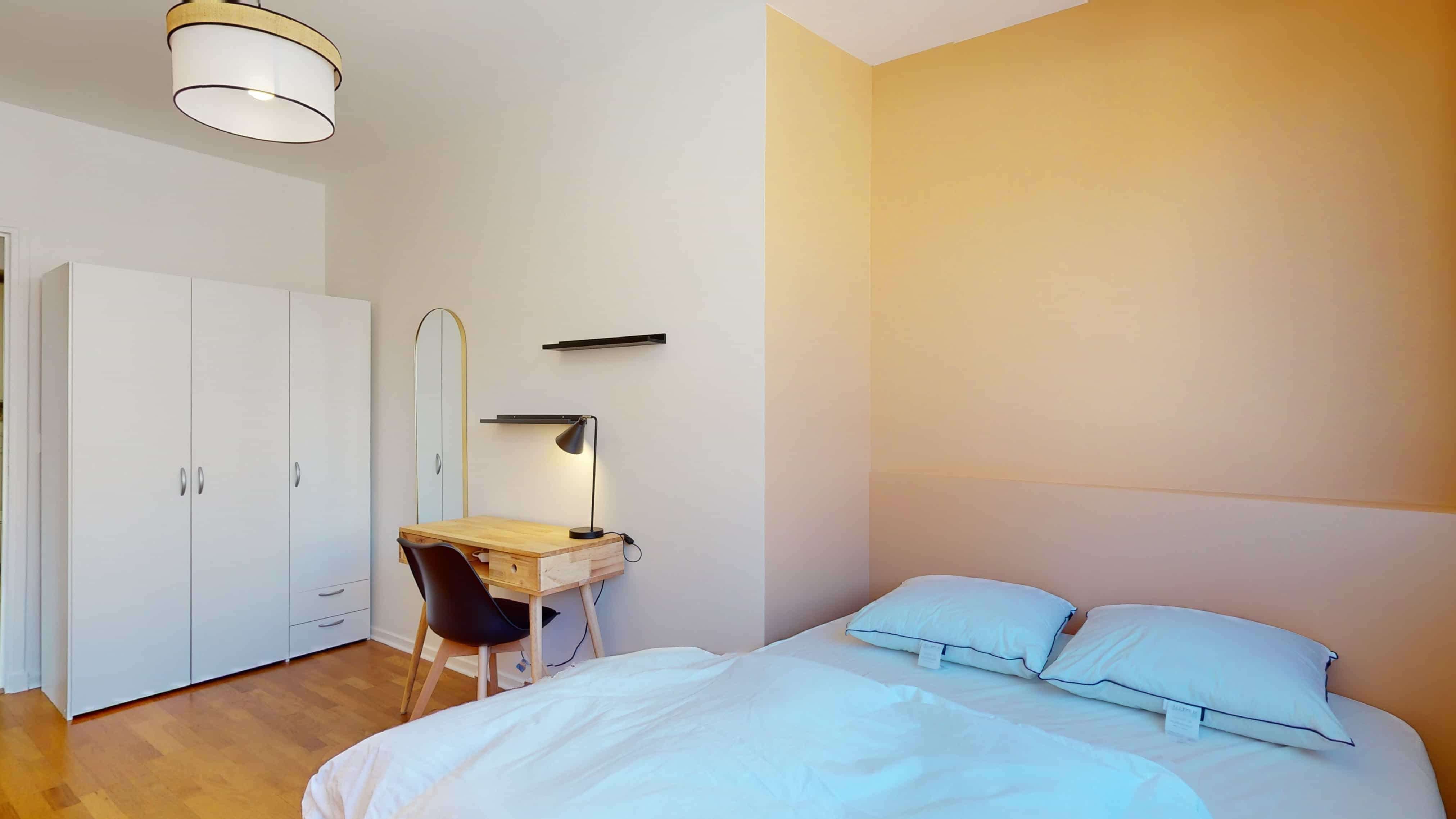 La chambre Room 4 est parfaite pour une personne. Elle a tout ce qu'il faut : un lit double confortable, une armoire où ranger vos affaires, un bureau et une chaise pour travailler ou étudier, et elle partage une salle de bain propre avec douche et toilettes avec d'autres colocataires. Sa superficie est de 15 m², ce qui donne assez d'espace pour vivre confortablement.